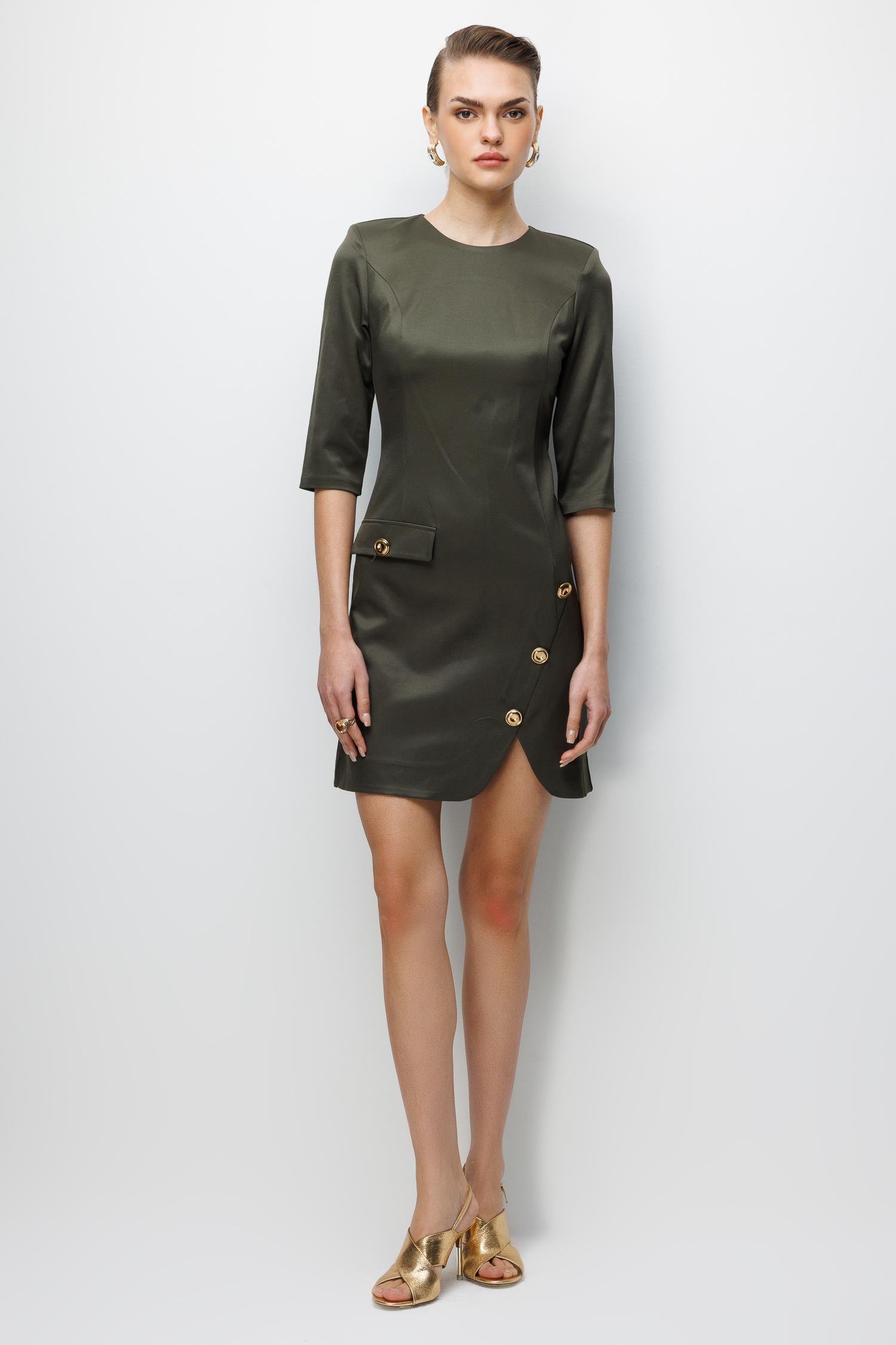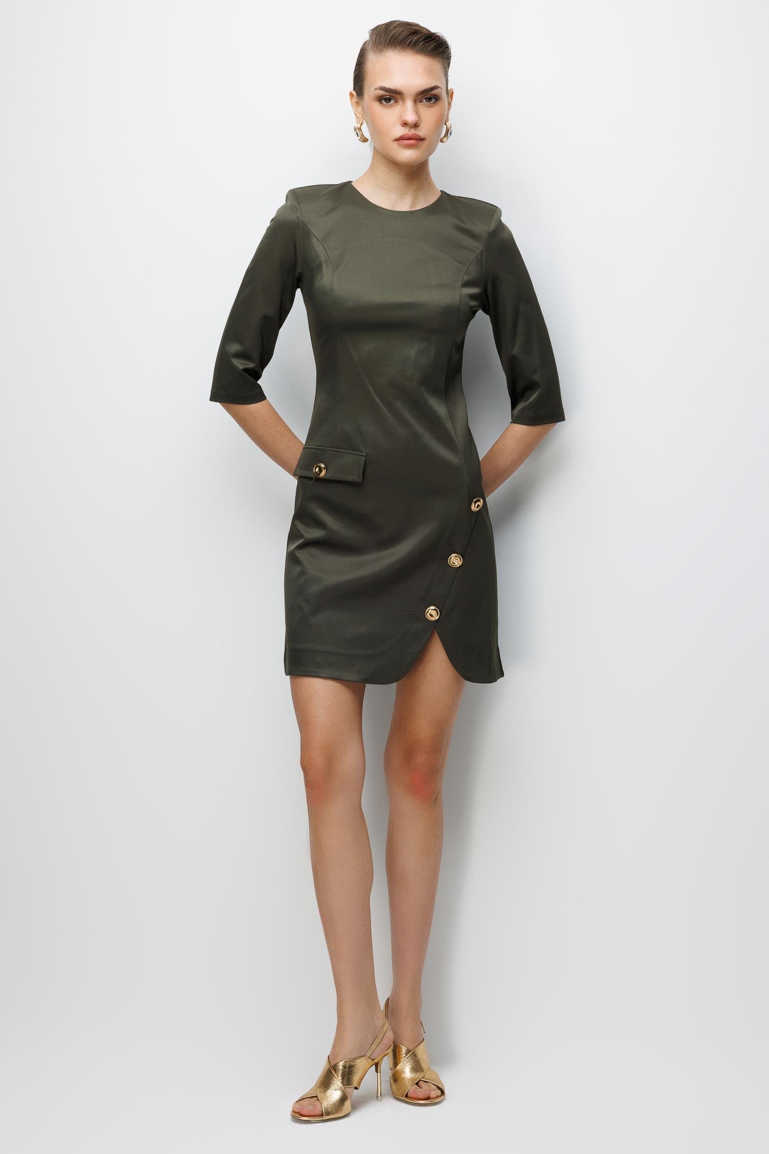 Mini boy kesimi dinamik bir enerji verirken, elbisenin asıl karakteri Eteğindeki Aksesuar Detayında gizlidir. Bu özenle yerleştirilmiş detay, eteğin dökümünü zenginleştirir ve elbiseye bir mücevher etkisi katar. Bu aksesuar, bel bölgesinden aşağıya doğru inen kesimi vurgulayarak vücut hatlarını ideal bir şekilde şekillendirir.