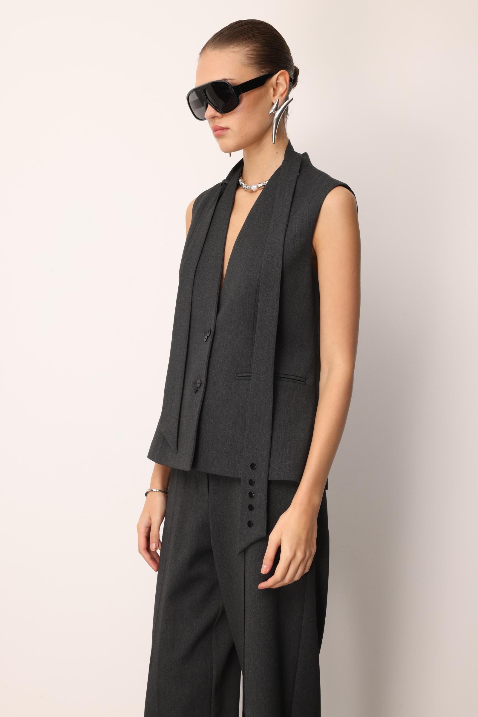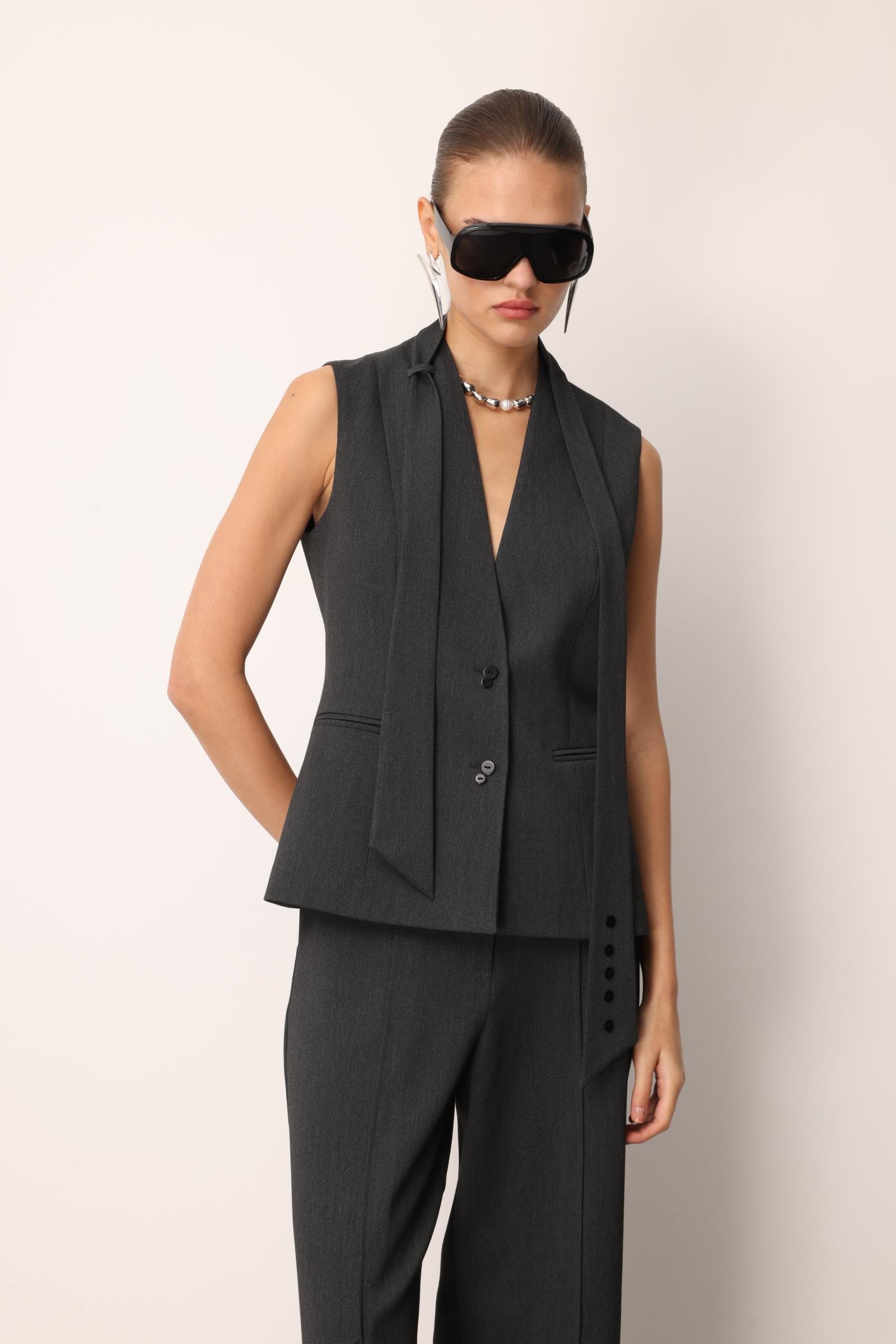 Profesyonel gardırobunuzun en dinamik parçası. Bu V yaka yelek, klasik kesimine eklenen uzun kuşak detayı sayesinde bağlama stiliyle görünümünüze kişisel ve güçlü bir dokunuş katıyor. Siyah-gri melanj rengi ve tok kumaş yapısıyla hem yazlık hem de kışlık ofis kombinleriniz için ideal.