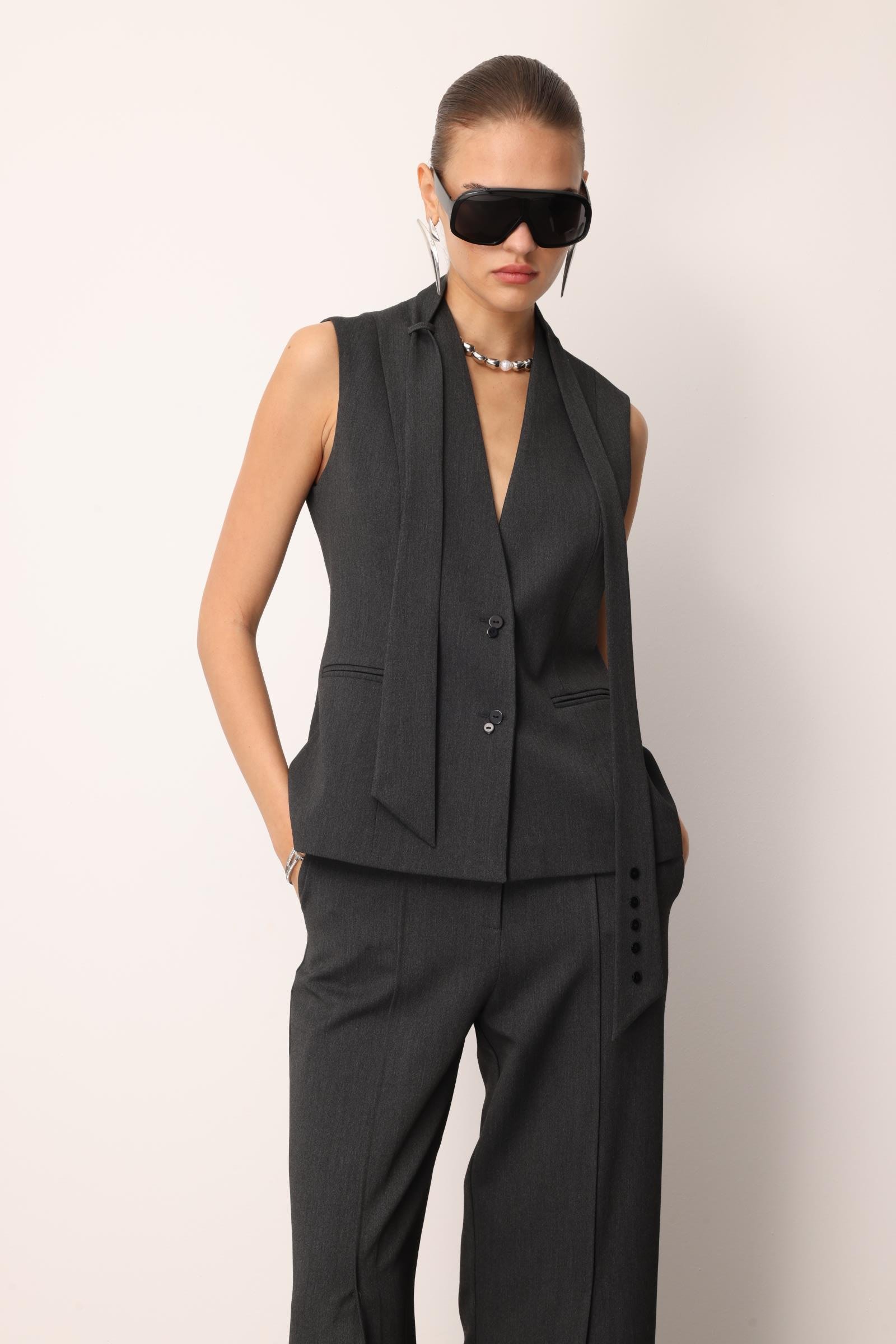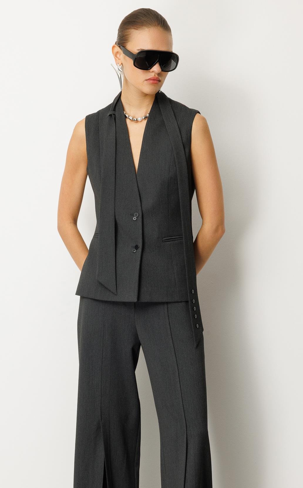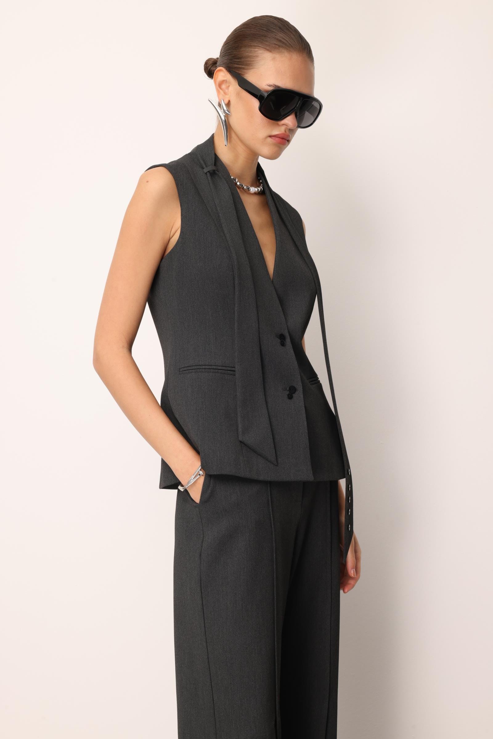 Bu yeleği, görseldeki gibi aynı kumaştan yapılmış geniş paça pantolonlarla kombinleyerek havalı bir üç parçalı takım (ceket/blazer olmadan) görünümü yakalayın. İçine basic bir body veya ipek bir bluz giyebilir, ya da yaz aylarında tek başına kullanabilirsiniz. Kolsuz yapısı sayesinde ceketlerin içine katman olarak da giyilebilir.