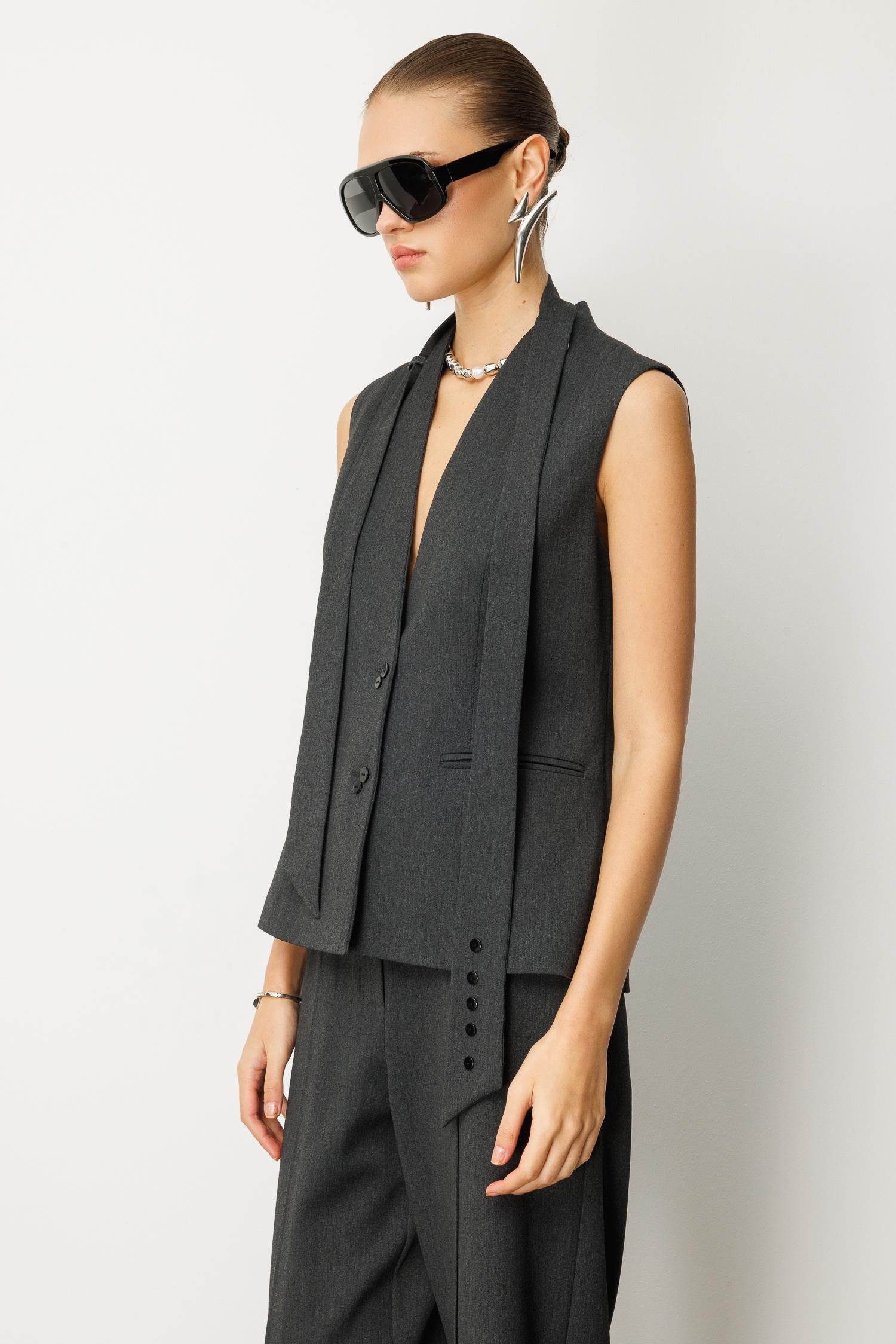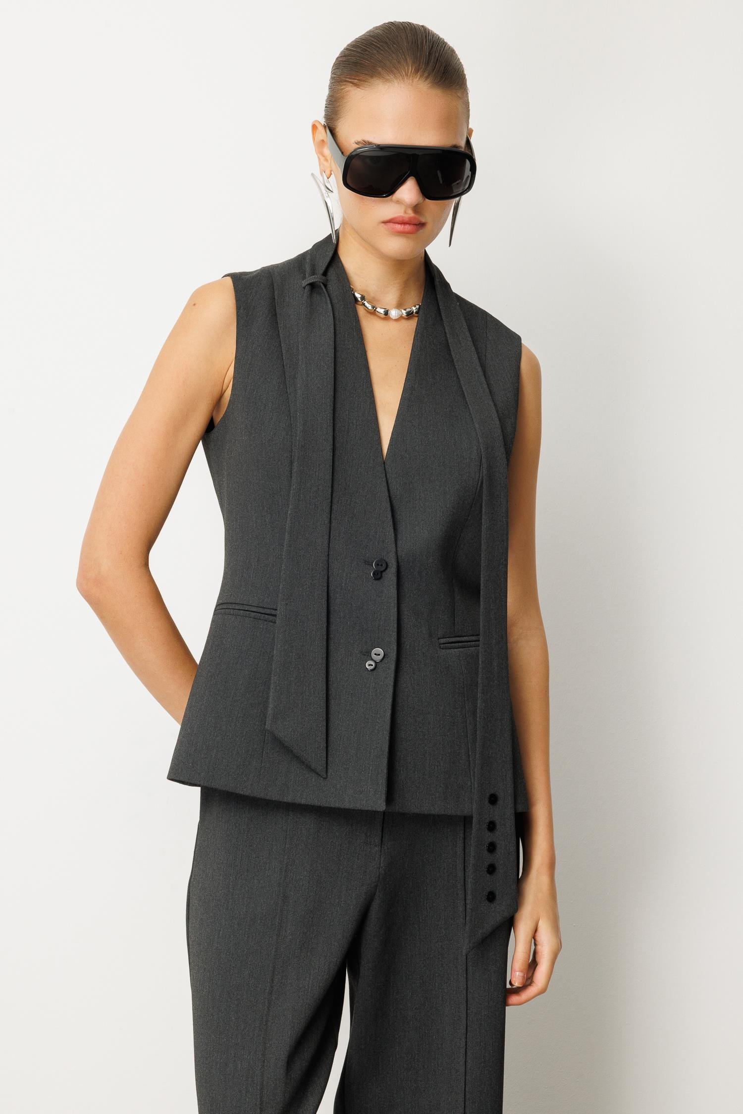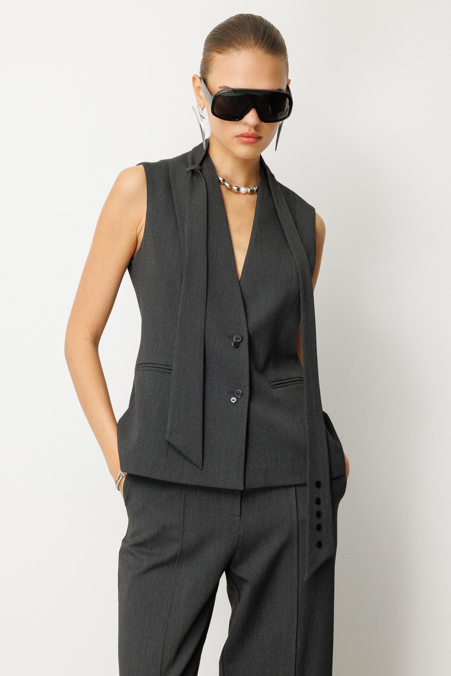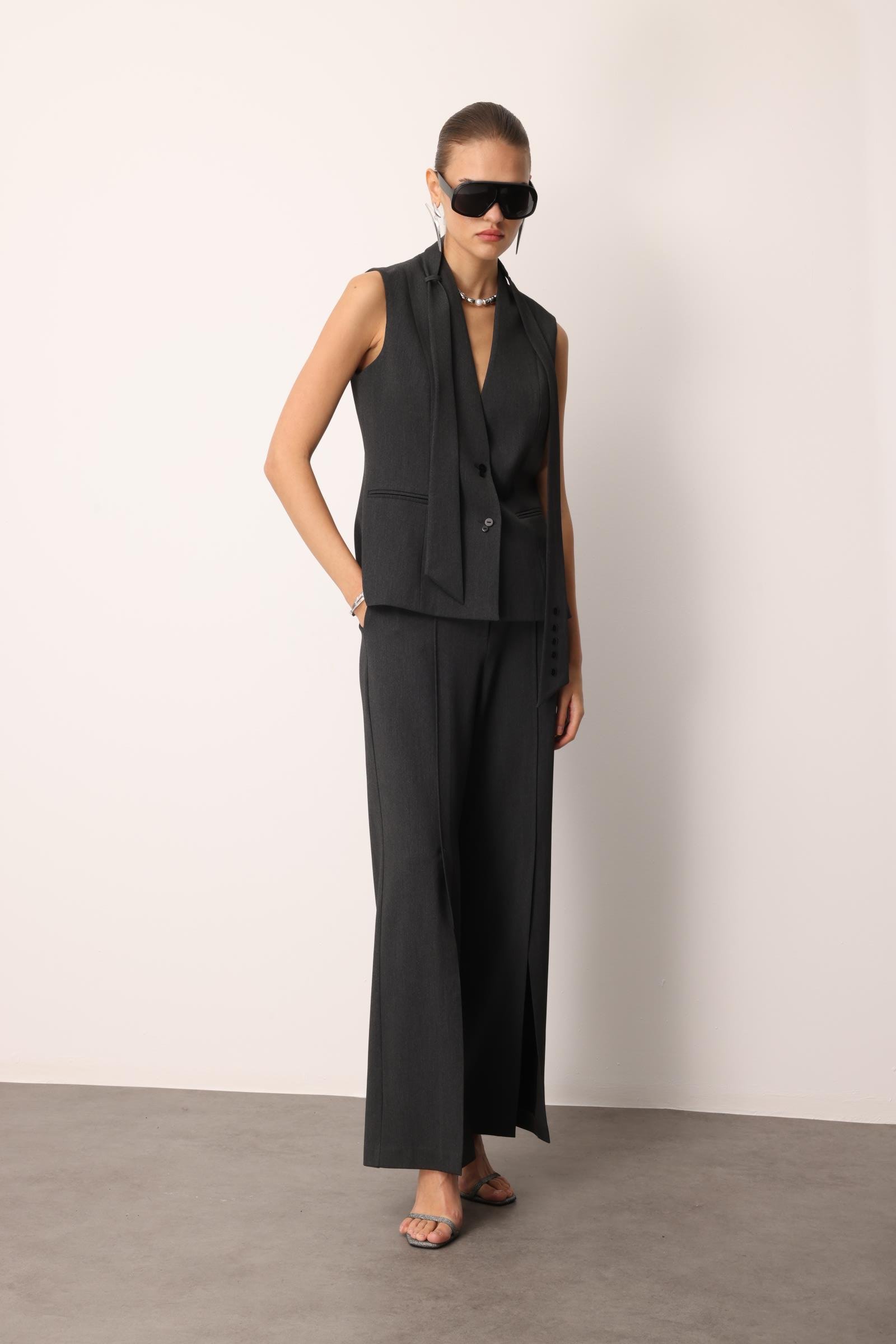 Bu yeleği, görseldeki gibi aynı kumaştan yapılmış geniş paça pantolonlarla kombinleyerek havalı bir üç parçalı takım (ceket/blazer olmadan) görünümü yakalayın. İçine basic bir body veya ipek bir bluz giyebilir, ya da yaz aylarında tek başına kullanabilirsiniz. Kolsuz yapısı sayesinde ceketlerin içine katman olarak da giyilebilir.