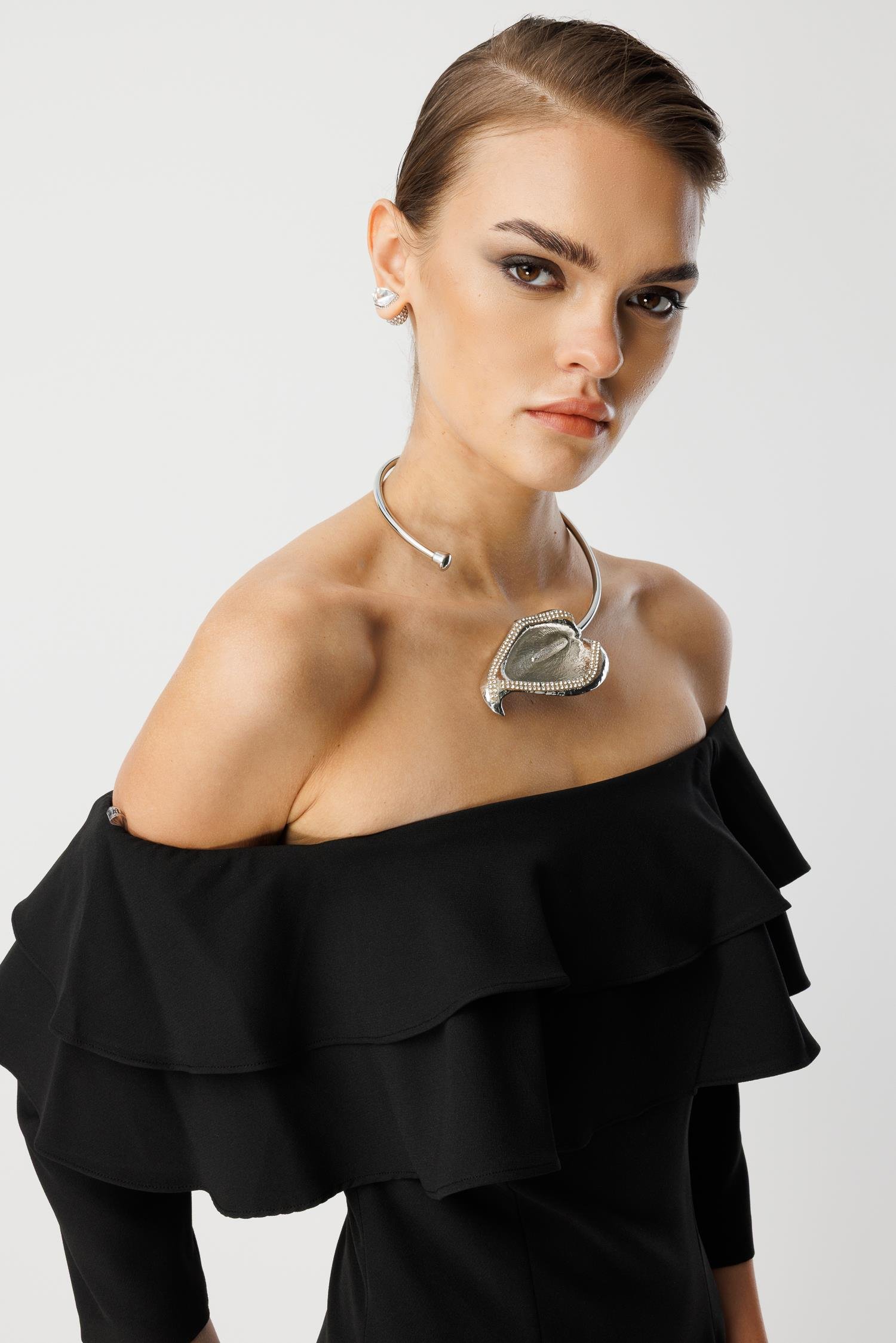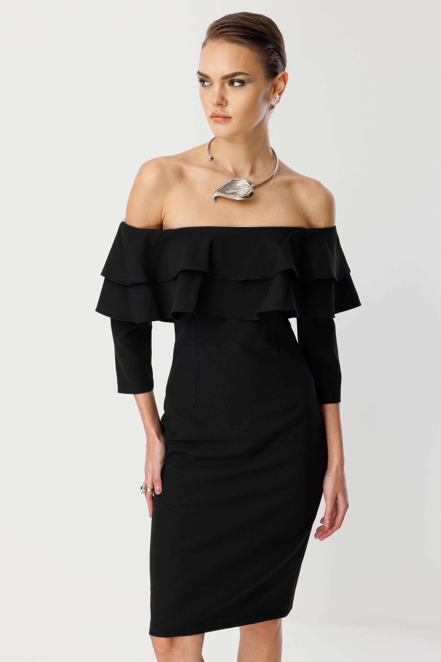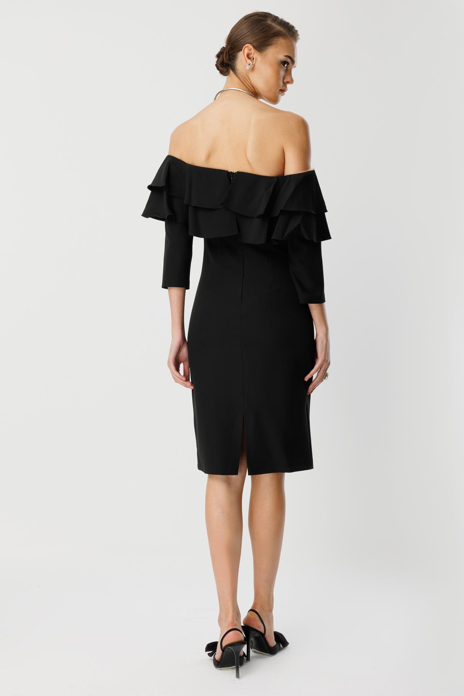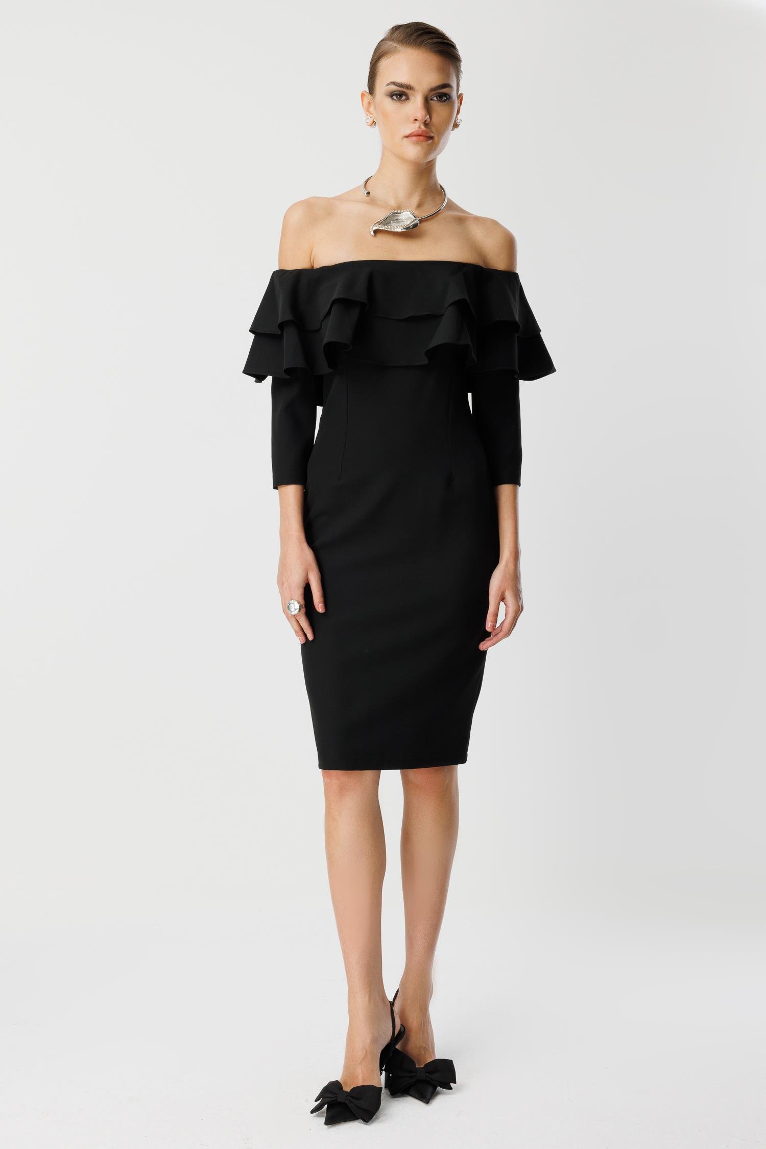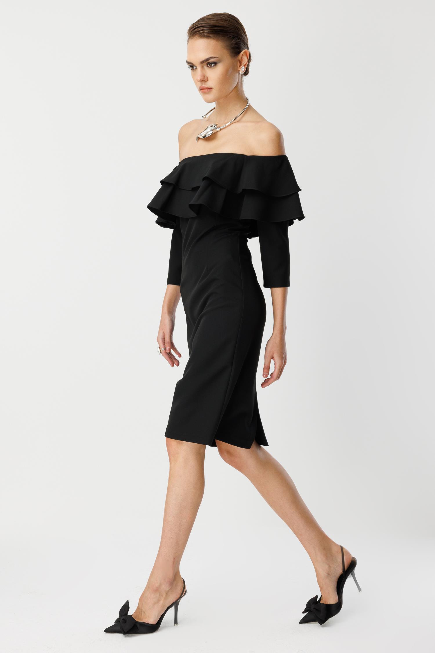 Şık davetler, kokteyller ve resmi akşam yemekleri için tasarlanmış, klasik ve zarif bir model. Siyahın asil duruşu, omuzları açıkta bırakan tasarımı ve kat kat fırfır detaylarıyla birleşerek size sofistike bir çekicilik katıyor.