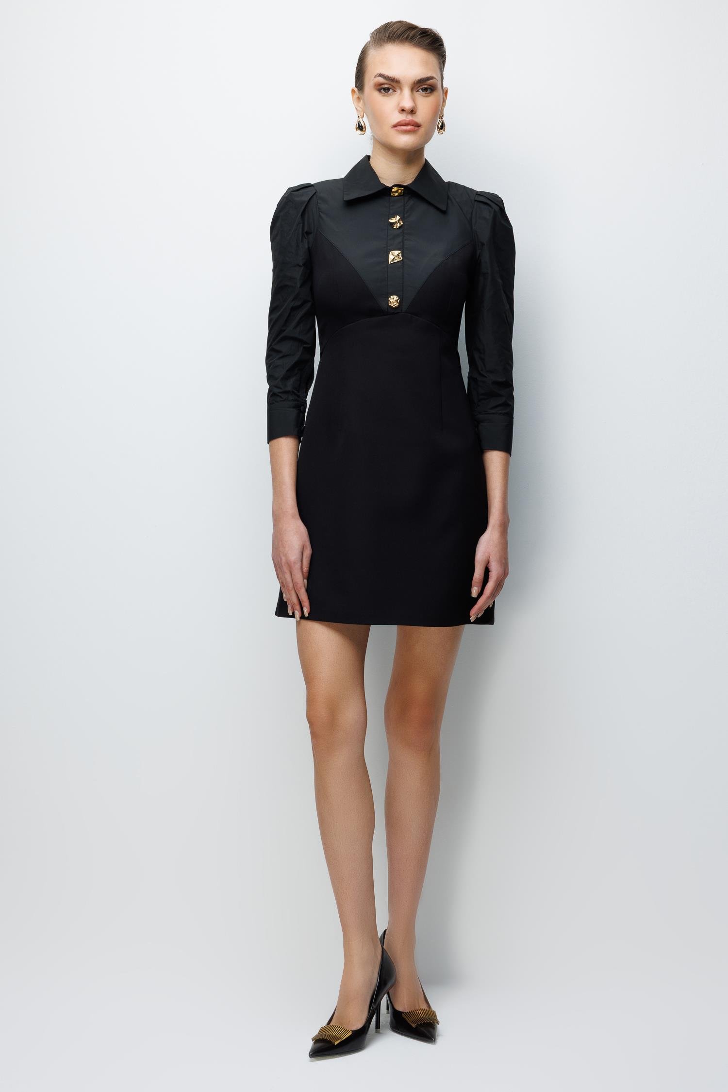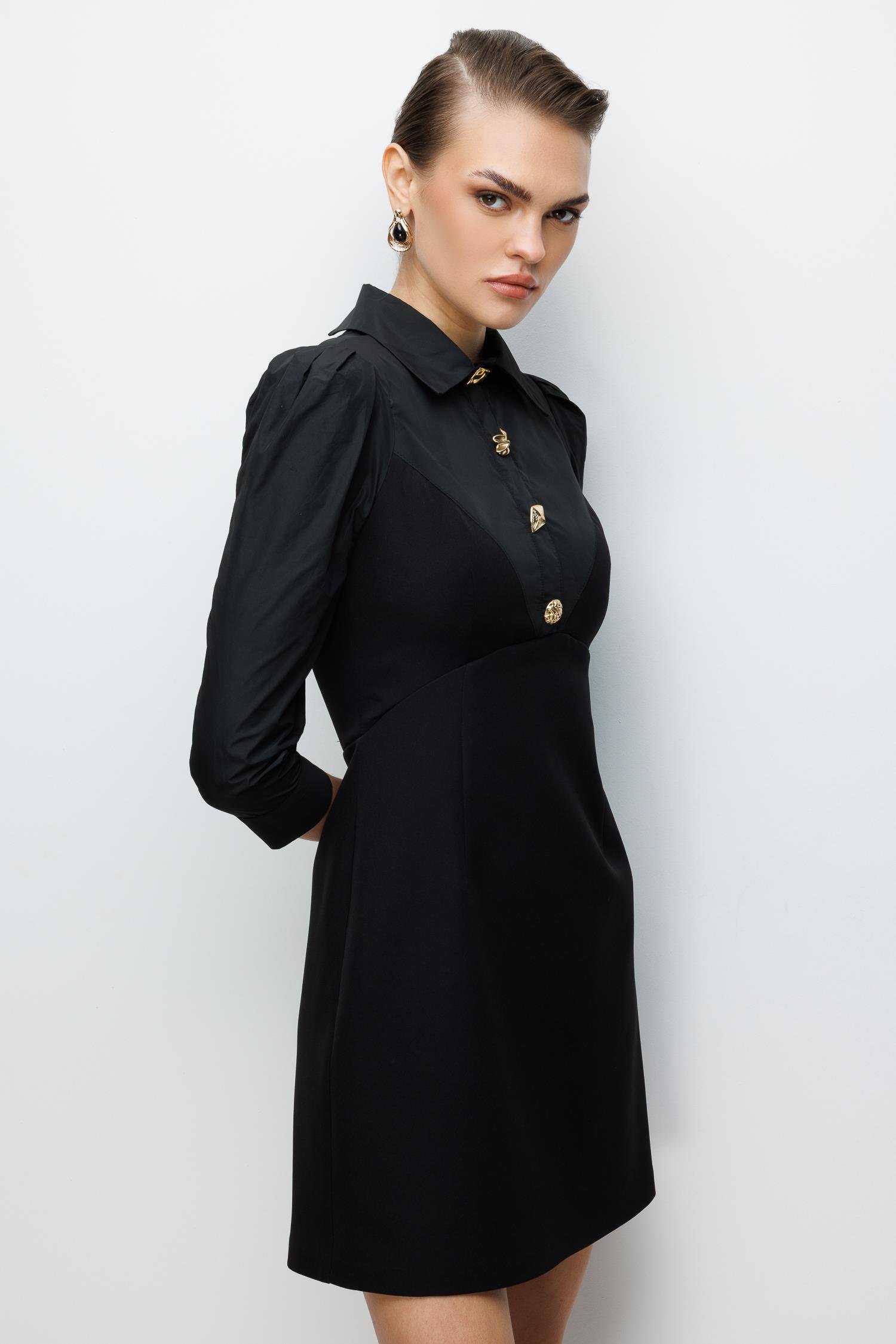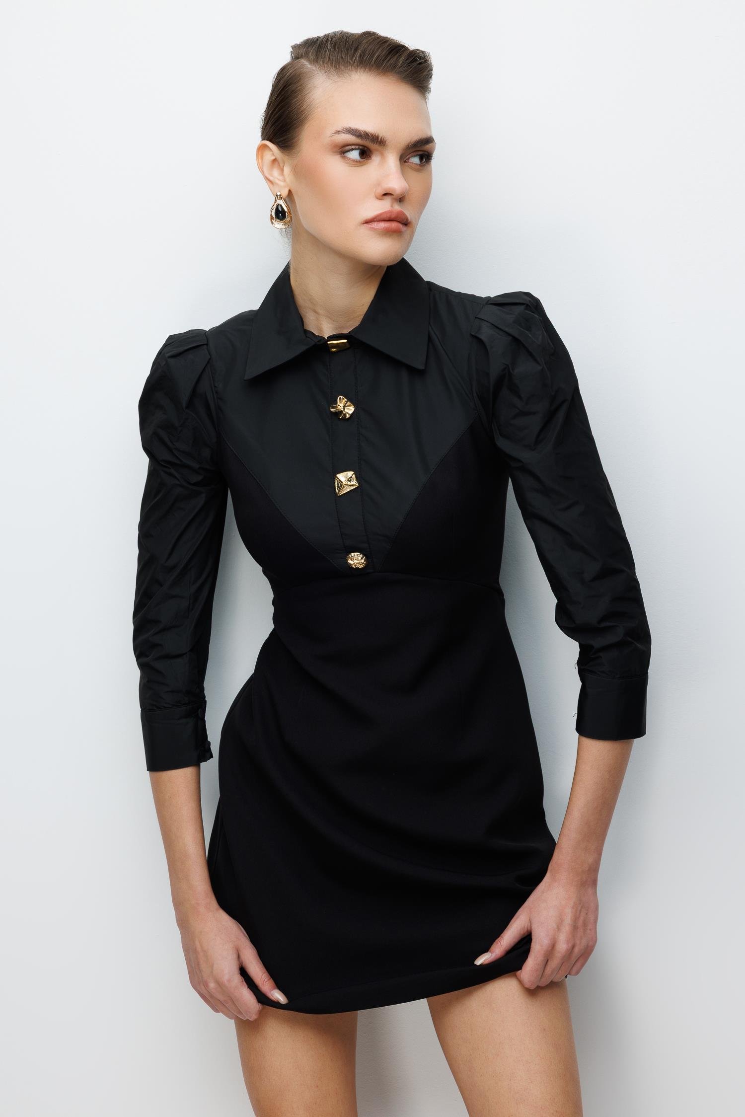 Bu Nefeli elbisesi, modern kadının hem profesyonel hem de feminen gücünü tek bir parçada birleştiriyor. Siyah rengin zamansız cazibesi, Mini boy kesimiyle dinamik bir duruş kazanırken; tasarımın ana odak noktası Gömlek Yaka ve Vatka Detayları'dır.