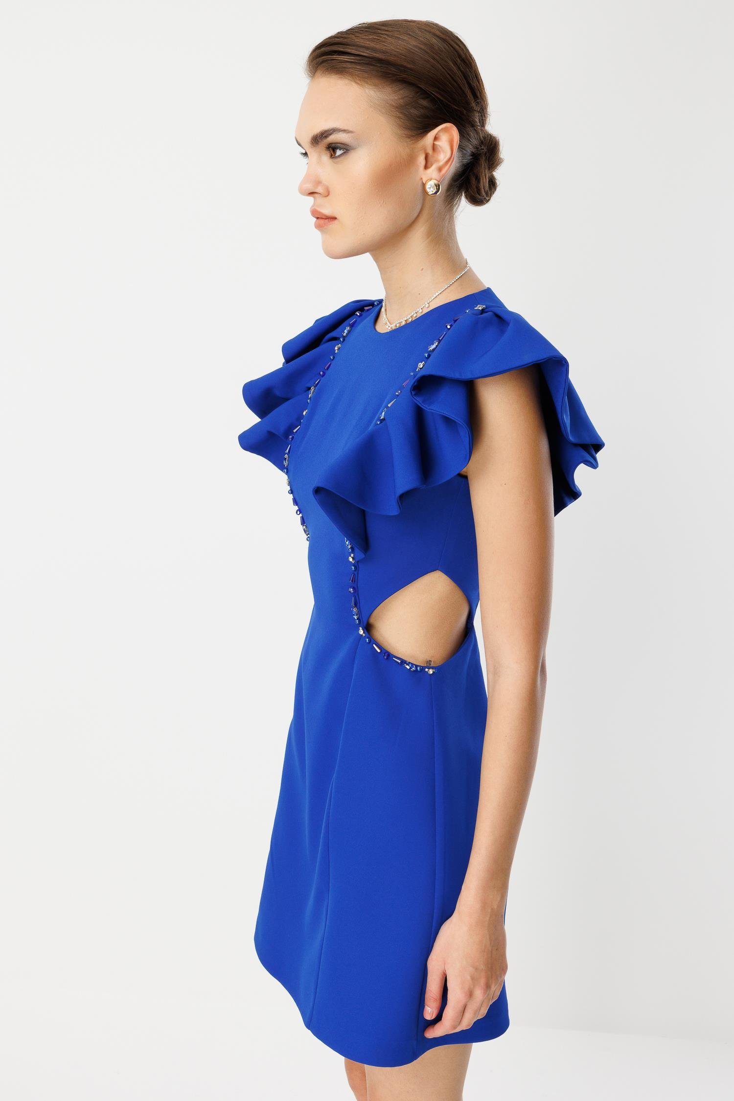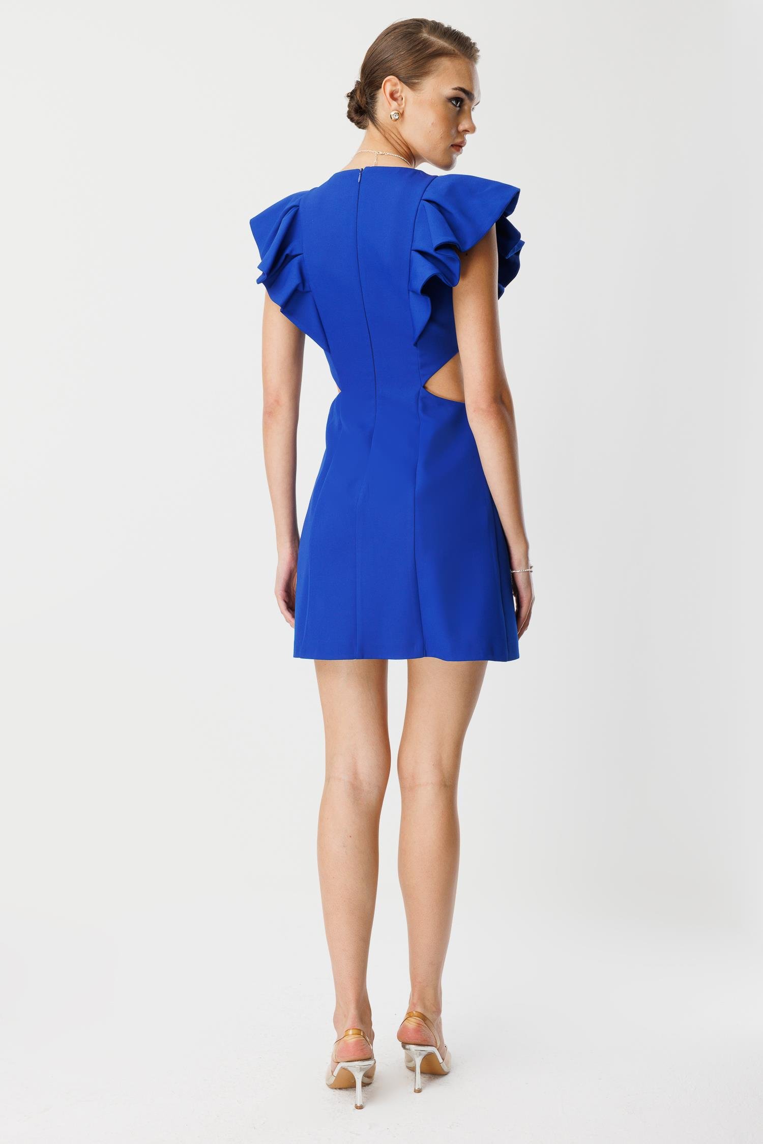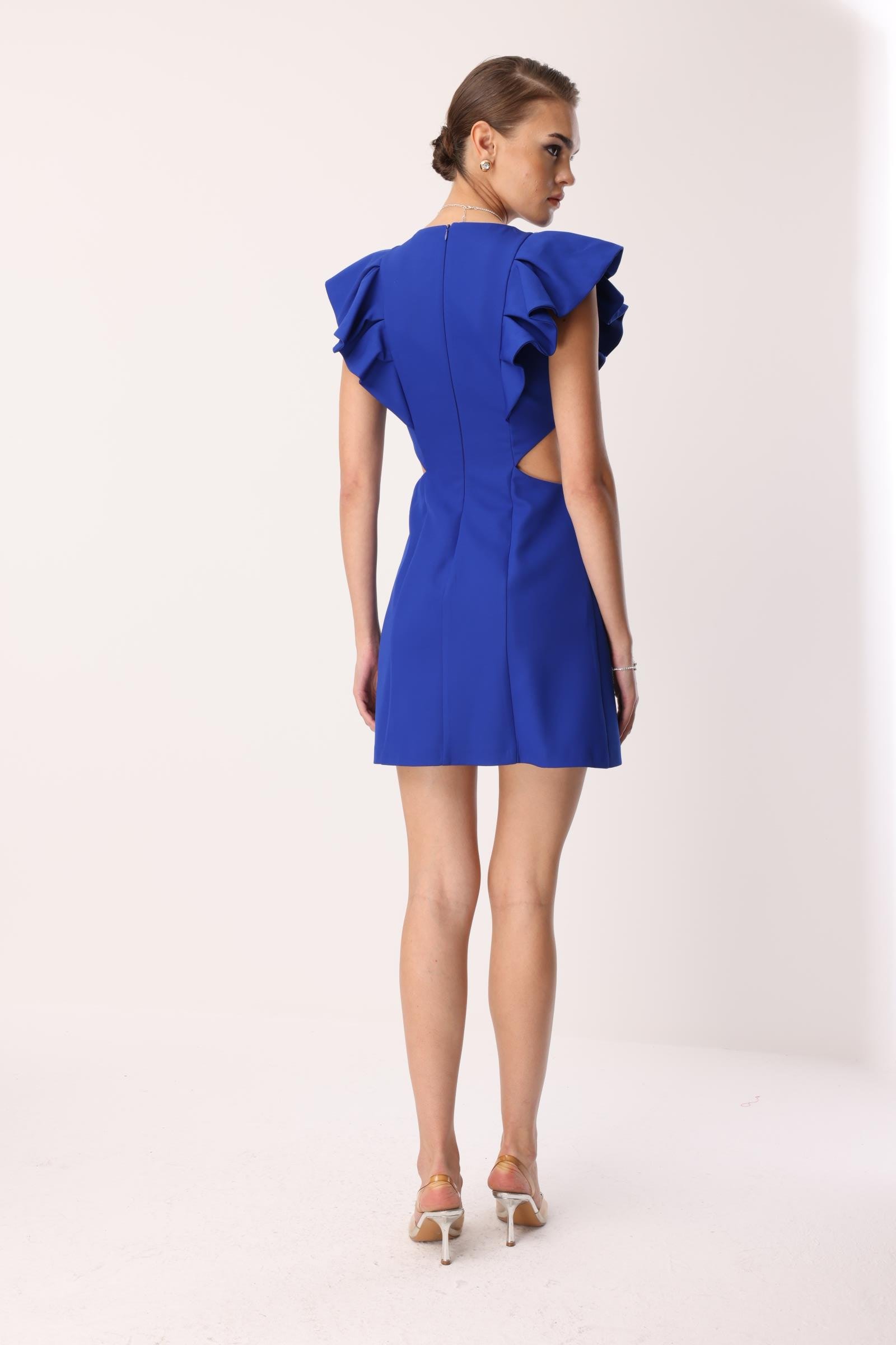 Enerjik partiler, yaz davetleri ve dikkat çekmek istediğiniz tüm özel etkinlikler için tasarlanmış, modern ve iddialı bir mini elbise. Saks mavisinin canlılığı, yanlardaki cesur dekolteler ve hacimli omuz detaylarıyla birleşerek size dinamik ve unutulmaz bir görünüm kazandırır.