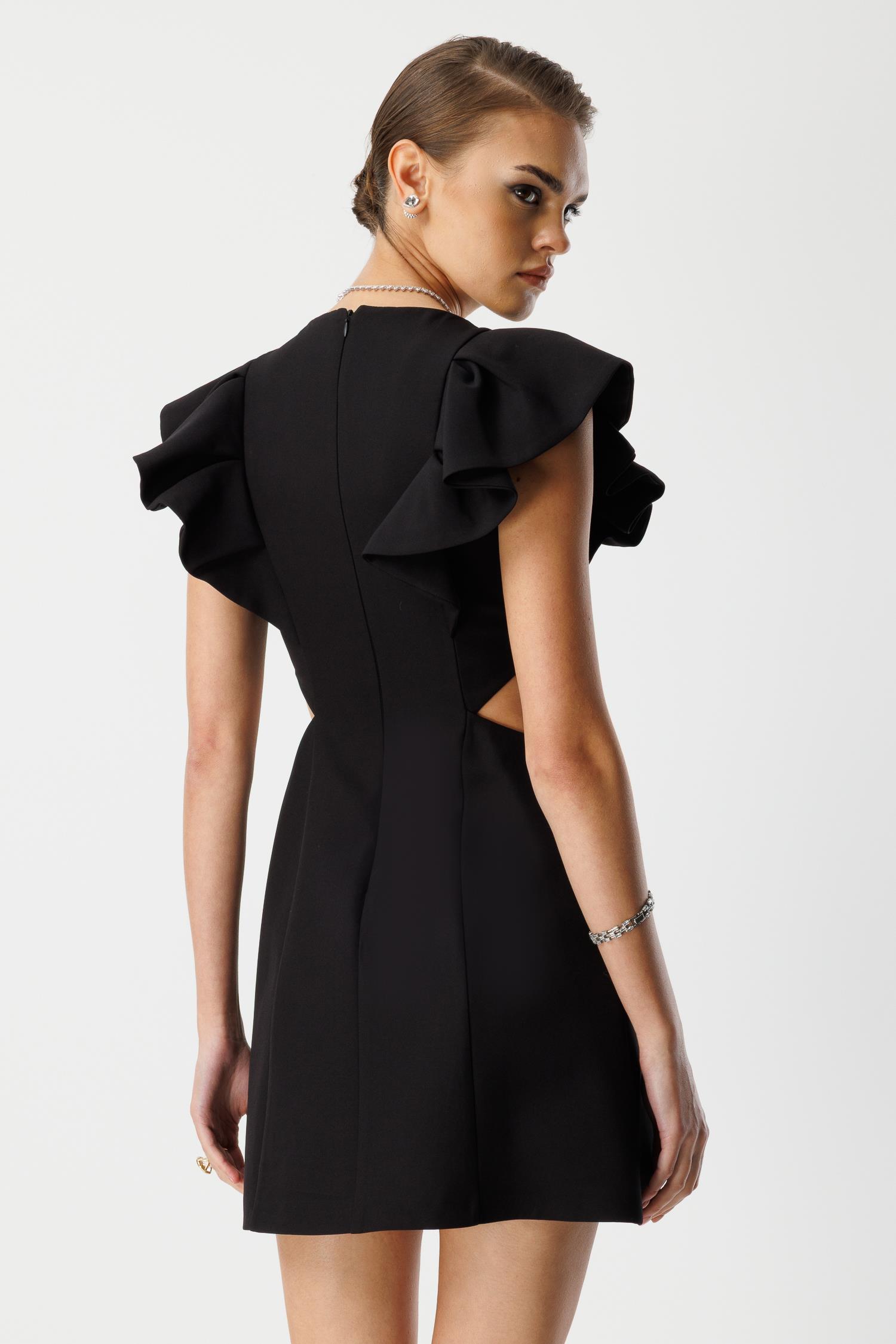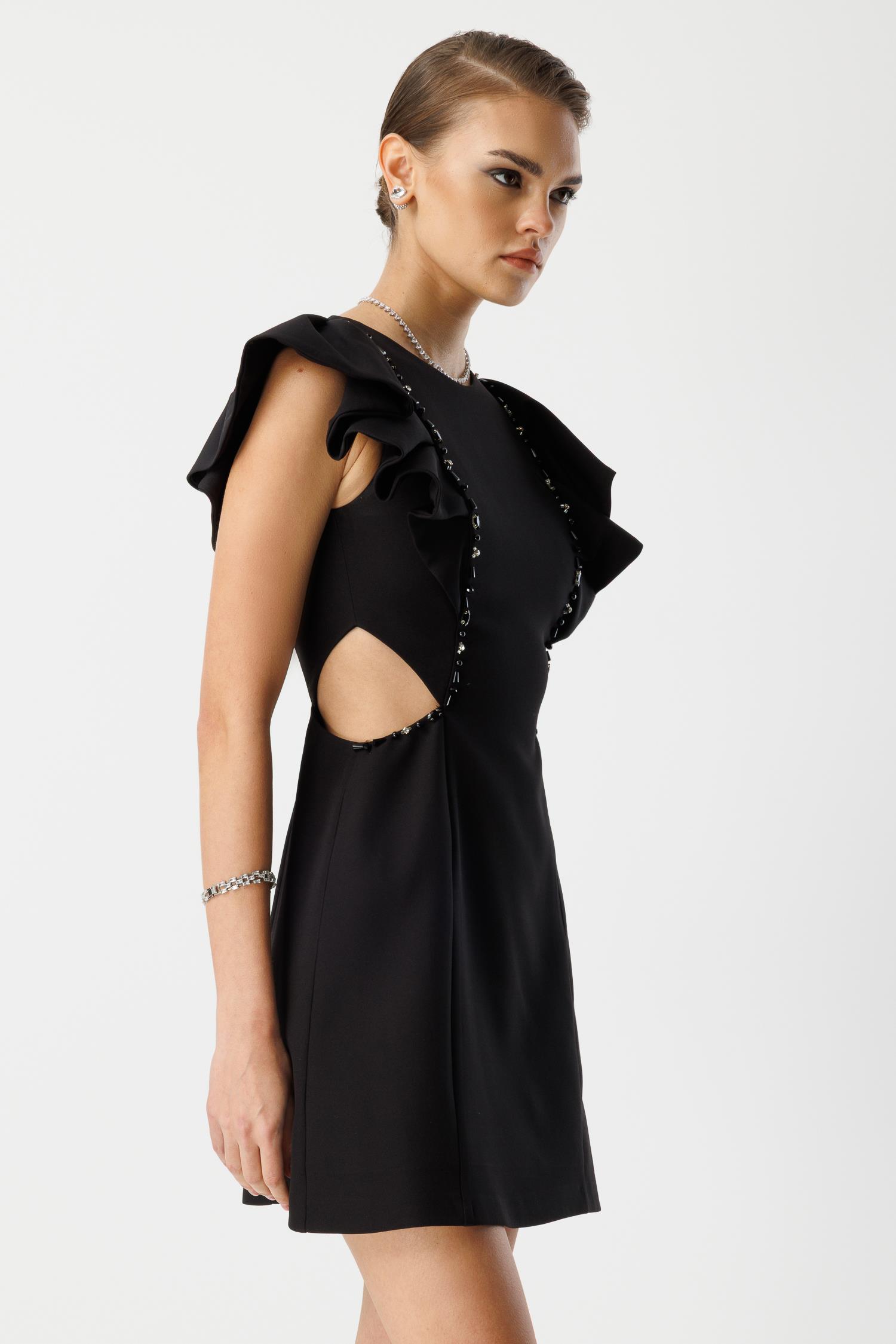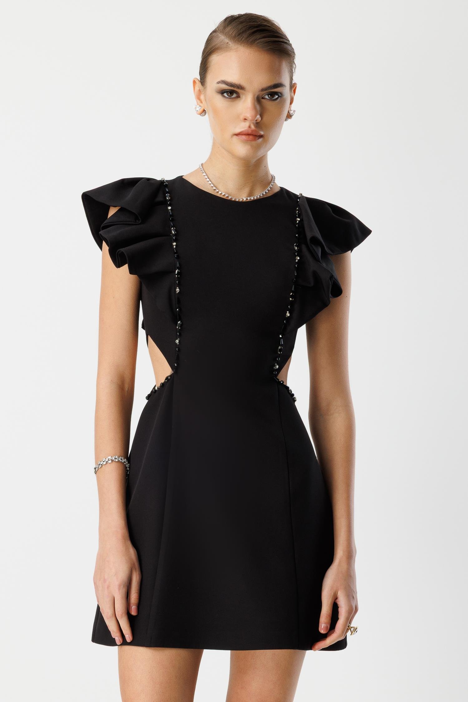 Enerjik partiler, gece davetleri ve cesur şıklığı sevenler için tasarlanmış, iddialı ve modern bir mini elbise. Asil siyahın gücü, yanlardaki cesur dekolteler ve hacimli omuz detaylarıyla birleşerek size dinamik ve unutulmaz bir görünüm kazandırır.