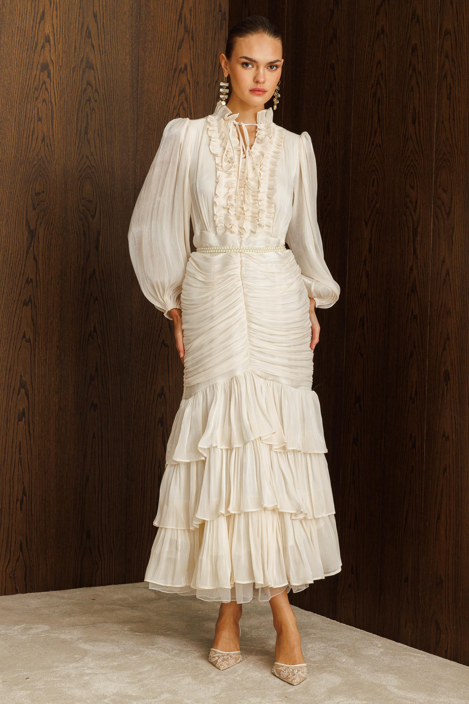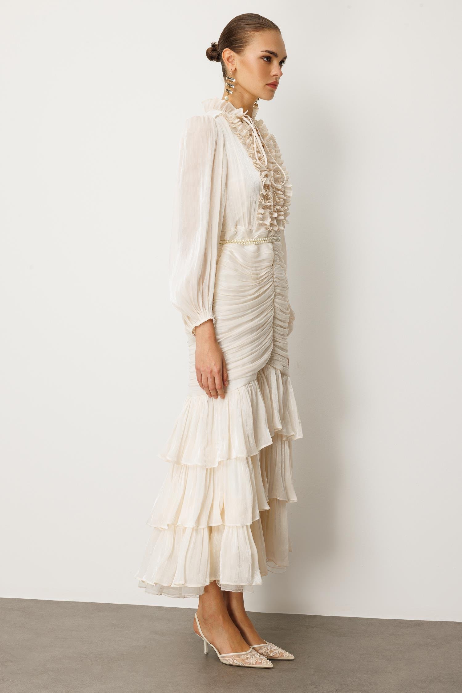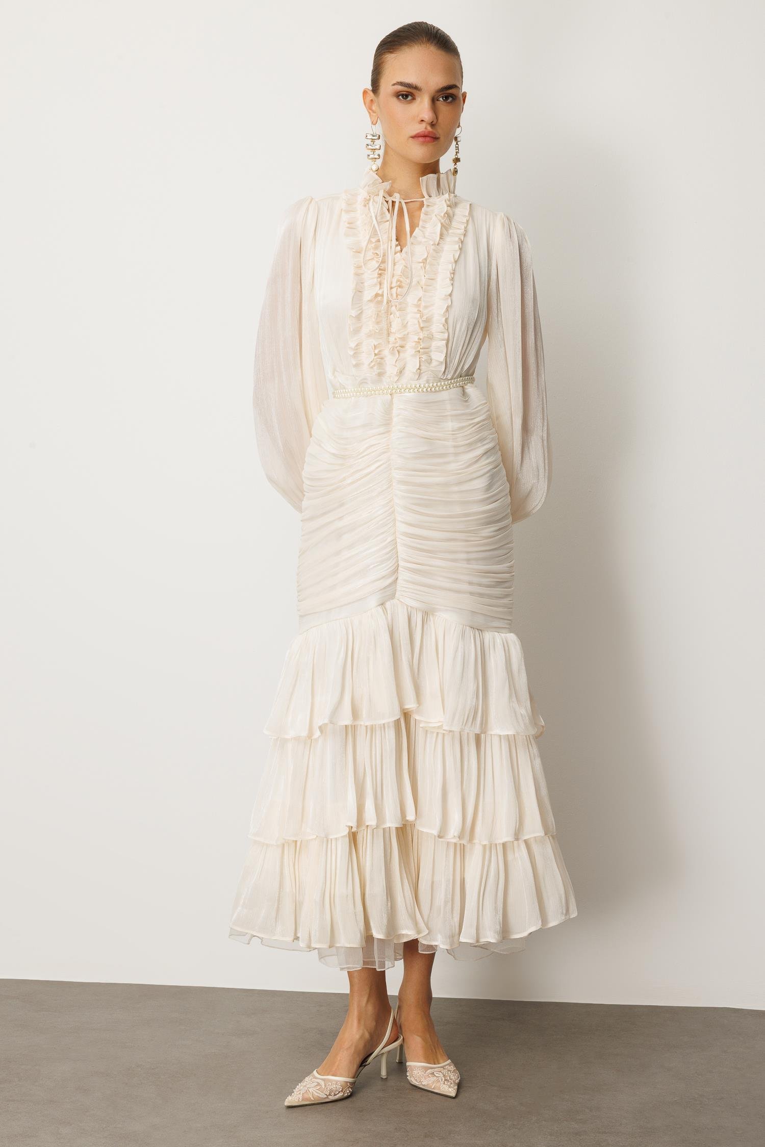 Elbisenin ön kısmındaki zarif detaylar ve uzun kollu tasarımı, şıklığı tamamlıyor. Kat kat inen fırfırlar, elbiseye hareket ve dinamizm katarken, maxi boyu zarafeti ön plana çıkarır. üksek kaliteli kumaşı sayesinde üzerinizde hoş bir duruş sergiler ve gün boyu konforlu bir kullanım sağlar. Arka kısmındaki detaylar, elbiseye özgün bir dokunuş katıyor.