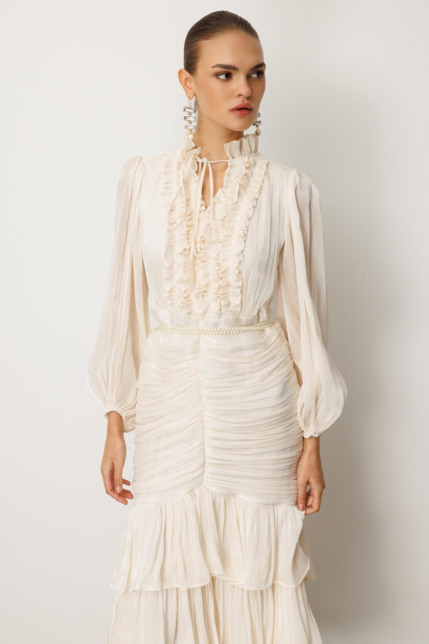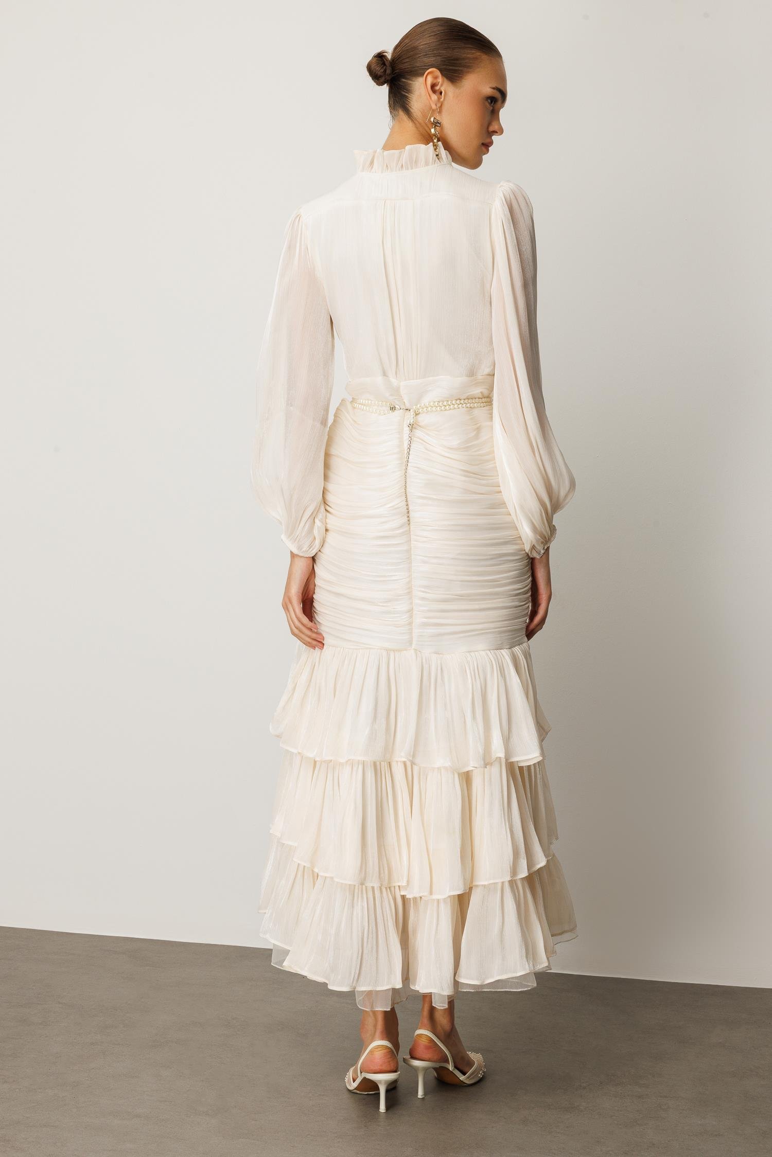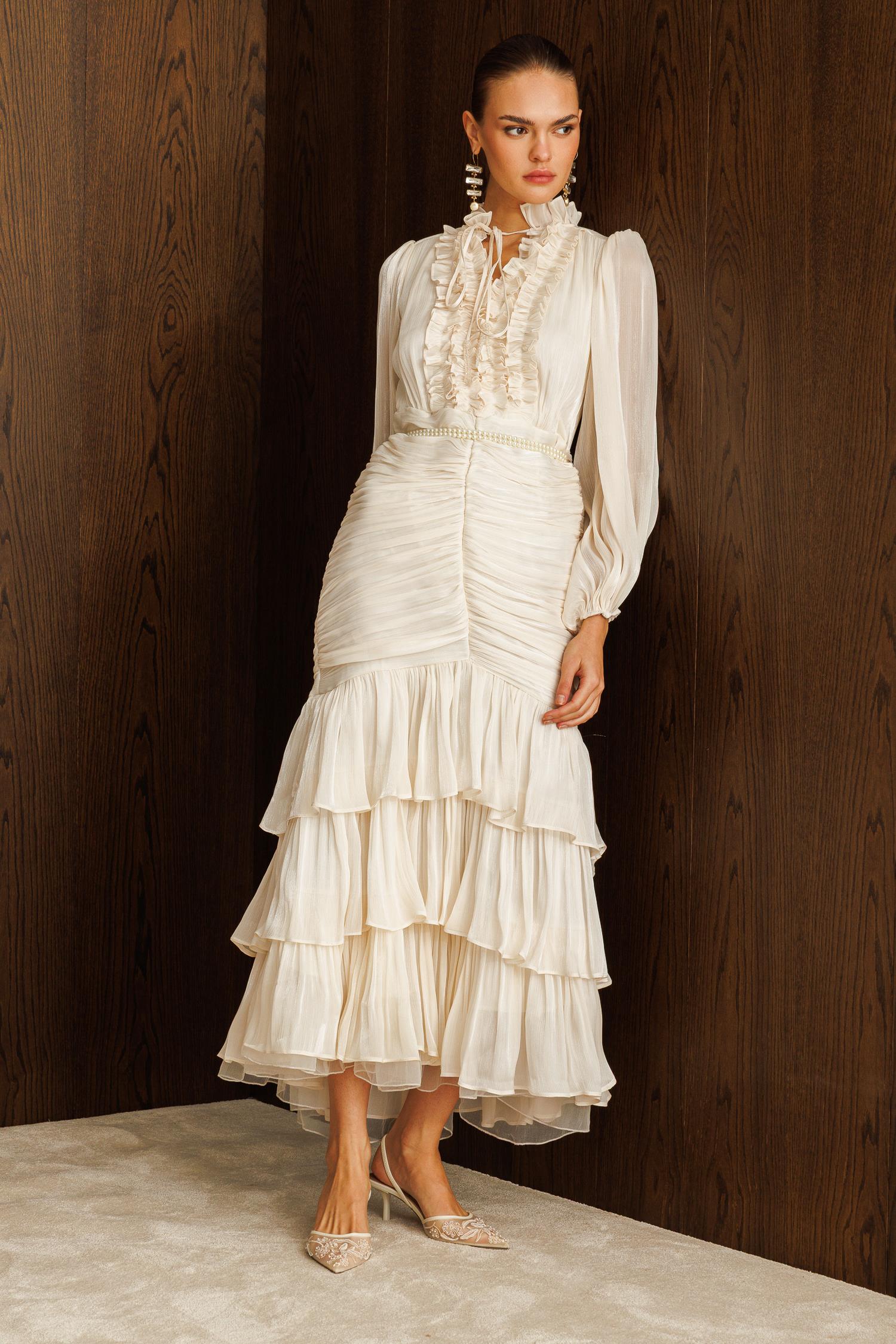 Elbisenin ön kısmındaki zarif detaylar ve uzun kollu tasarımı, şıklığı tamamlıyor. Kat kat inen fırfırlar, elbiseye hareket ve dinamizm katarken, maxi boyu zarafeti ön plana çıkarır. üksek kaliteli kumaşı sayesinde üzerinizde hoş bir duruş sergiler ve gün boyu konforlu bir kullanım sağlar. Arka kısmındaki detaylar, elbiseye özgün bir dokunuş katıyor.