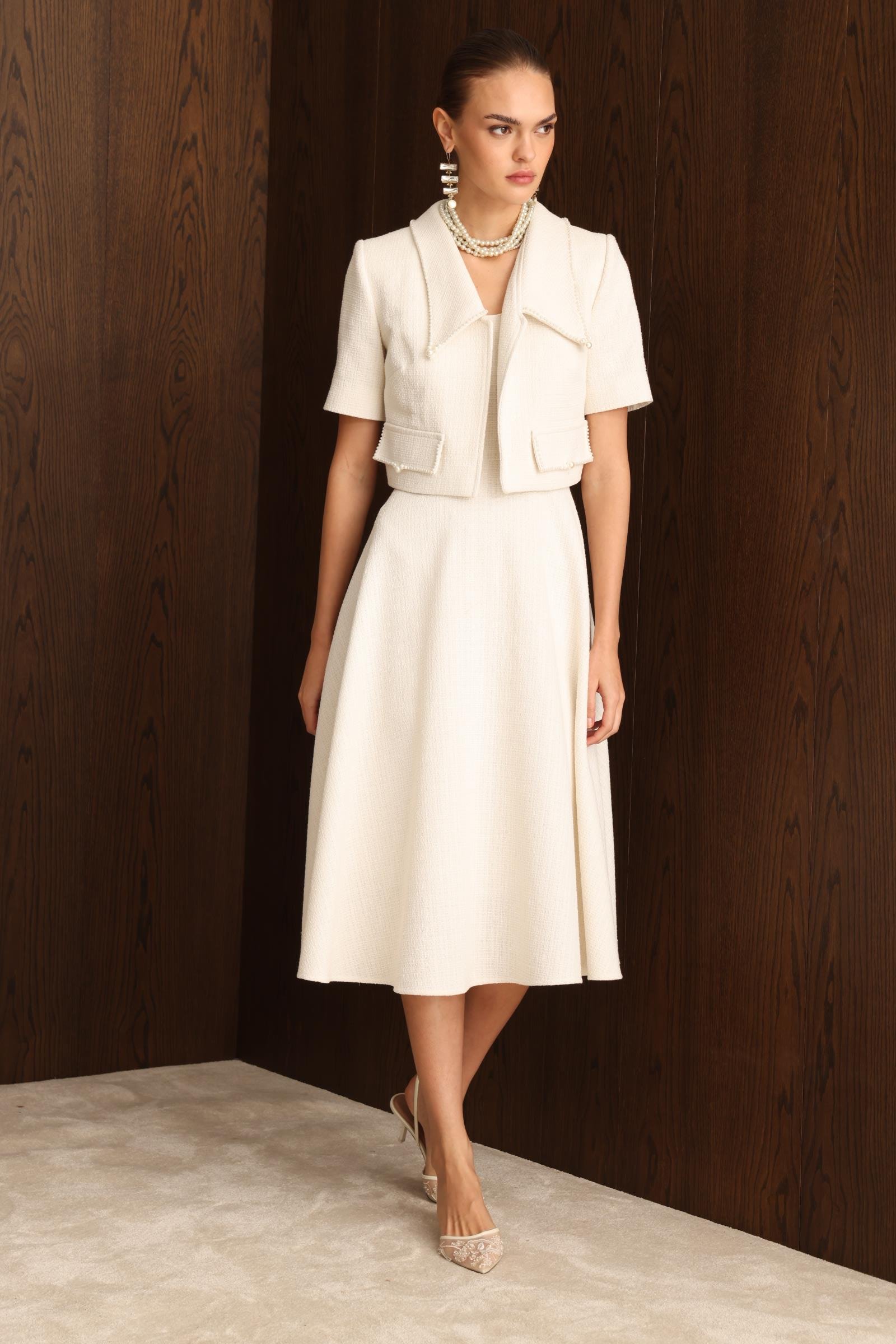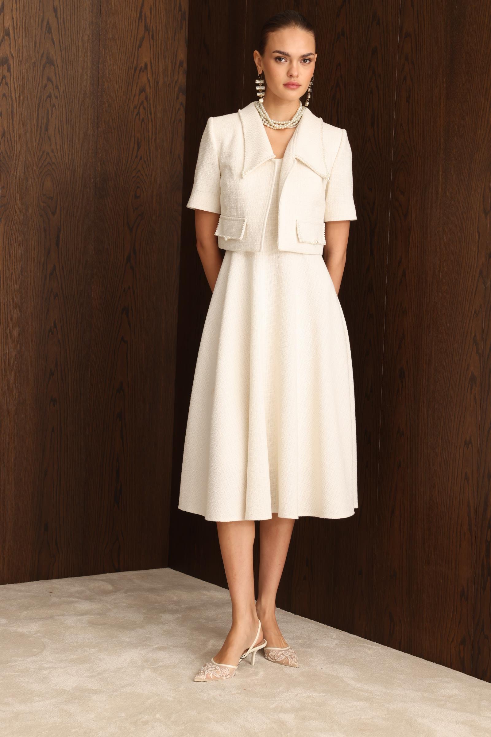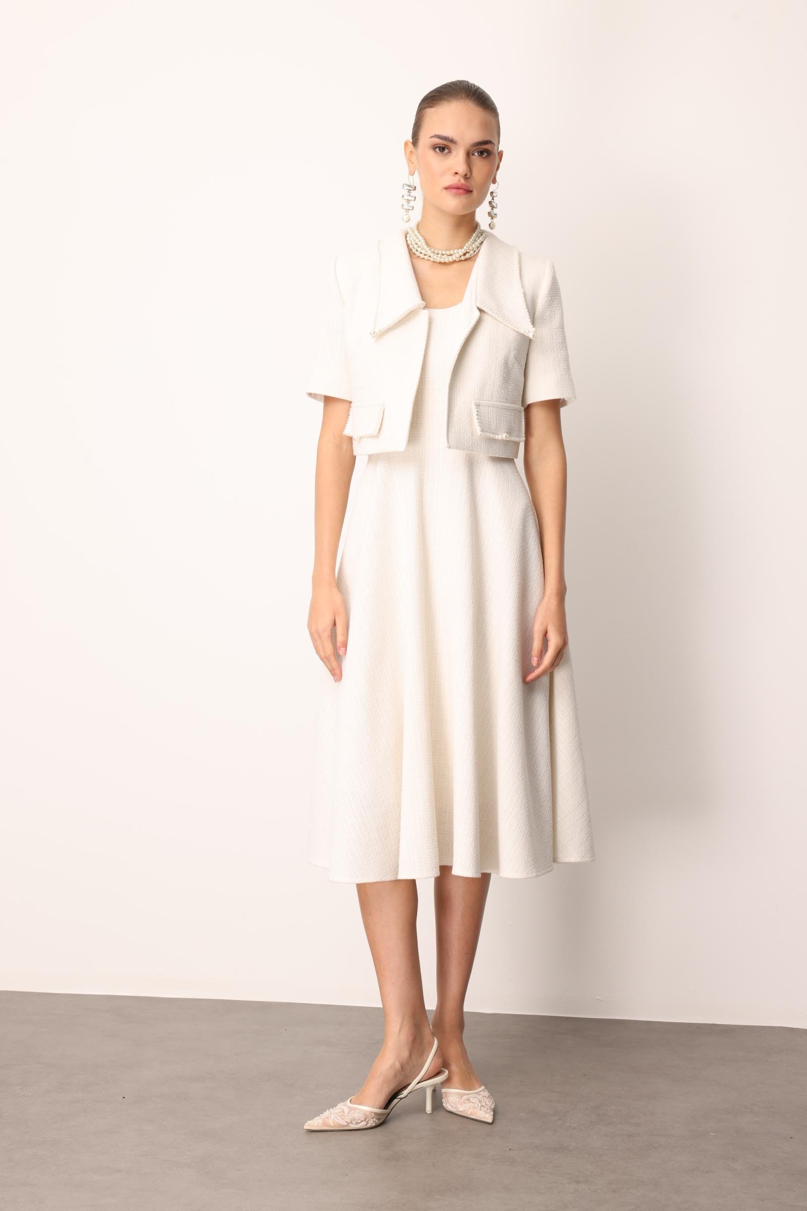 Midi Elbise: A kesim, dökümlü ve midi boy elbise, vücuda zarifçe oturur. Minimalist tasarımı, ceketin ve aksesuarların ön plana çıkmasını sağlar.