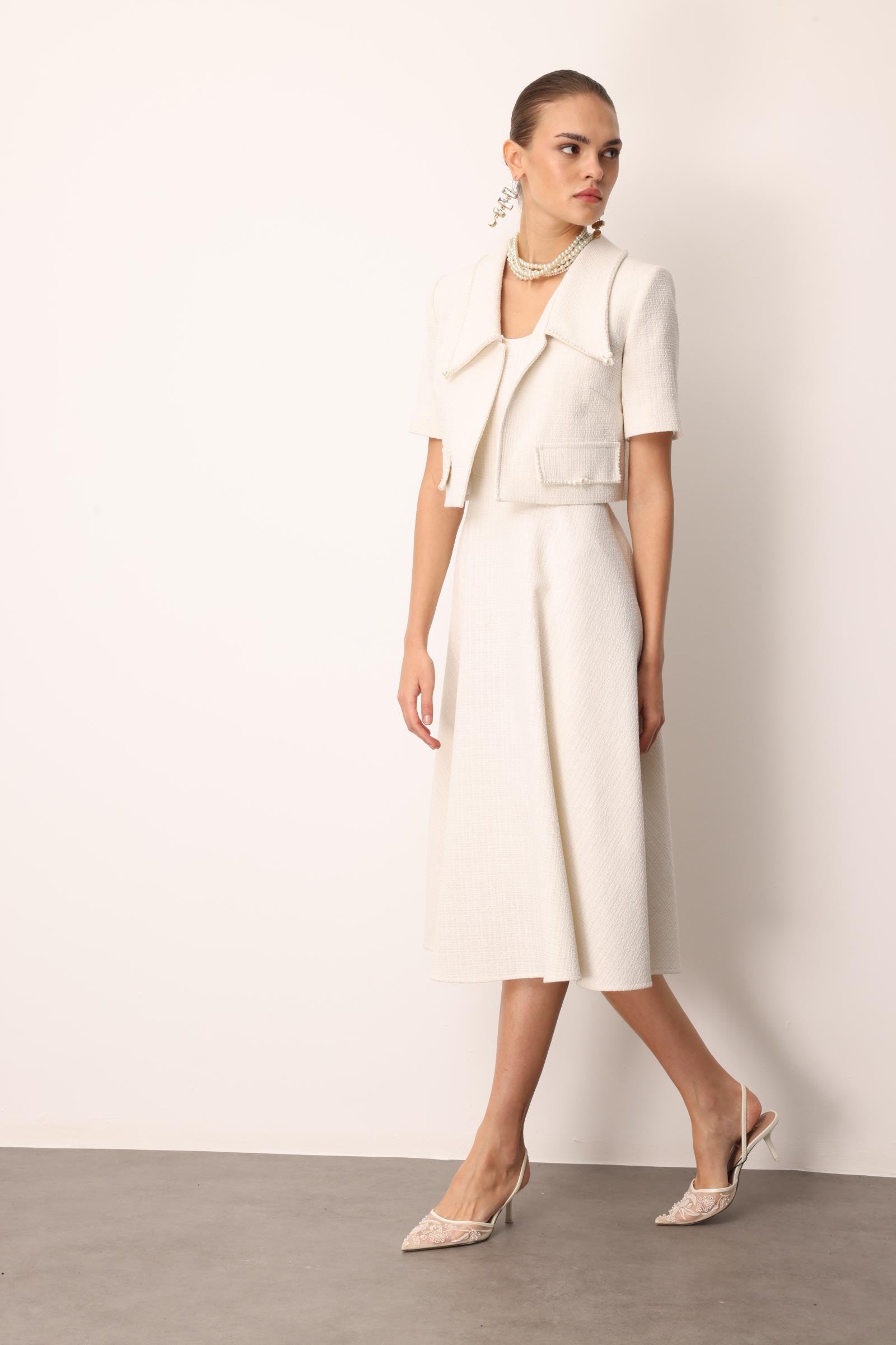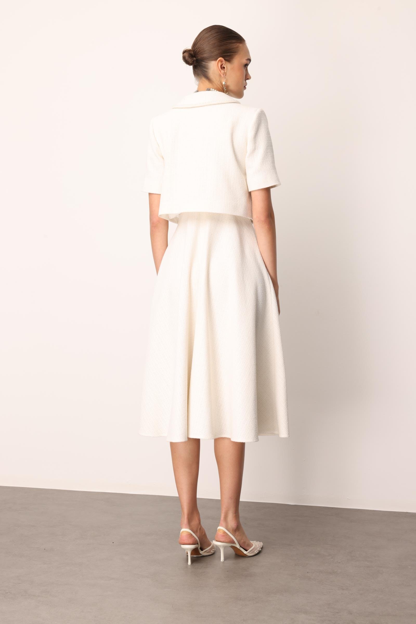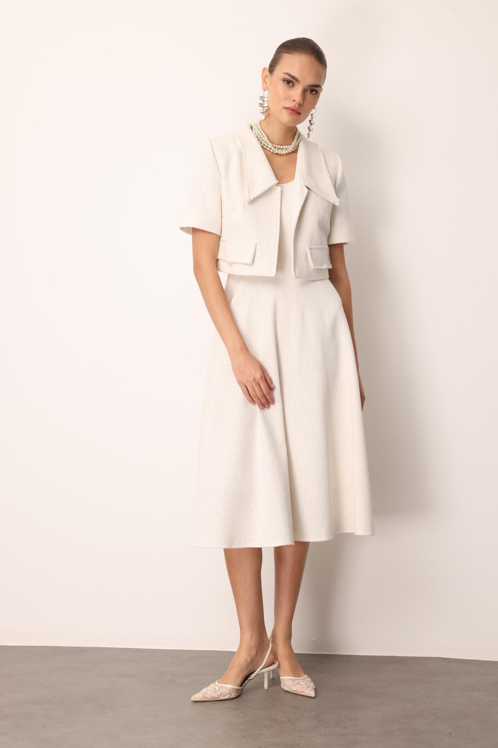 Klasik ve sofistike giyimin en elegant temsilcisi. Bu üç parçalı set, zarafeti zahmetsizce taşımak isteyen Nefeli kadınları için tasarlandı. Özel dokusu ve ekru renginin asaleti ile girdiğiniz her ortamda fark yaratın.