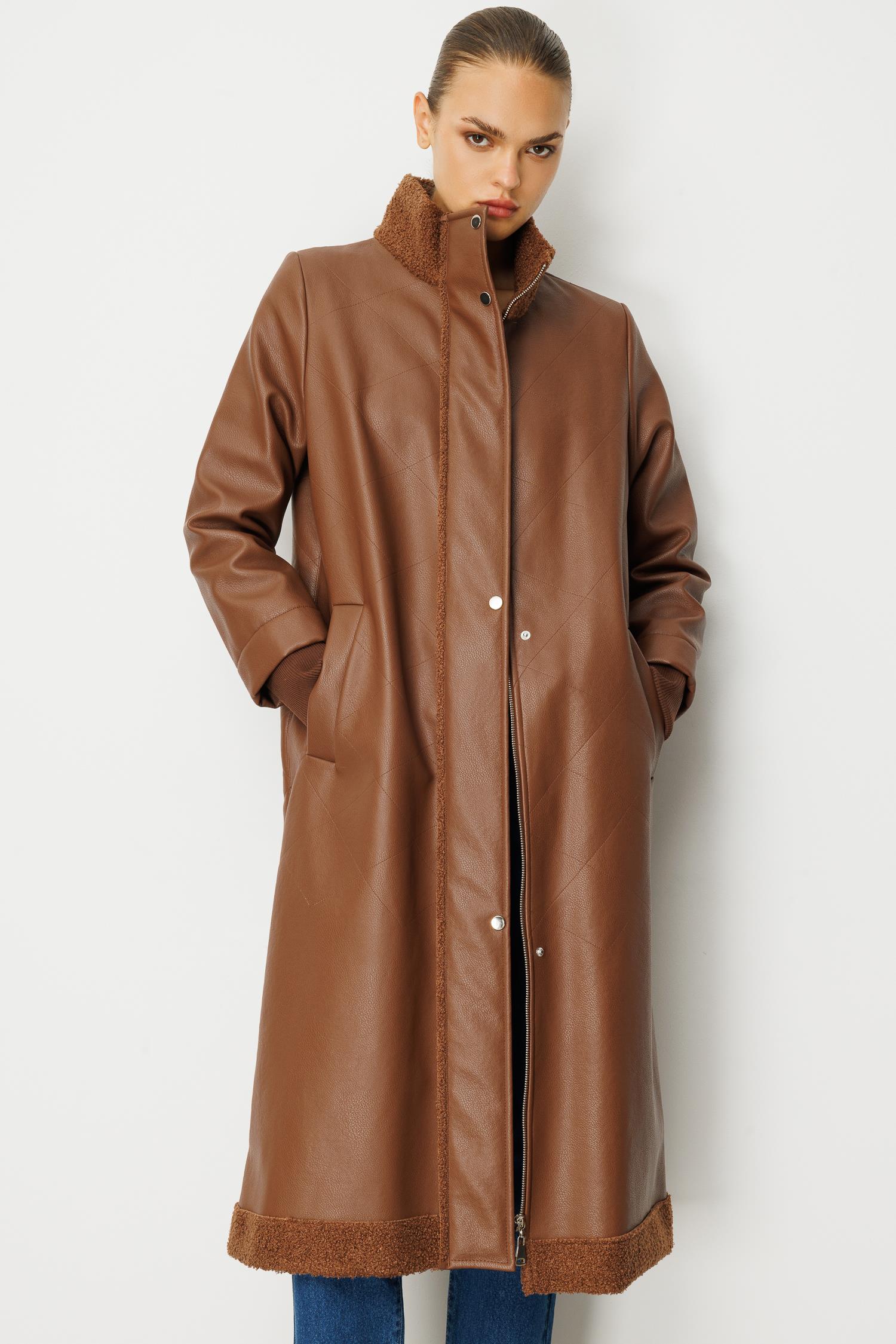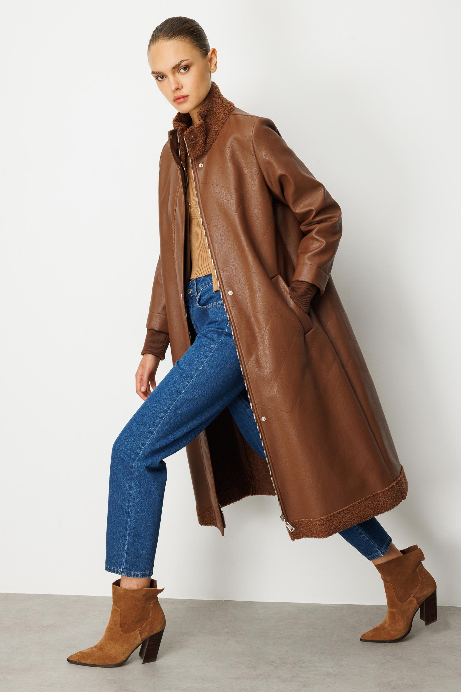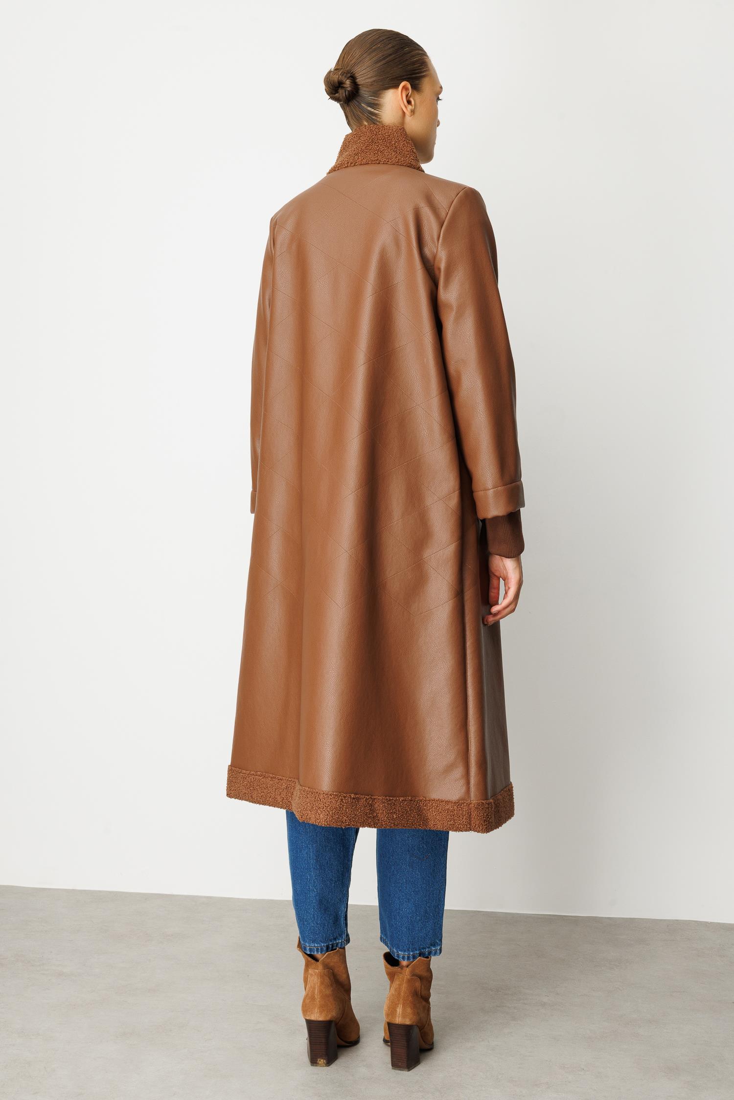 Suni derinin modern duruşu ile sıcak tutan peluş astarın konforu birleşiyor. Karamel (Taba) tonlarındaki bu uzun kaban, soğuk günlerde bile tarzınızdan ödün vermemenizi sağlayacak lüks bir yatırım parçasıdır. Rahat kalıbı ve uzun kesimiyle sofistike bir silüet yaratır.