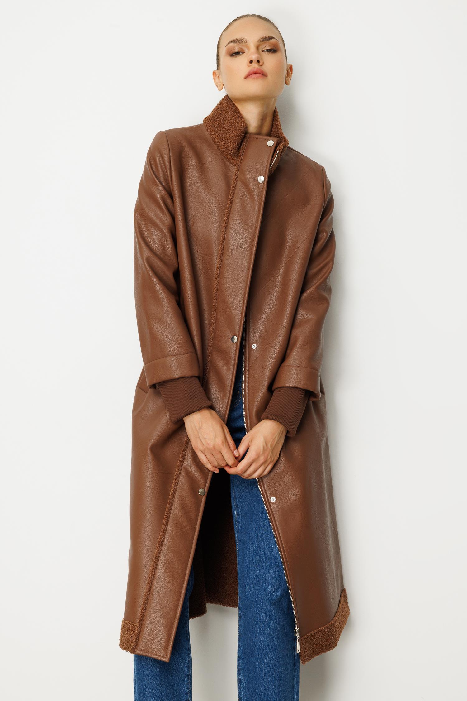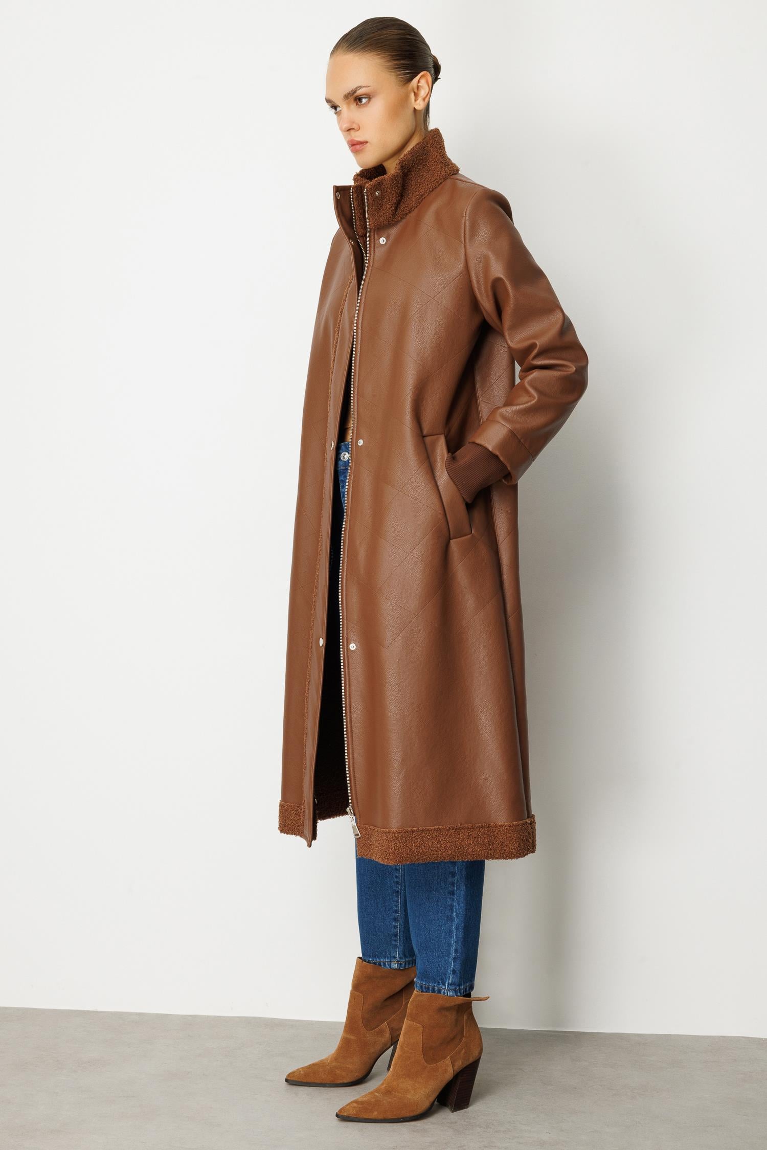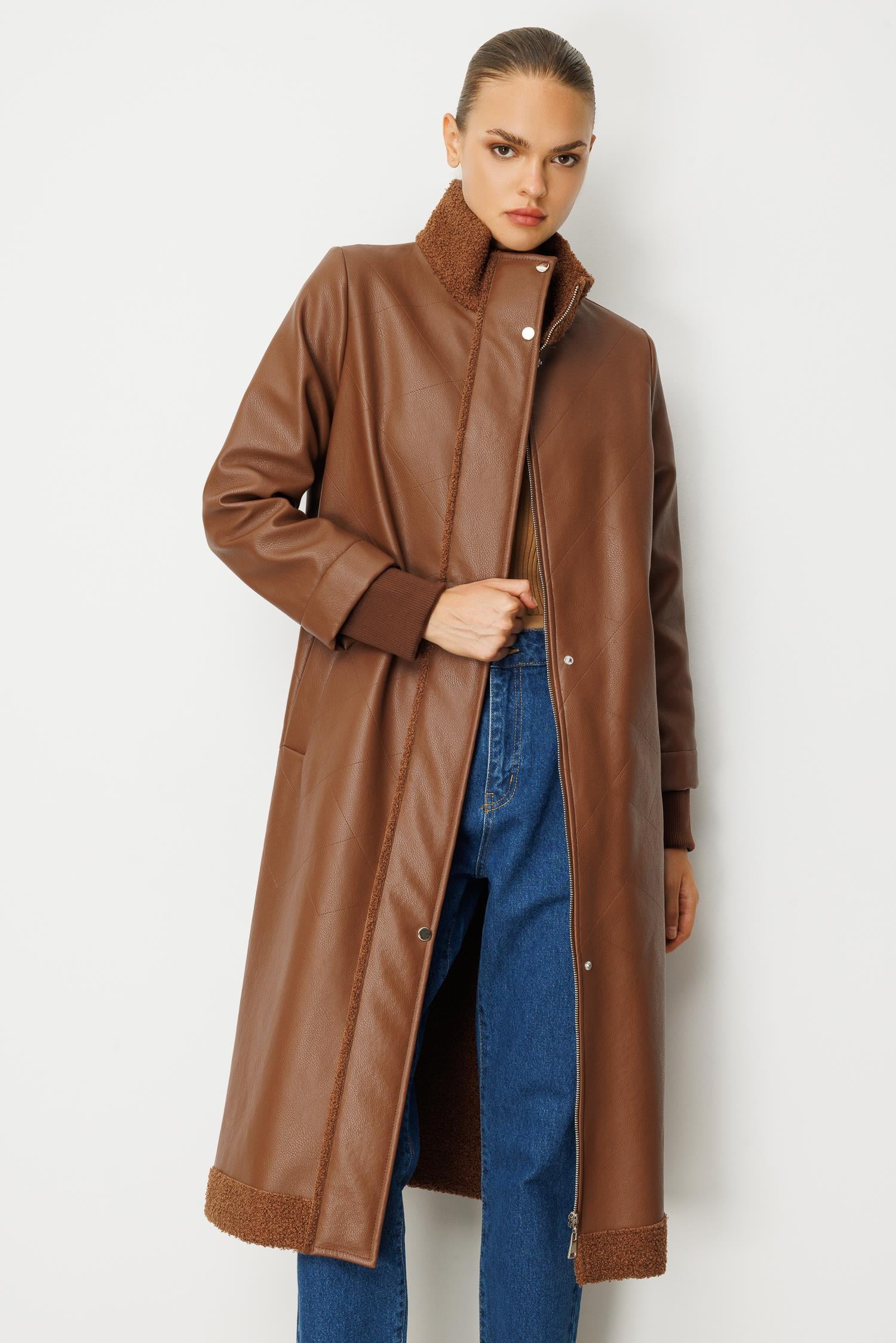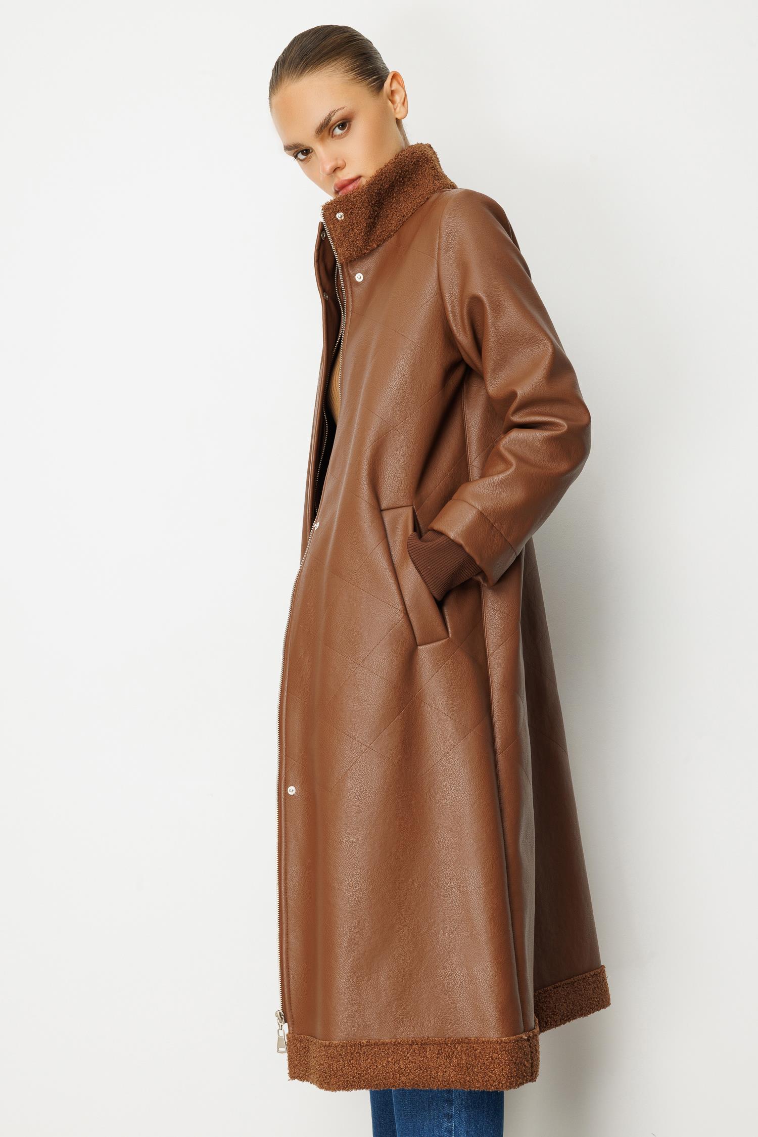 Suni derinin modern duruşu ile sıcak tutan peluş astarın konforu birleşiyor. Karamel (Taba) tonlarındaki bu uzun kaban, soğuk günlerde bile tarzınızdan ödün vermemenizi sağlayacak lüks bir yatırım parçasıdır. Rahat kalıbı ve uzun kesimiyle sofistike bir silüet yaratır.