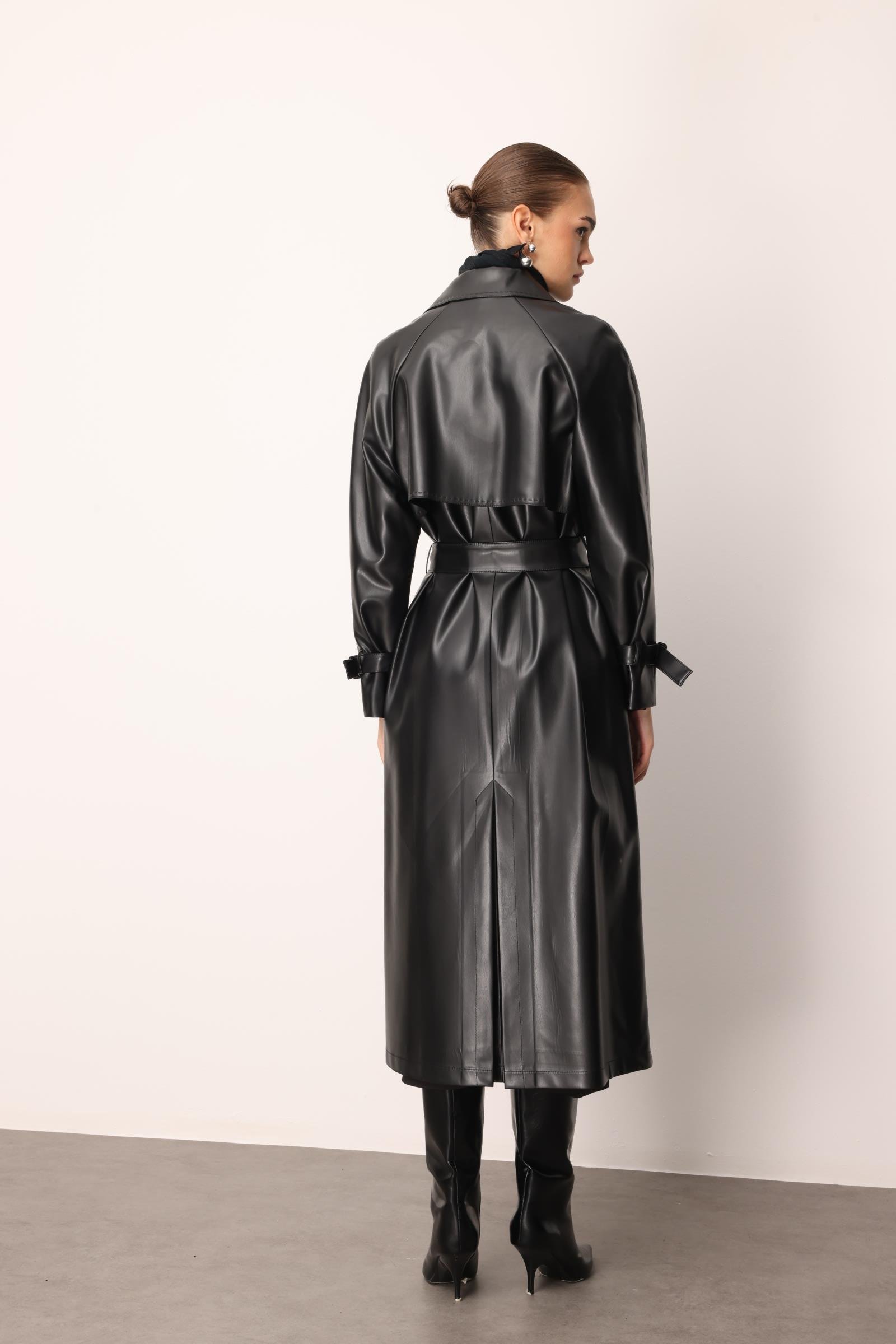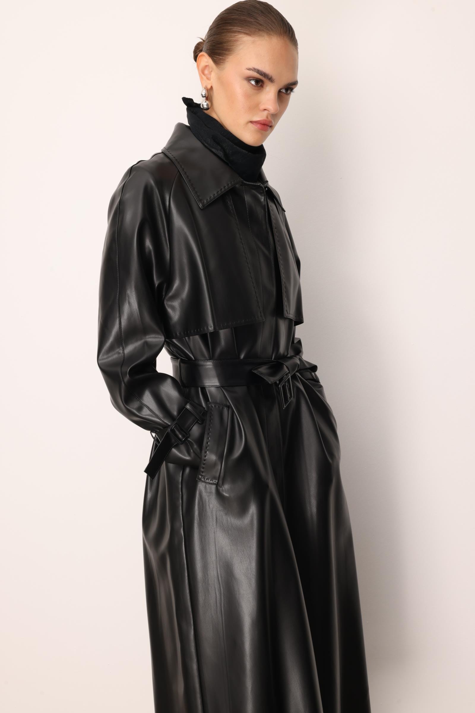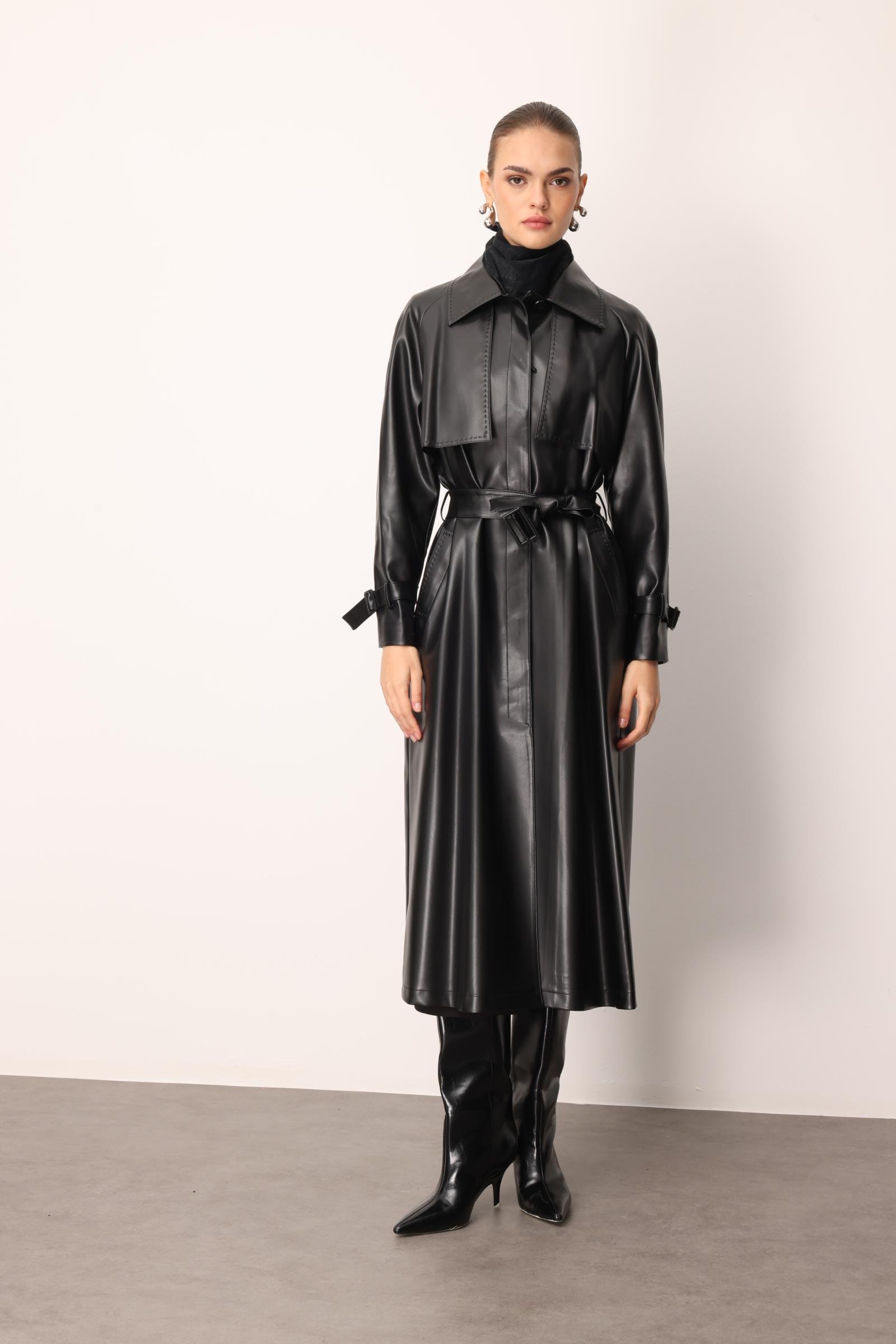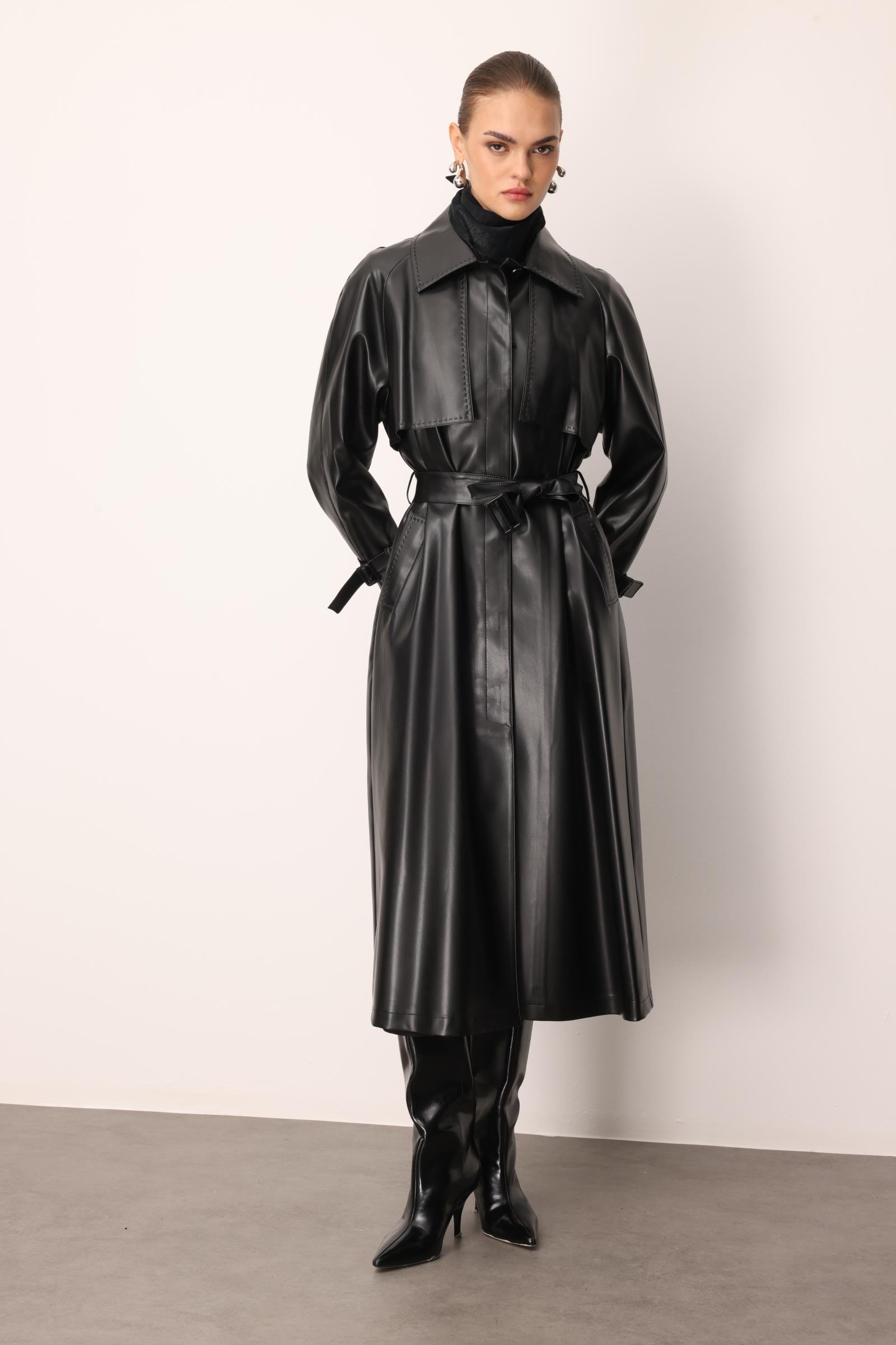 Reglan Kol Pelerin ve Punto Dikiş Detaylı Deri Trençkot SİYAH (26KOLC6754-002)