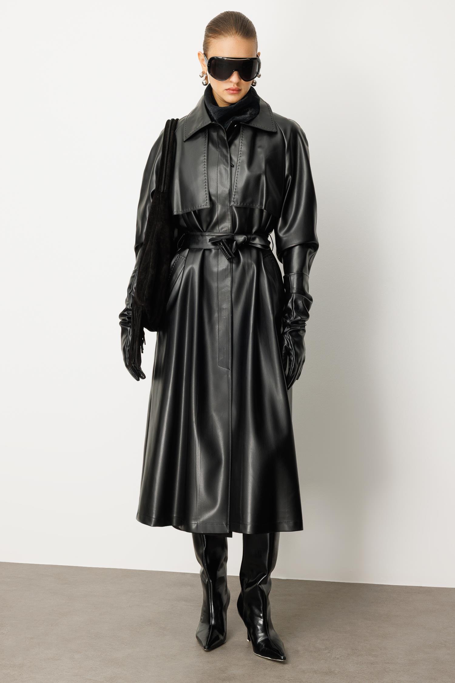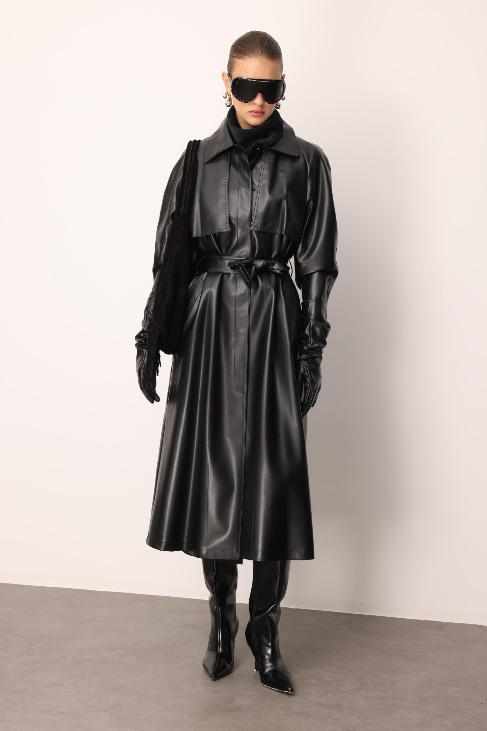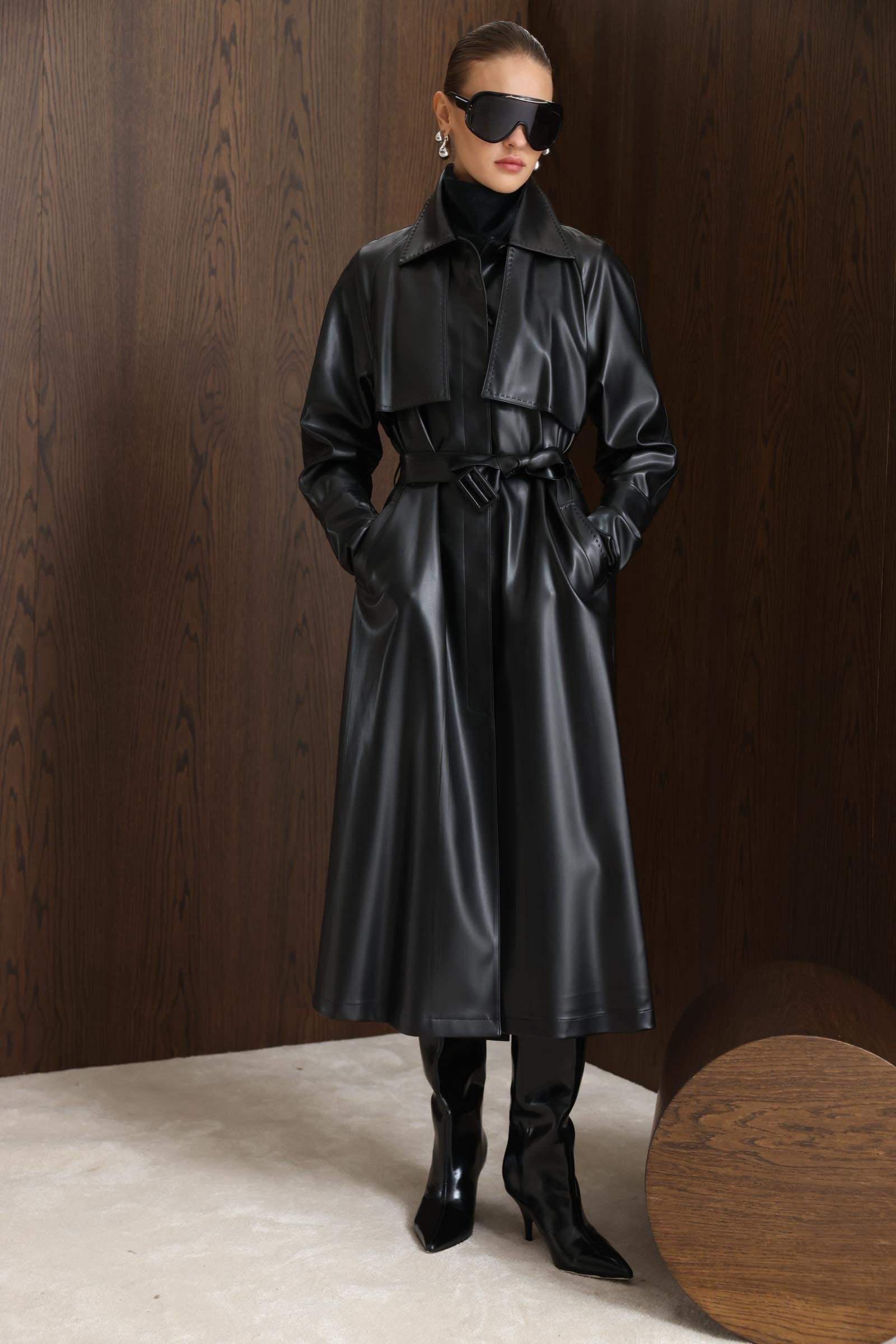 Reglan Kol Pelerin ve Punto Dikiş Detaylı Deri Trençkot SİYAH (26KOLC6754-002)