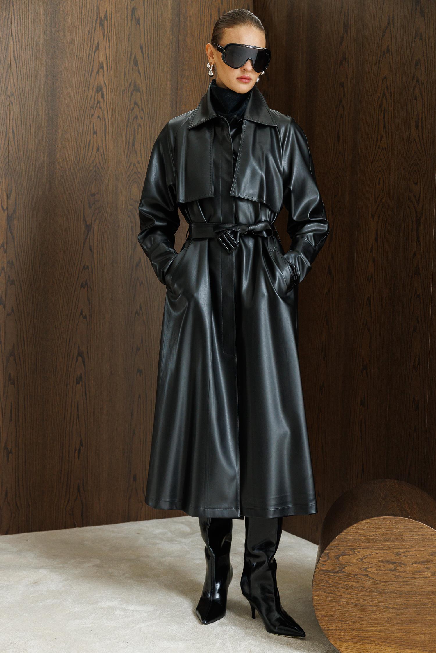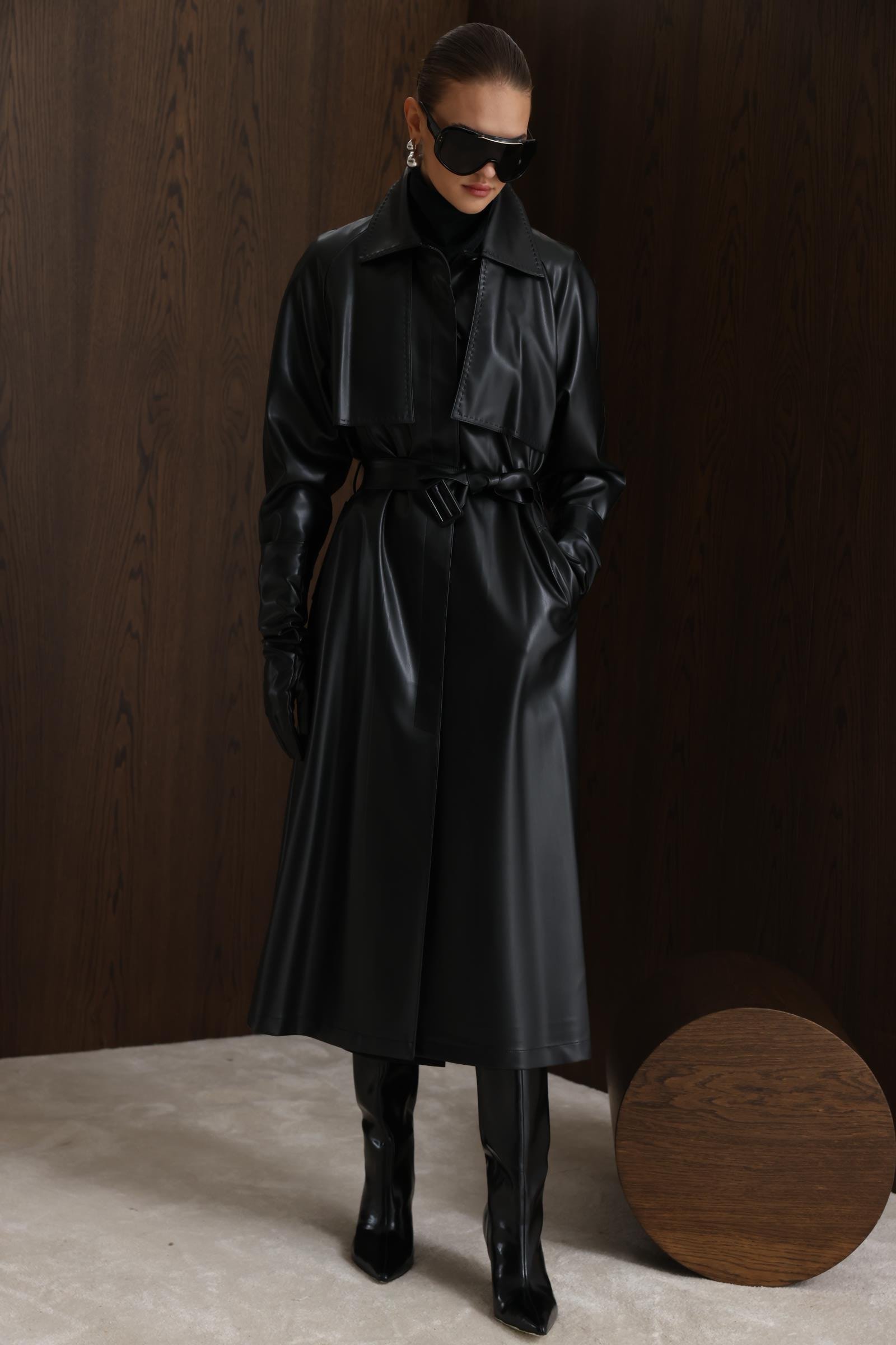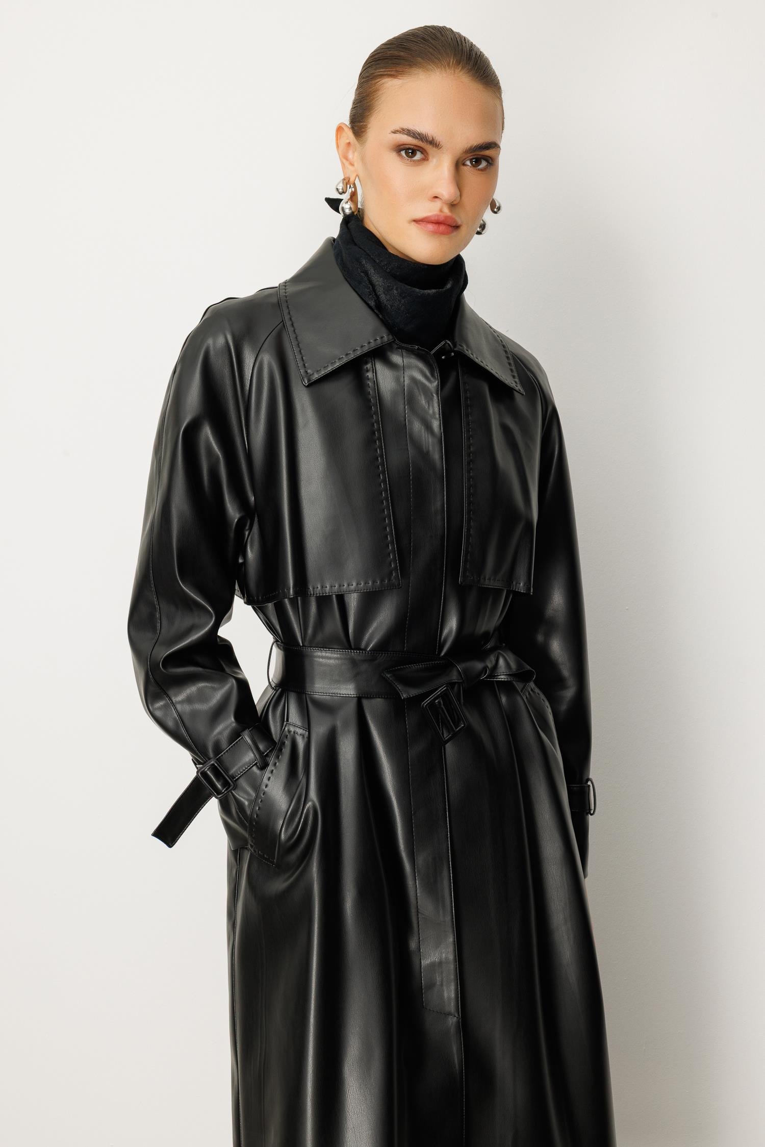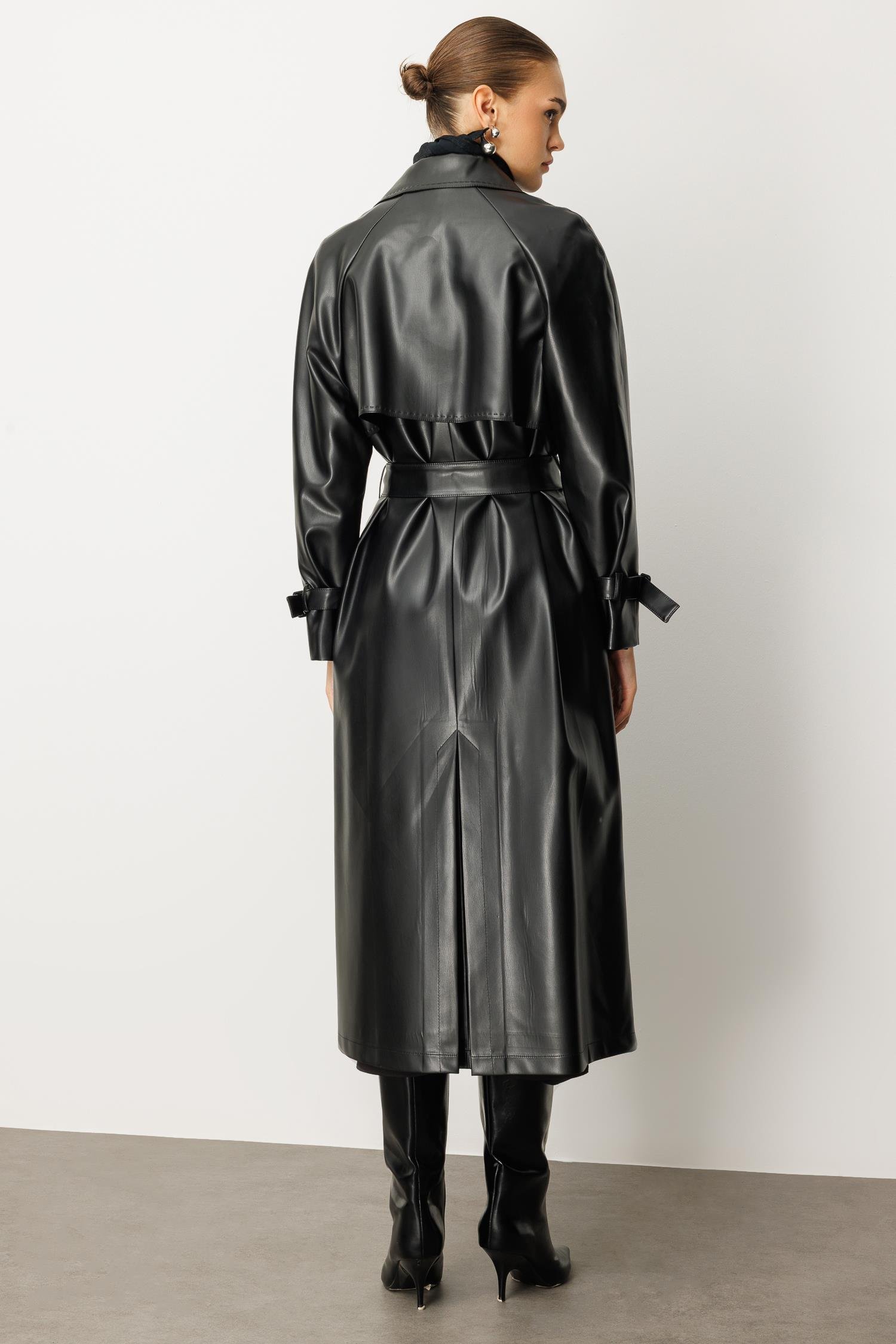 Reglan Kol Pelerin ve Punto Dikiş Detaylı Deri Trençkot SİYAH (26KOLC6754-002)