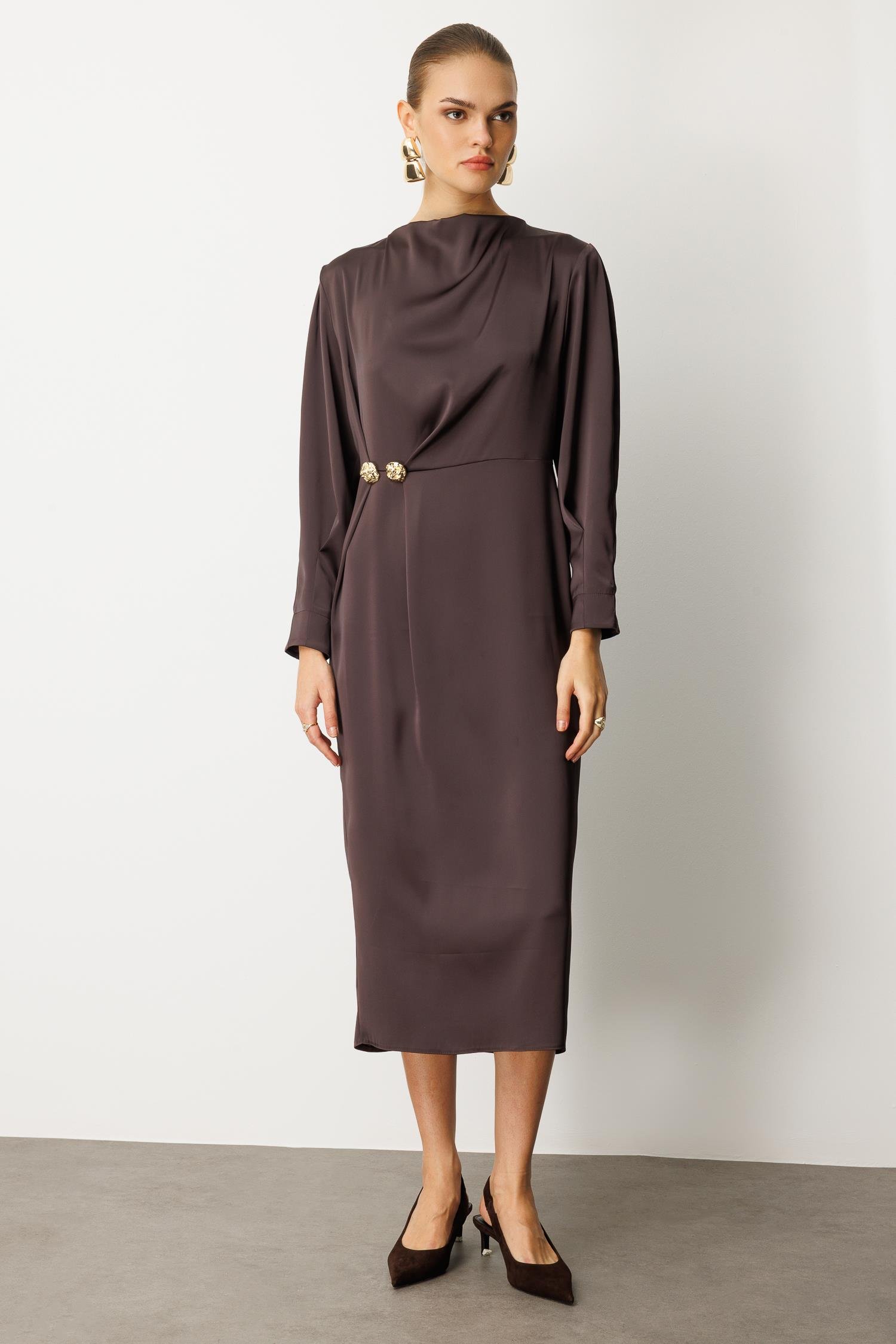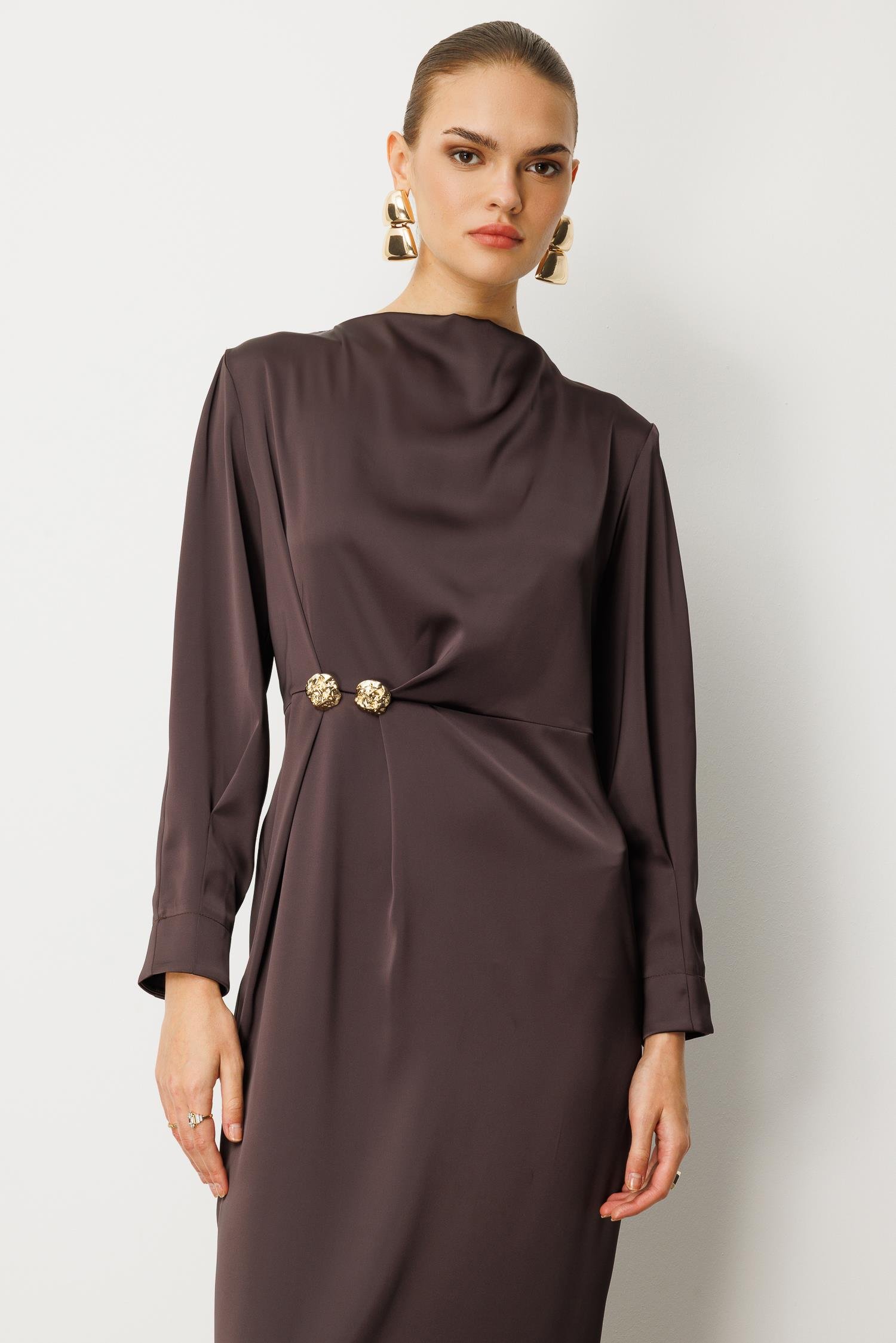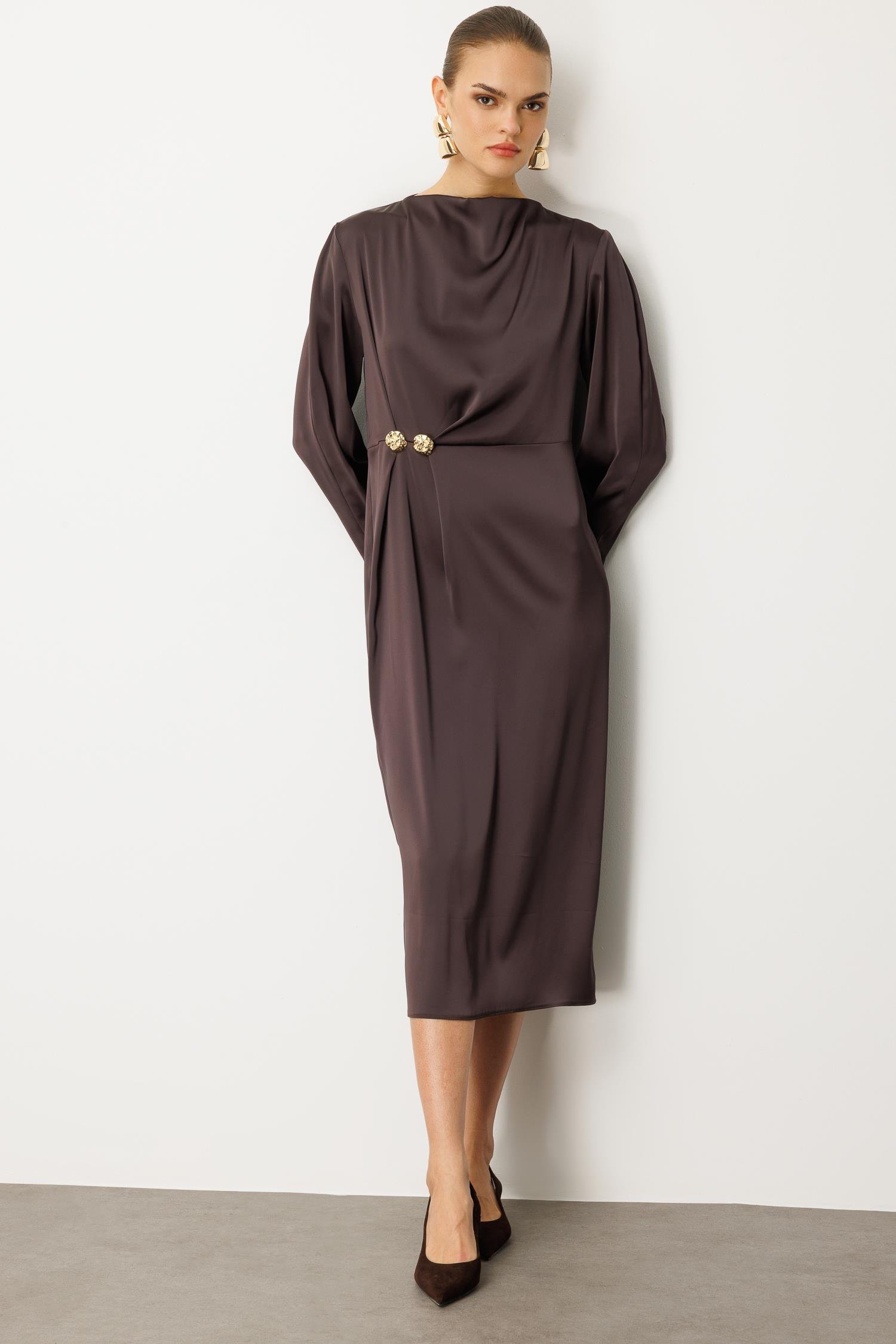 Bel: Bel detayında metalik, taşlı broş veya toka aksesuarı.