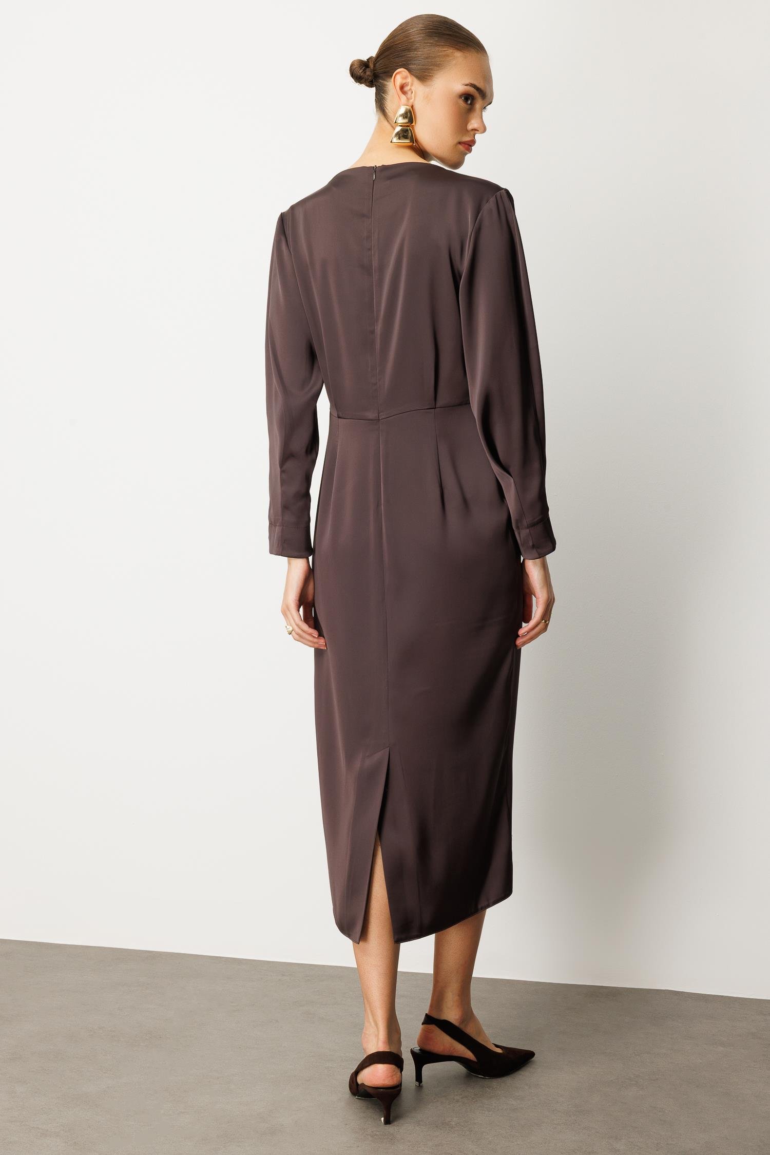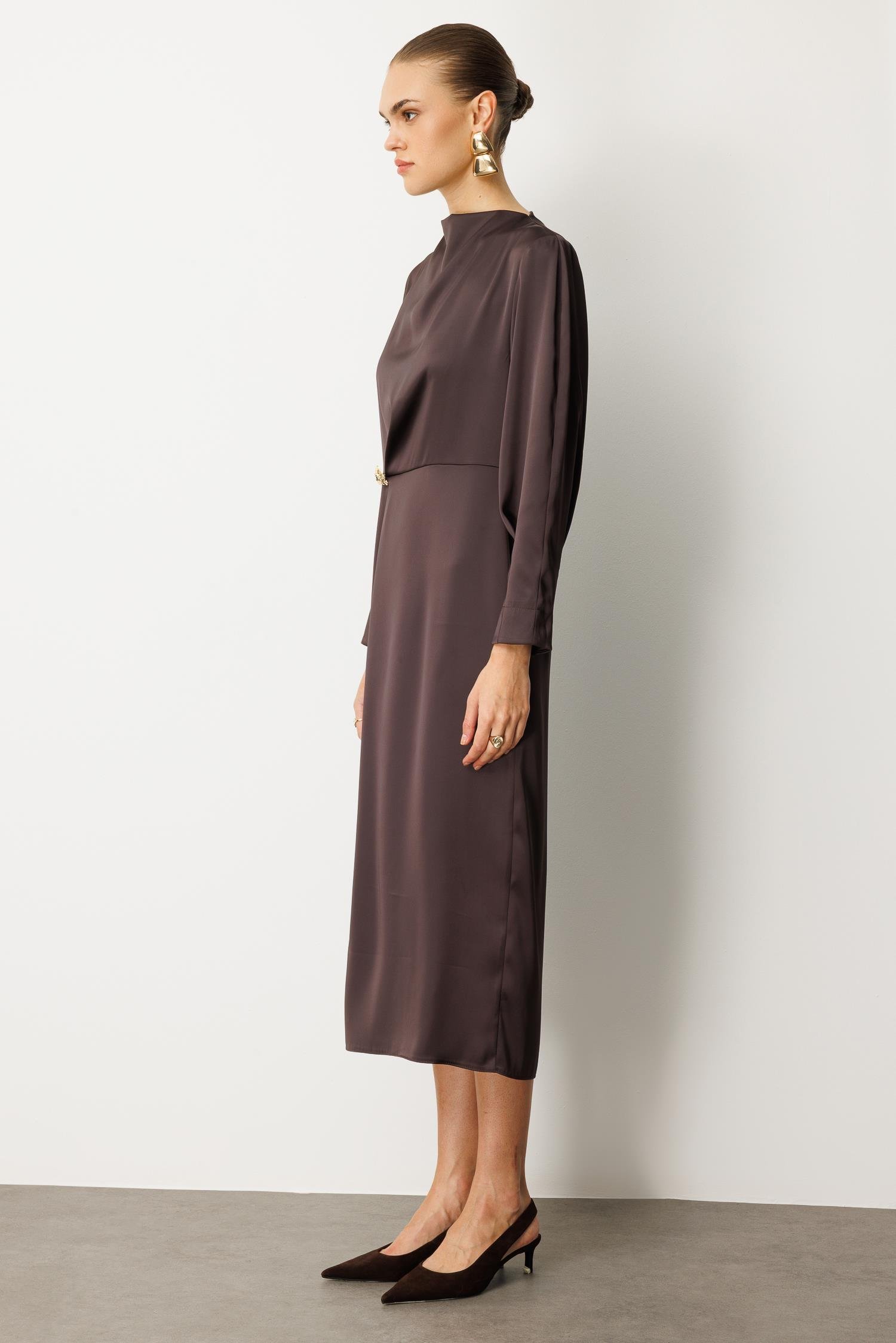 Kesim: Uzun kollu, diz altı midi boy, bele oturan düz kesim.