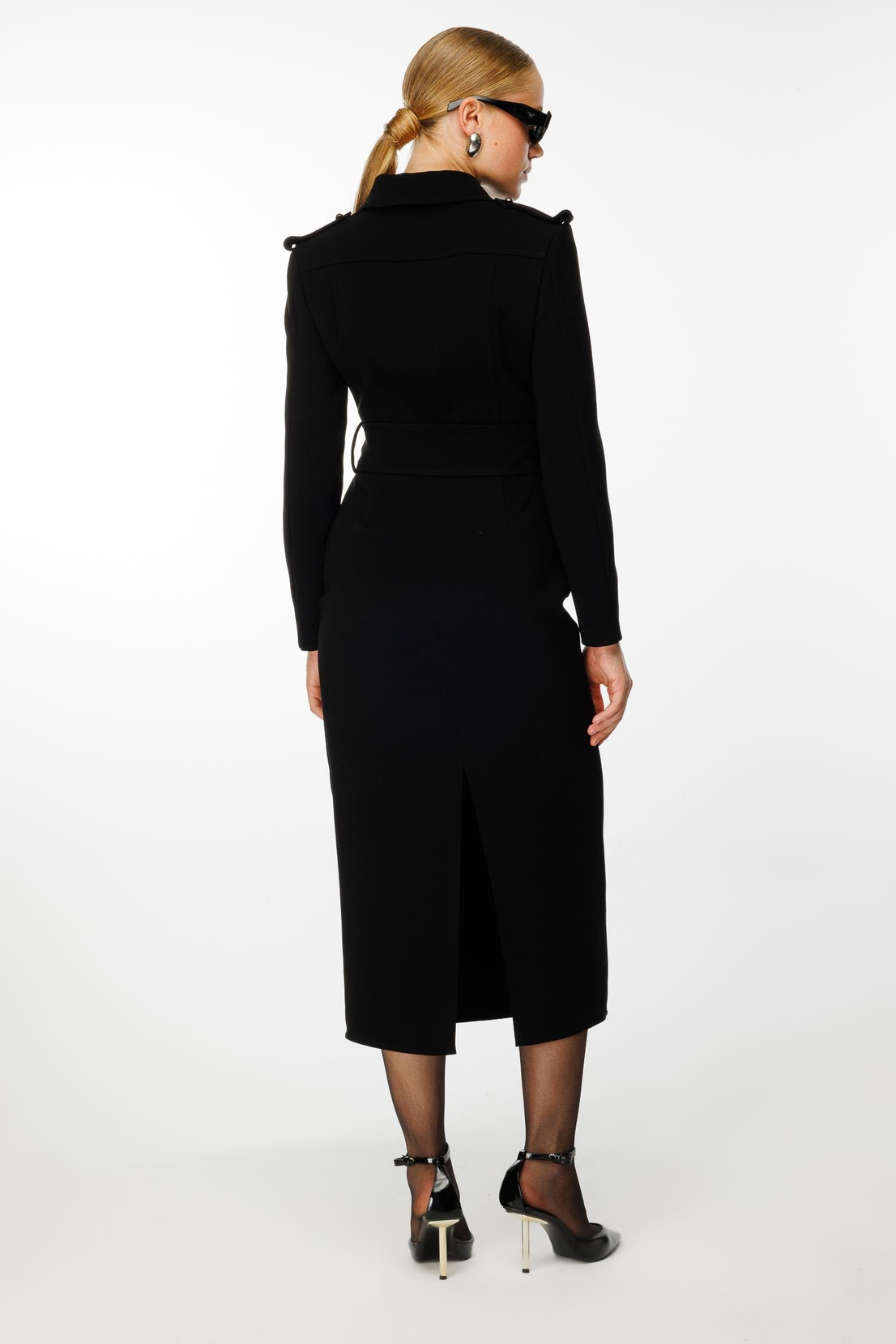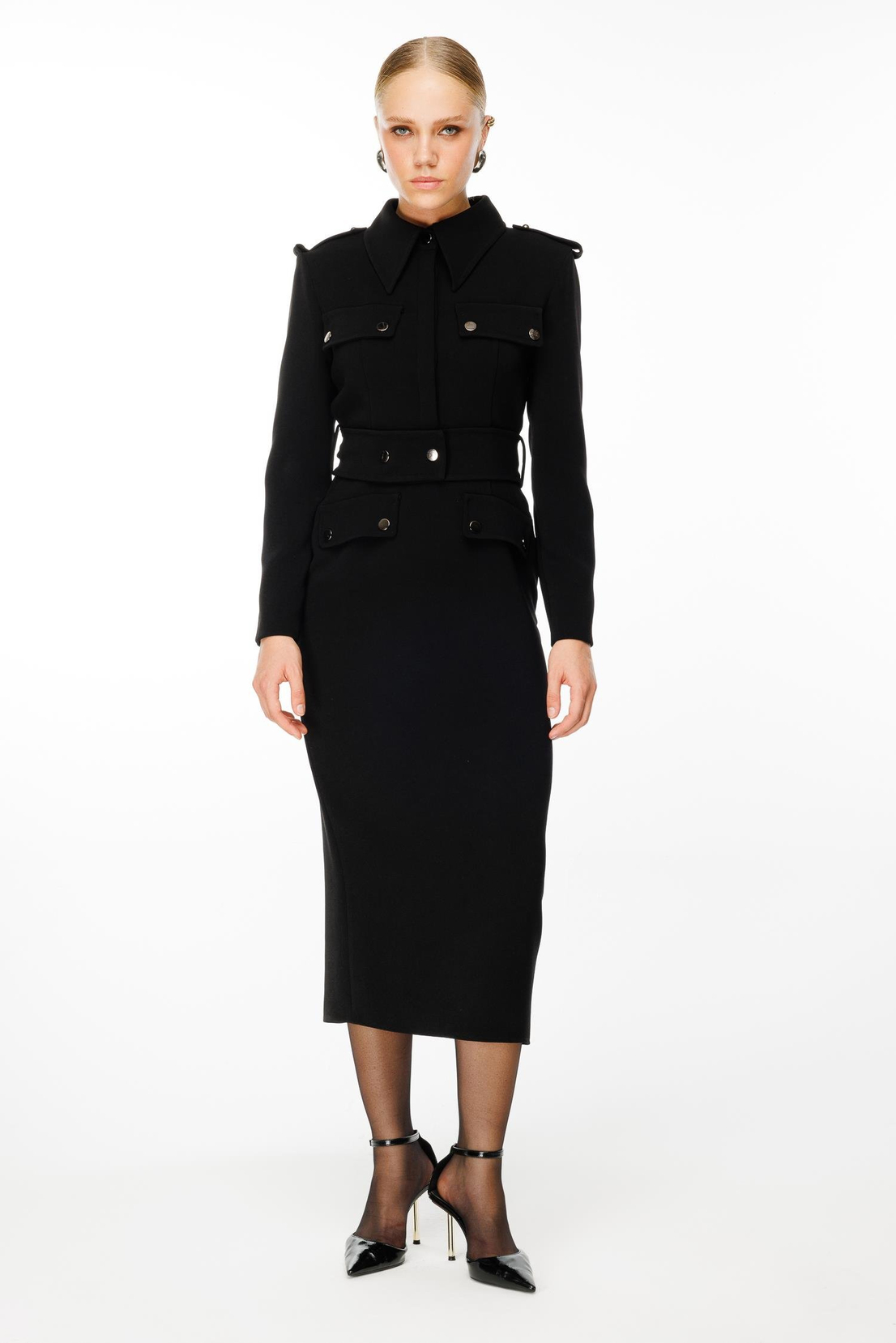 Sofistike ve güçlü bir duruş sergileyen bu siyah uzun kollu elbise, kapak detayları ve vurgulu kemeriyle dikkat çekiyor. Şık yakası ve vücuda oturan kesimi sayesinde hem iş hayatında hem de özel davetlerde etkileyici bir stil yaratmanızı sağlar.