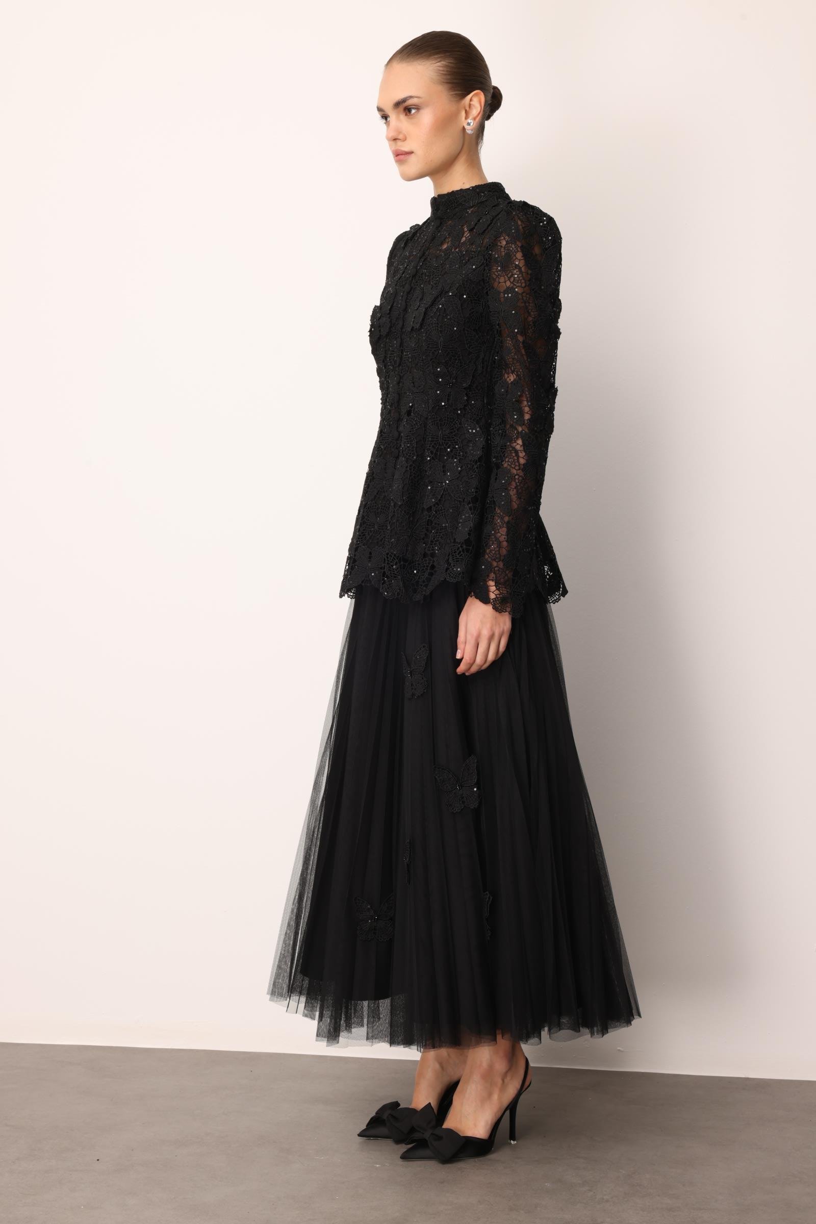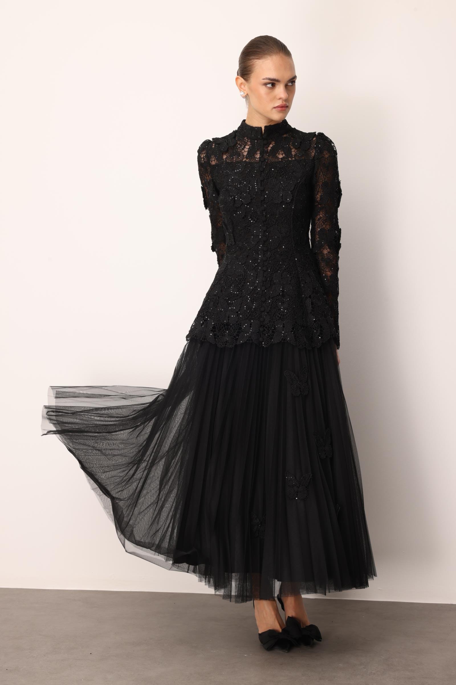 Zarif Dantel İşlemeli Uzun Kollu Kelebek Detay Dantel Ceket ve Tül Etek İkili Set