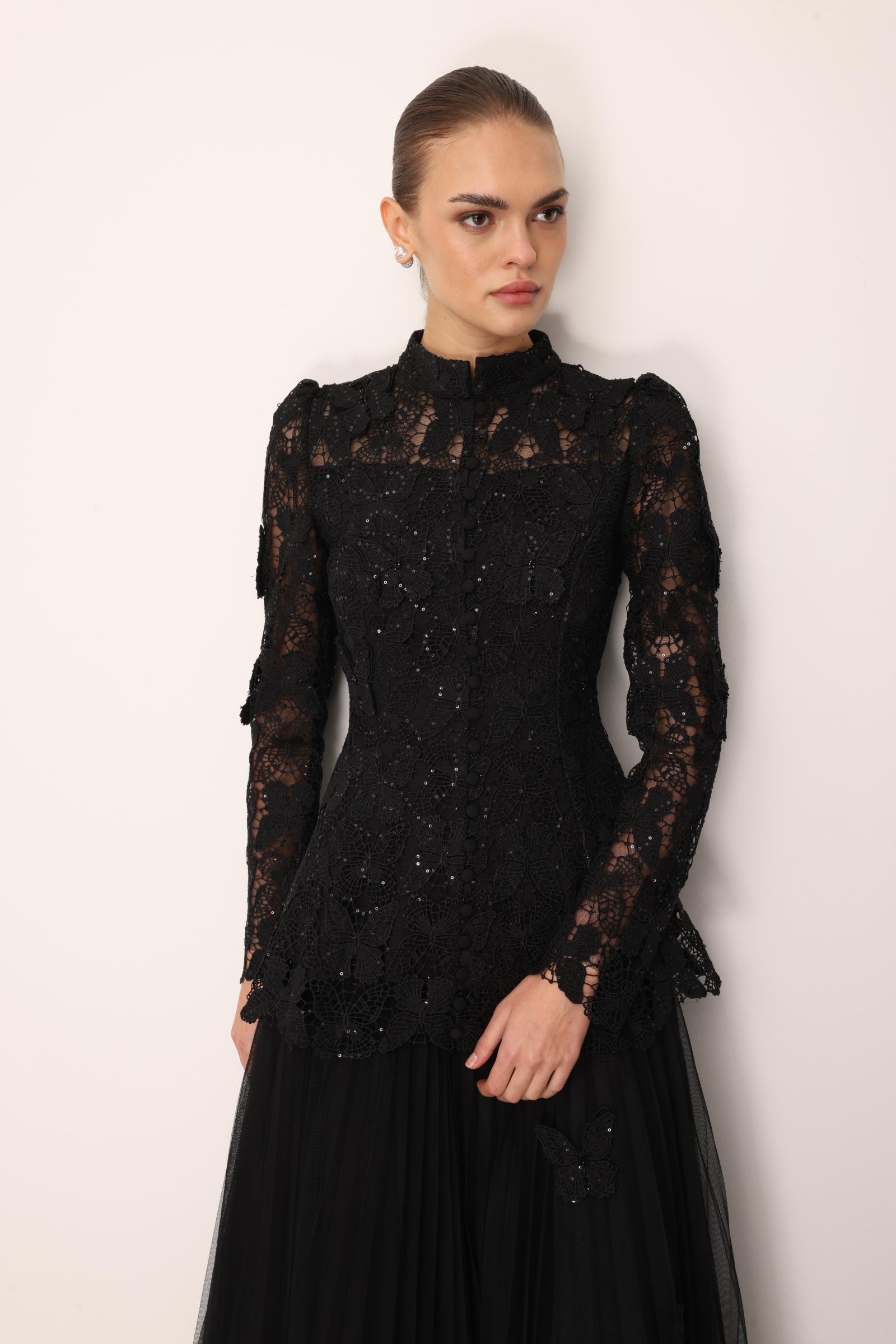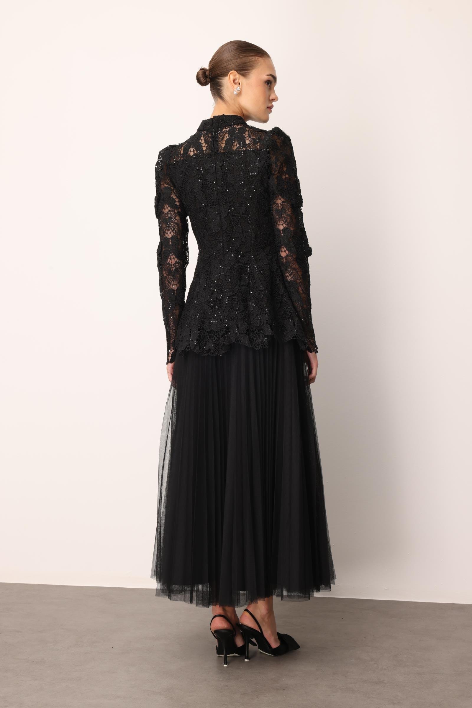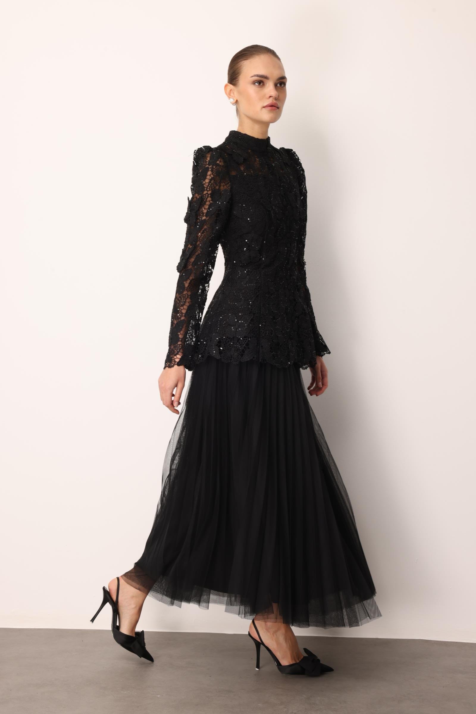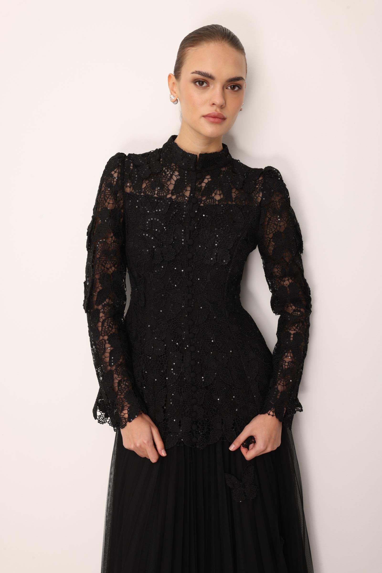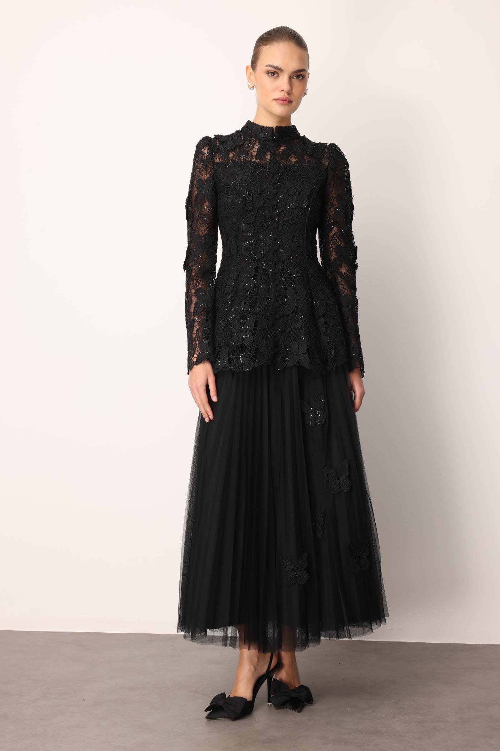 Özel günlerinizde sofistike bir şıklık yakalamanızı sağlayacak bu zarif ikili set, dantel işlemeli uzun kollu bir ceket ve hafif tül bir etekten oluşuyor. Ceketin büyüleyici kelebek, dantel detayları ve transparan dokusu, feminen bir zarafet sunarken, yüksek yakası ve önden inen narin düğmeleri klasik bir dokunuş katıyor. Volanlı omuz detayları ve uzun, işlemeli kollar, cekete romantik bir hava veriyor.