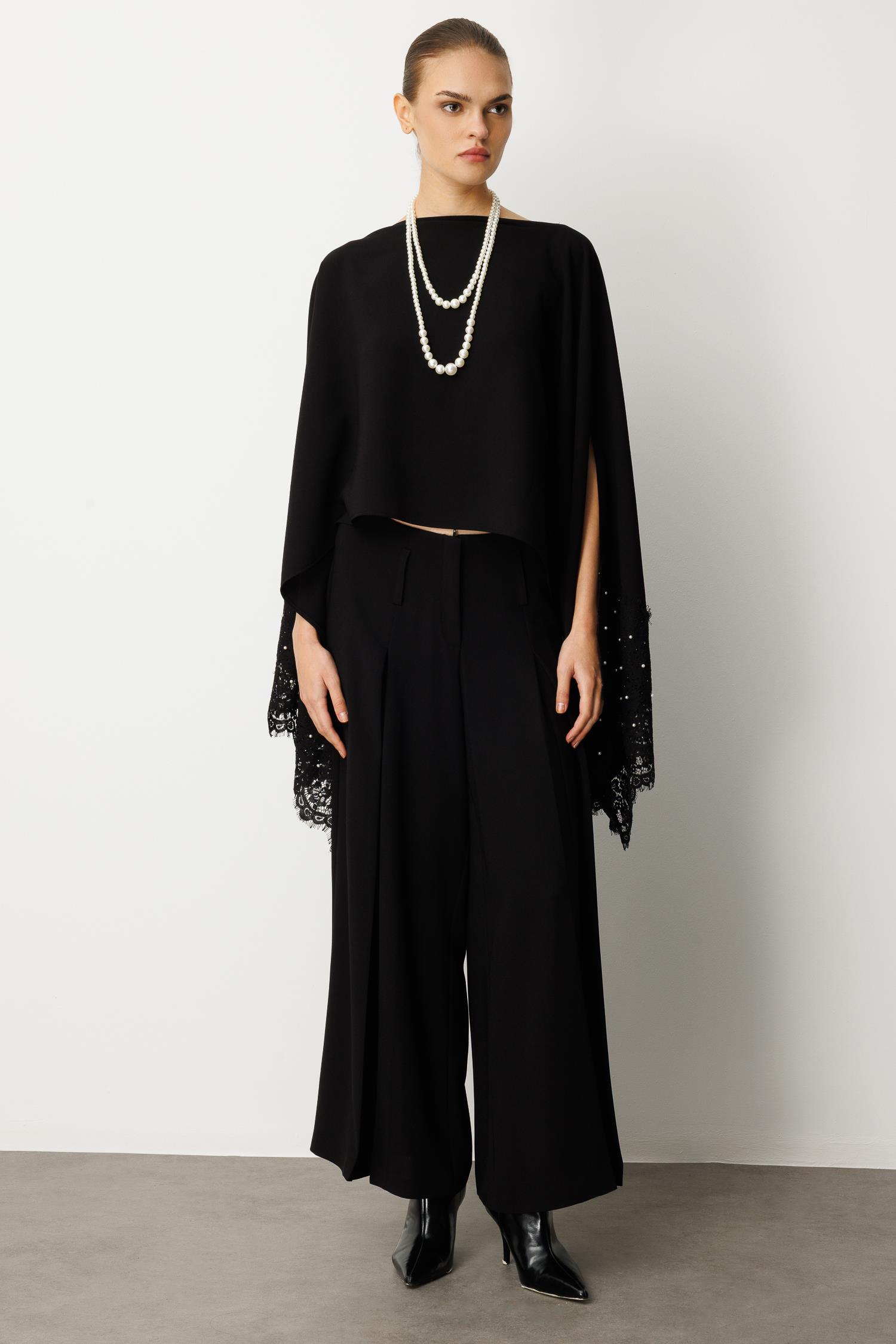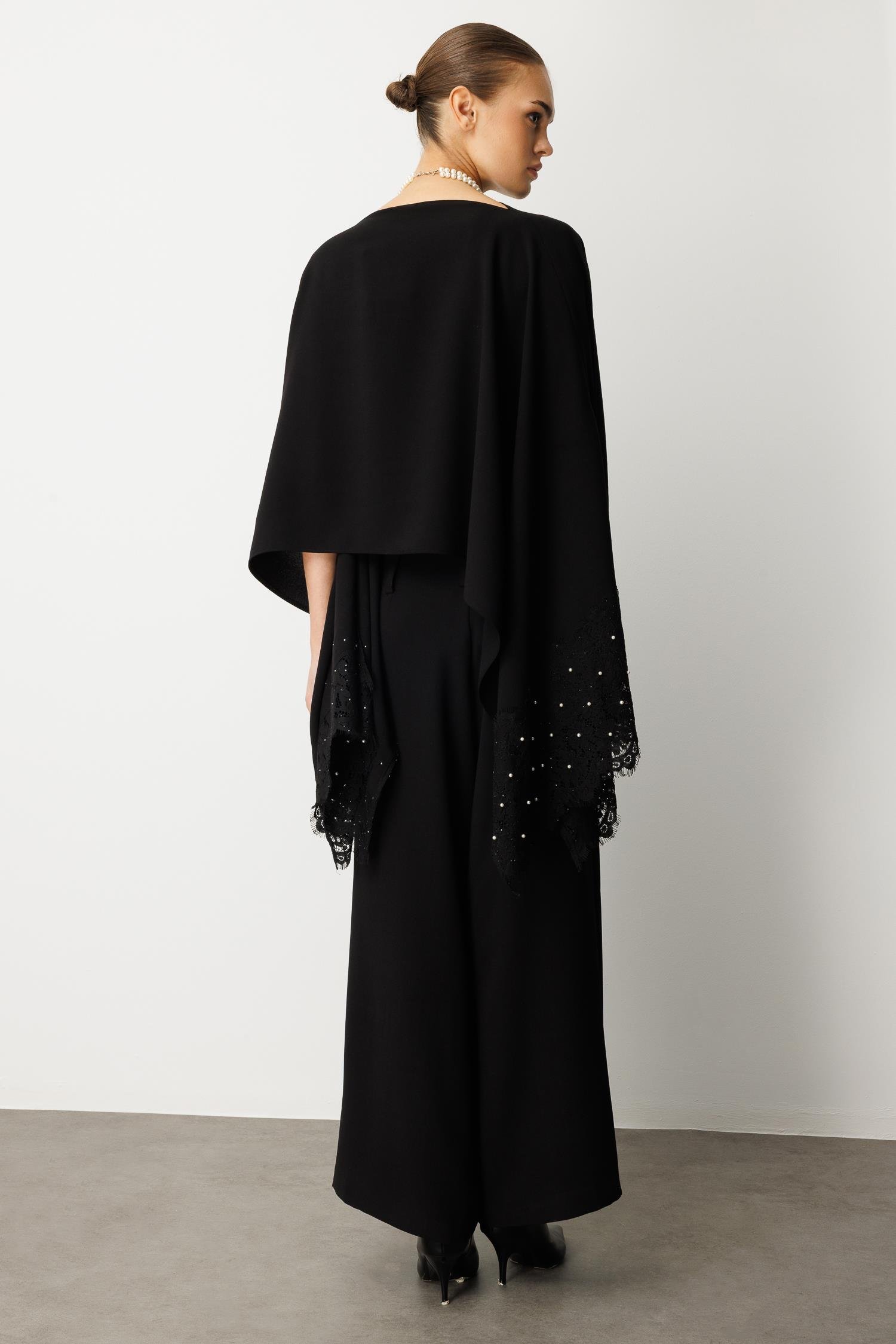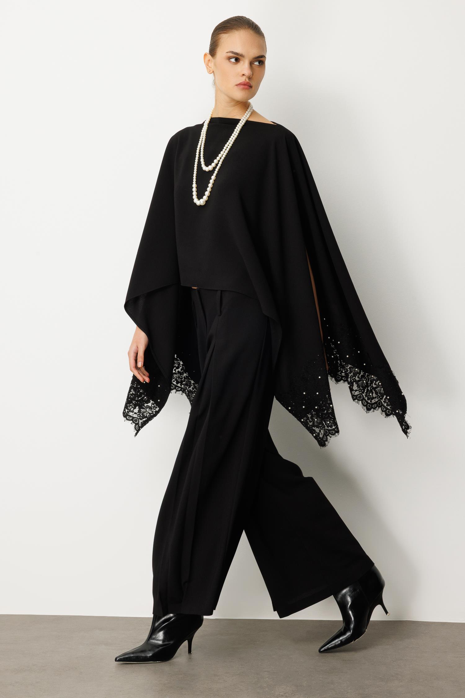 Omuzlardan zarifçe dökülen pelerin kesimi, her adımınızda büyüleyici bir hareket ve gizemli bir hava katarken, bluzun alt kısımlarındaki ve kollarındaki ince dantel işleme ve sedefli inci/boncuk detayları lüks bir dokunuş sunar. Klasik kayık yaka formu, aksesuar kullanımına olanak tanıyarak zarafetinizi bir adım öteye taşır.