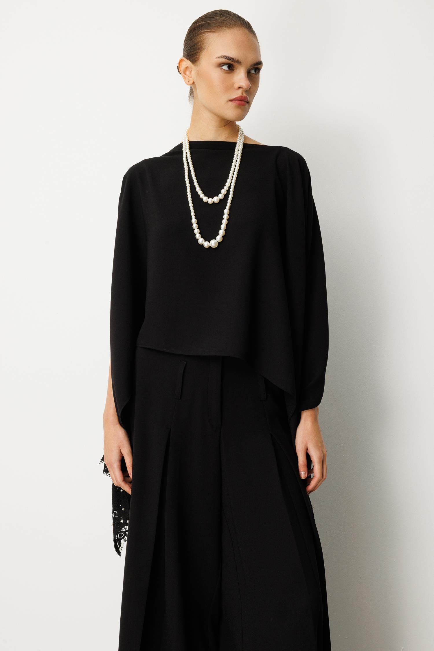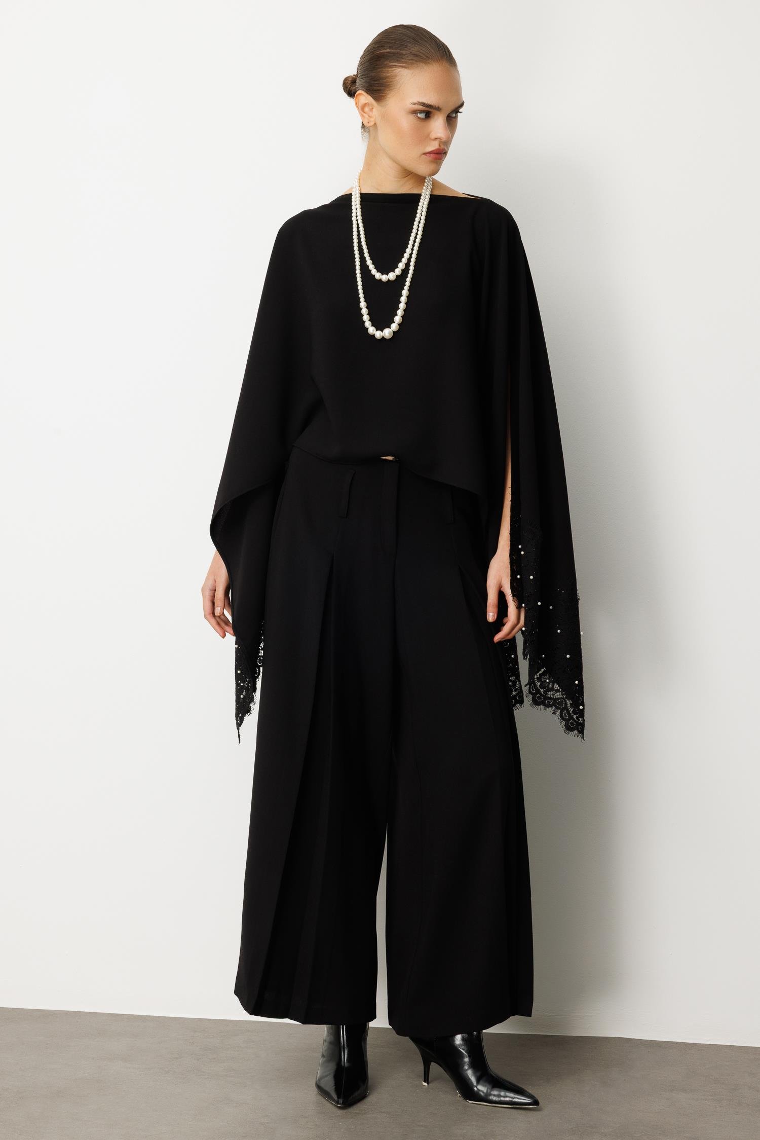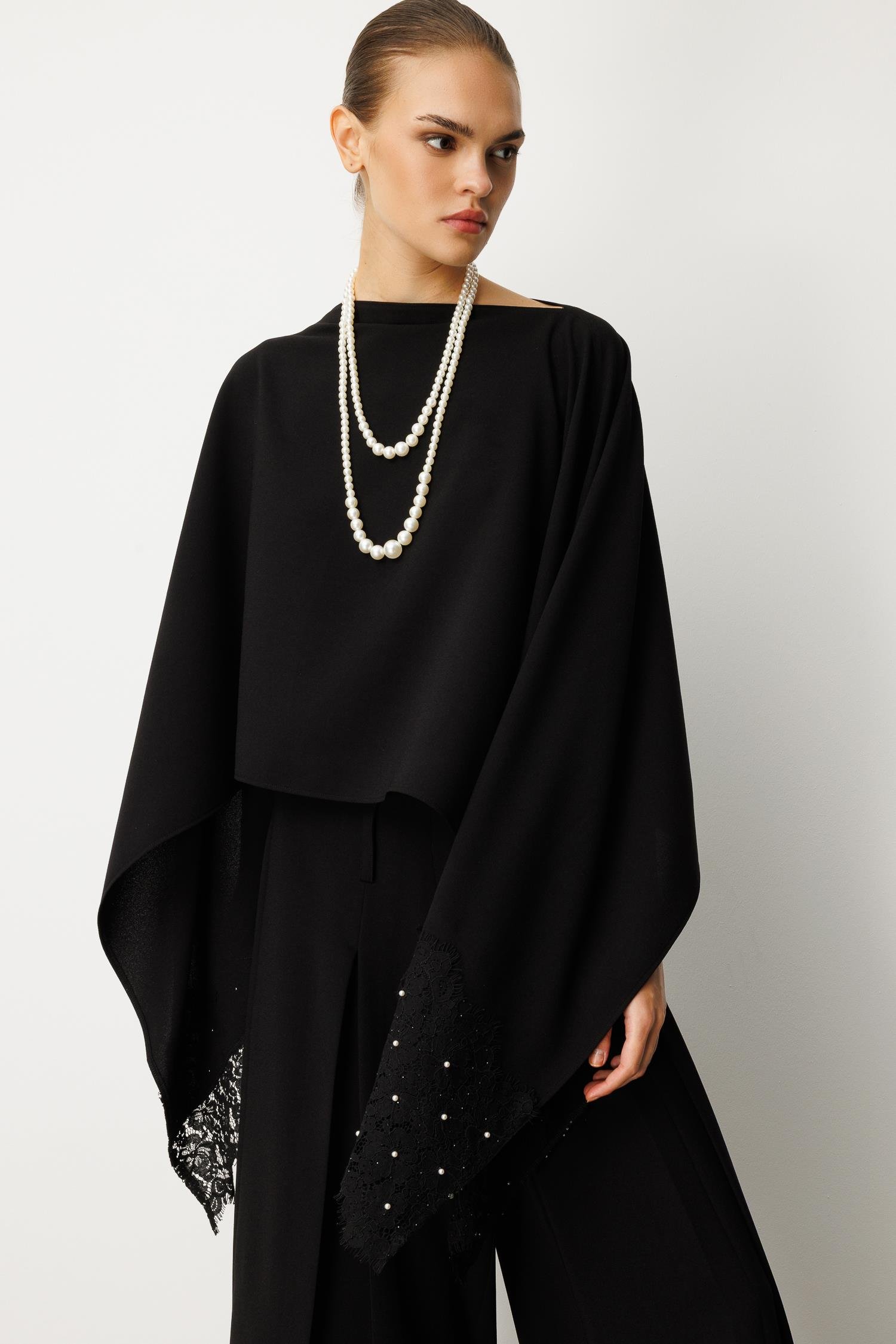 Omuzlardan zarifçe dökülen pelerin kesimi, her adımınızda büyüleyici bir hareket ve gizemli bir hava katarken, bluzun alt kısımlarındaki ve kollarındaki ince dantel işleme ve sedefli inci/boncuk detayları lüks bir dokunuş sunar. Klasik kayık yaka formu, aksesuar kullanımına olanak tanıyarak zarafetinizi bir adım öteye taşır.