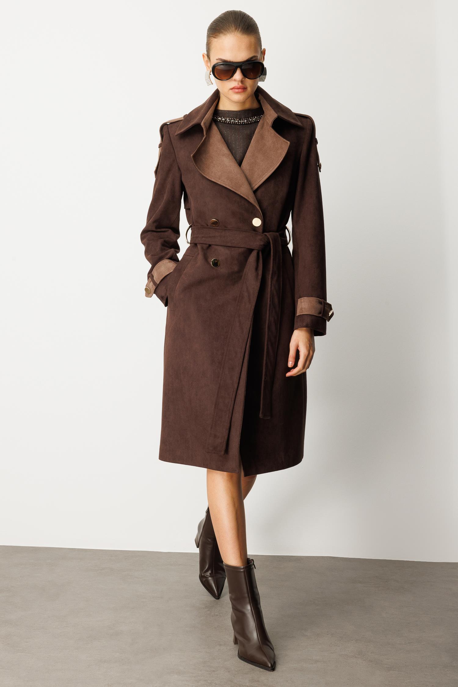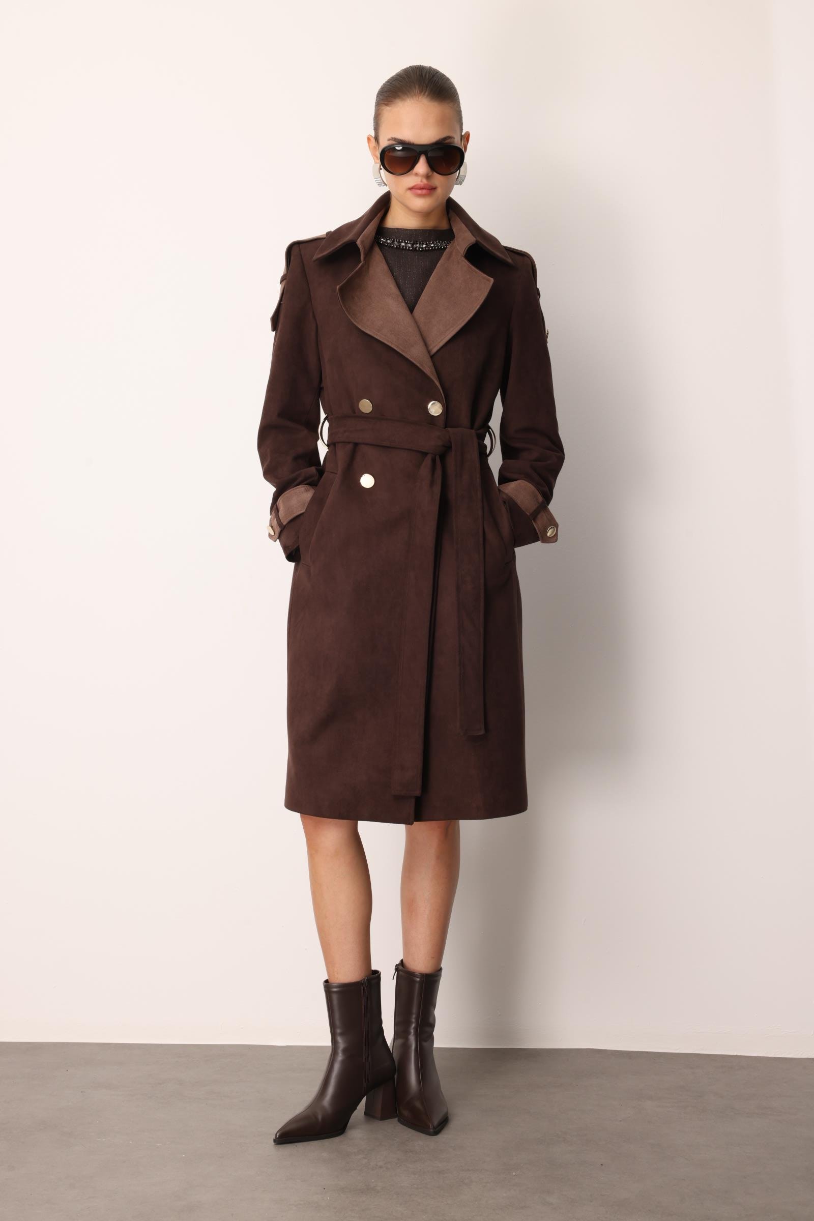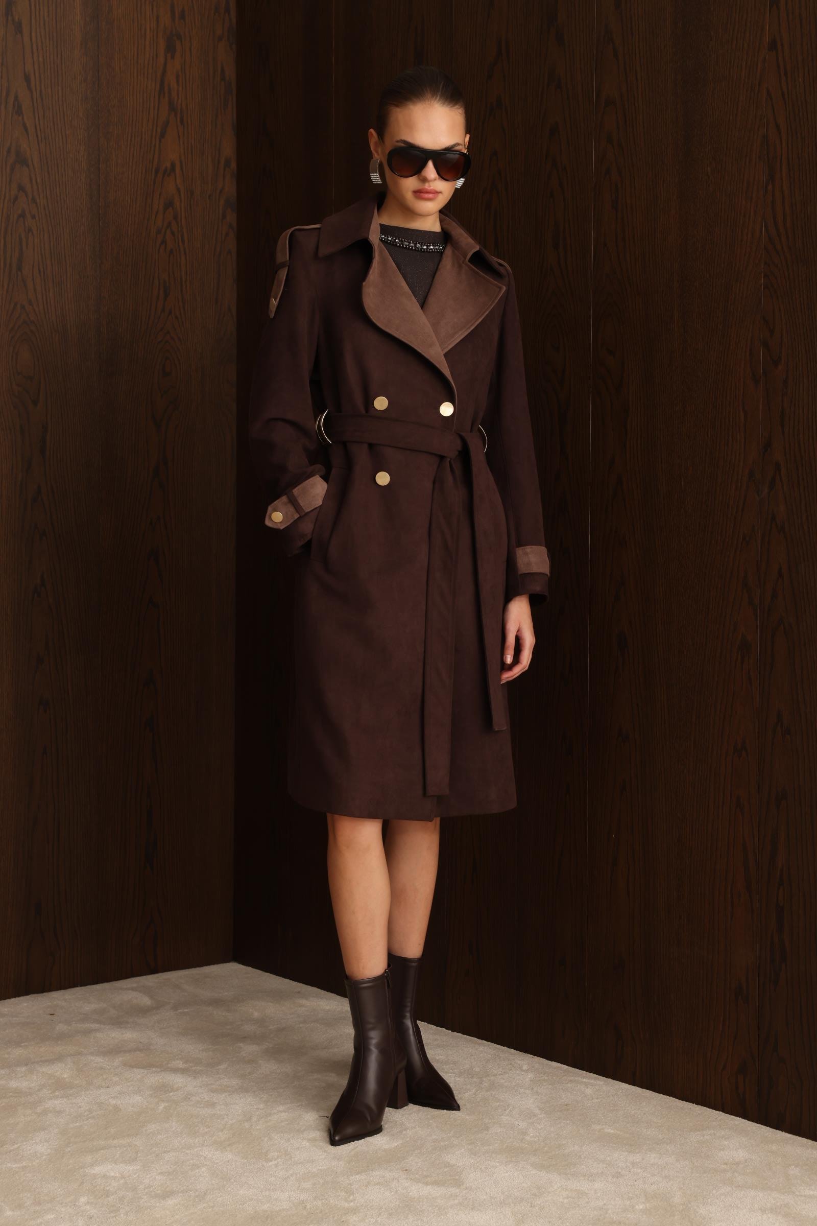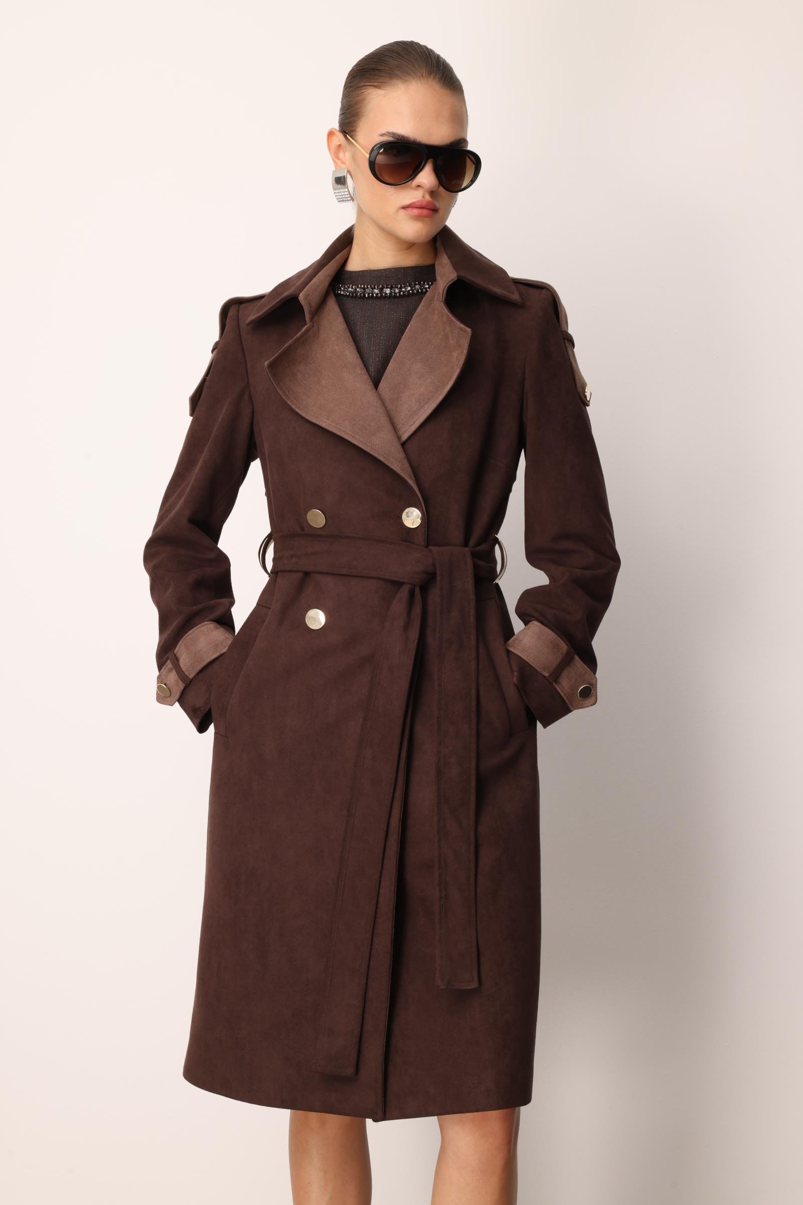 Sonbahar şıklığının en derin ve sofistike hali. Tok duruşlu süet görünümlü kumaşı ve sıcak kahverengi tonuyla bu kaban, lüks bir his yaratır. Büyük çift renkli (kontrast) yakası ve manşet detaylarındaki garniler, ürüne modern ve belirgin bir doku zenginliği katar.