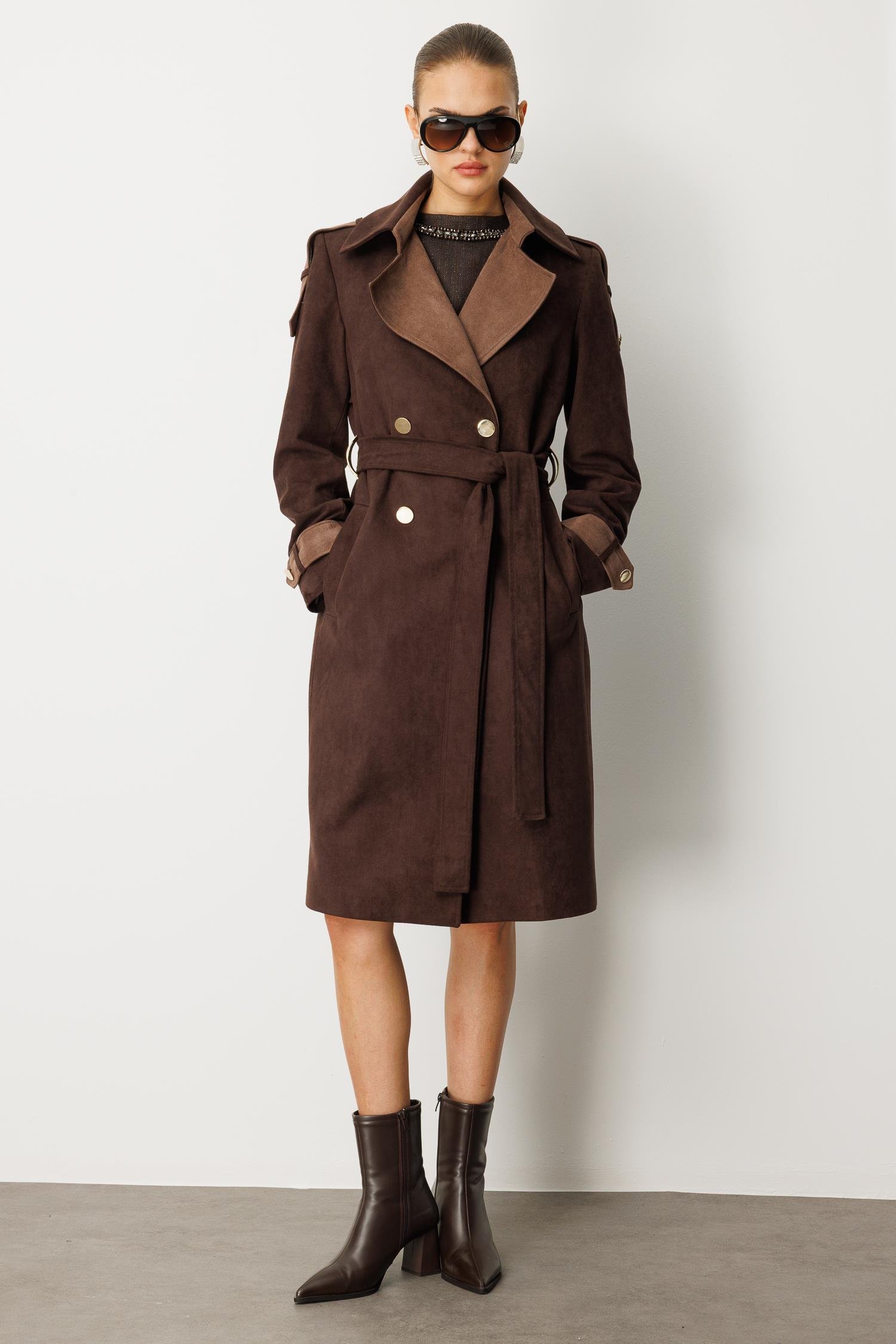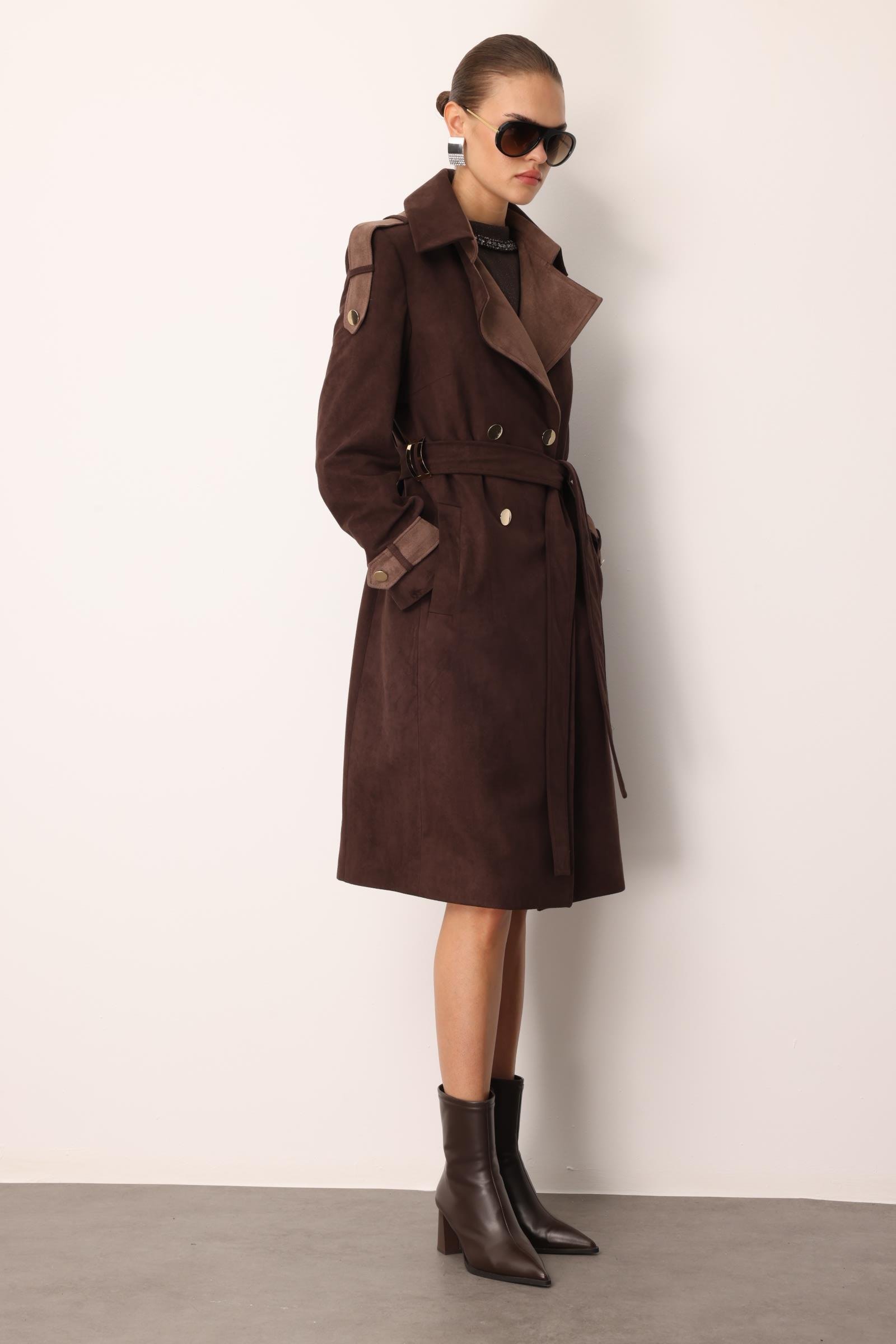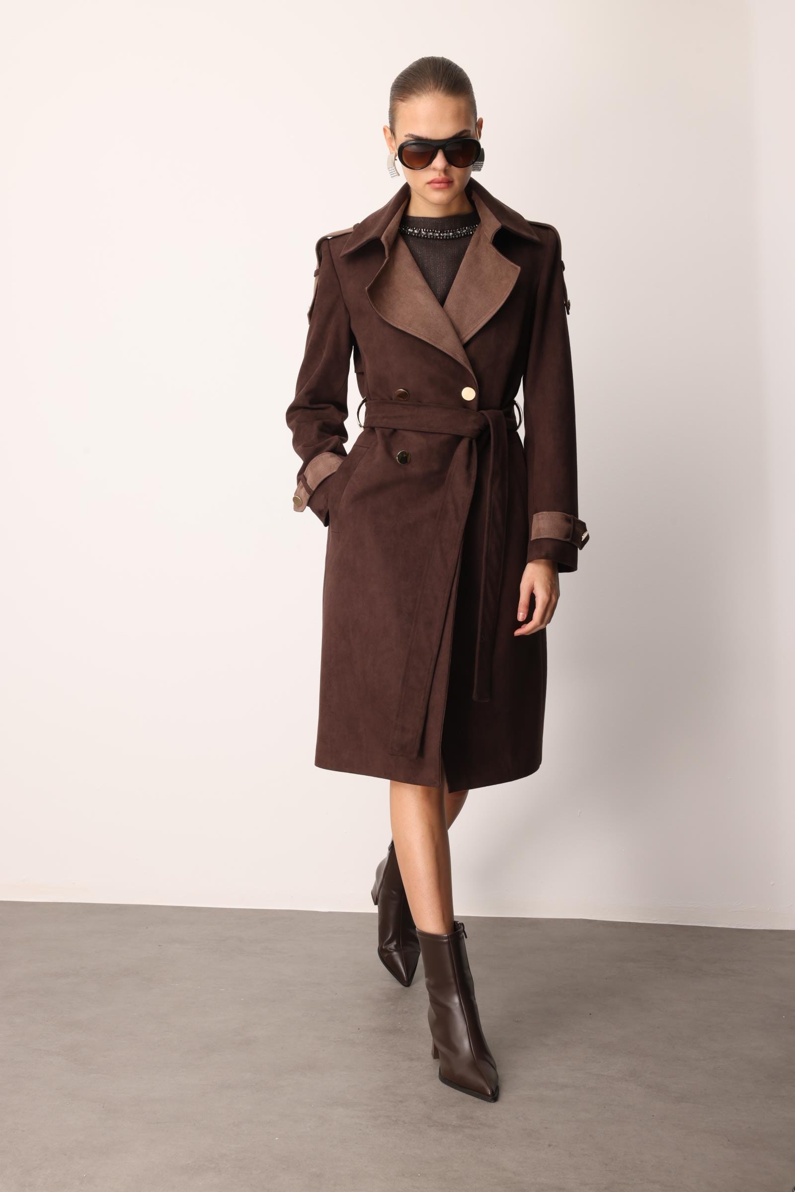 Sonbahar şıklığının en derin ve sofistike hali. Tok duruşlu süet görünümlü kumaşı ve sıcak kahverengi tonuyla bu kaban, lüks bir his yaratır. Büyük çift renkli (kontrast) yakası ve manşet detaylarındaki garniler, ürüne modern ve belirgin bir doku zenginliği katar.