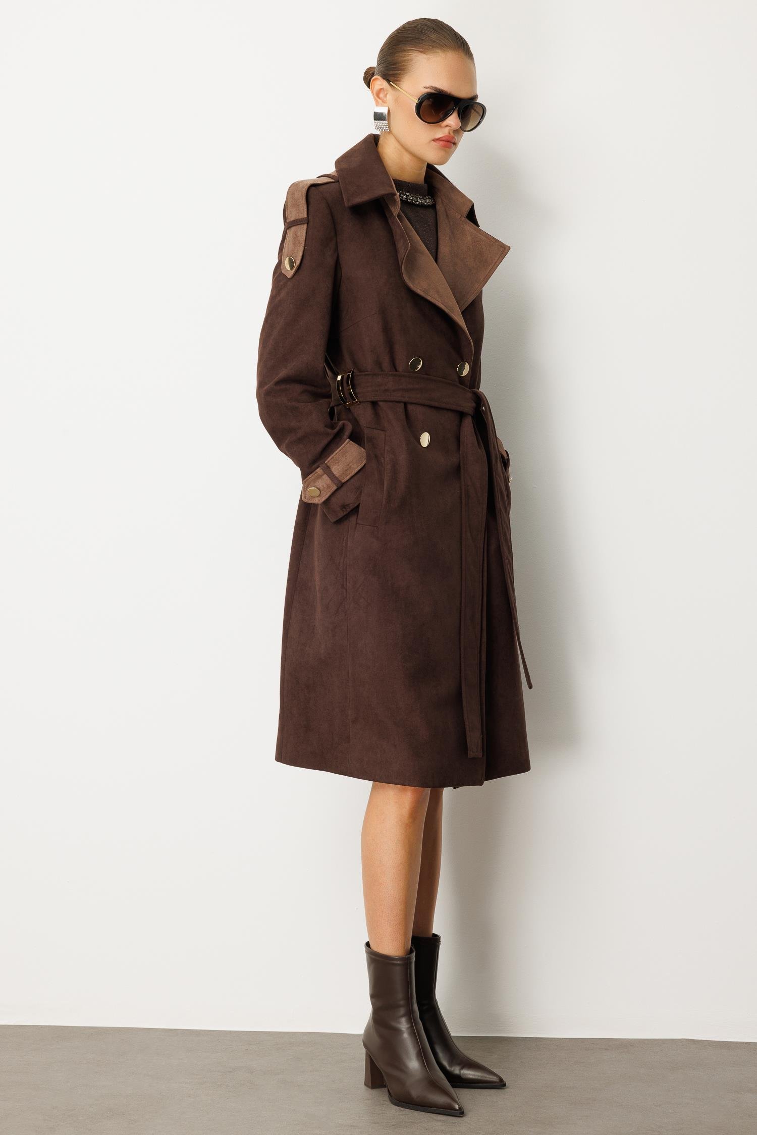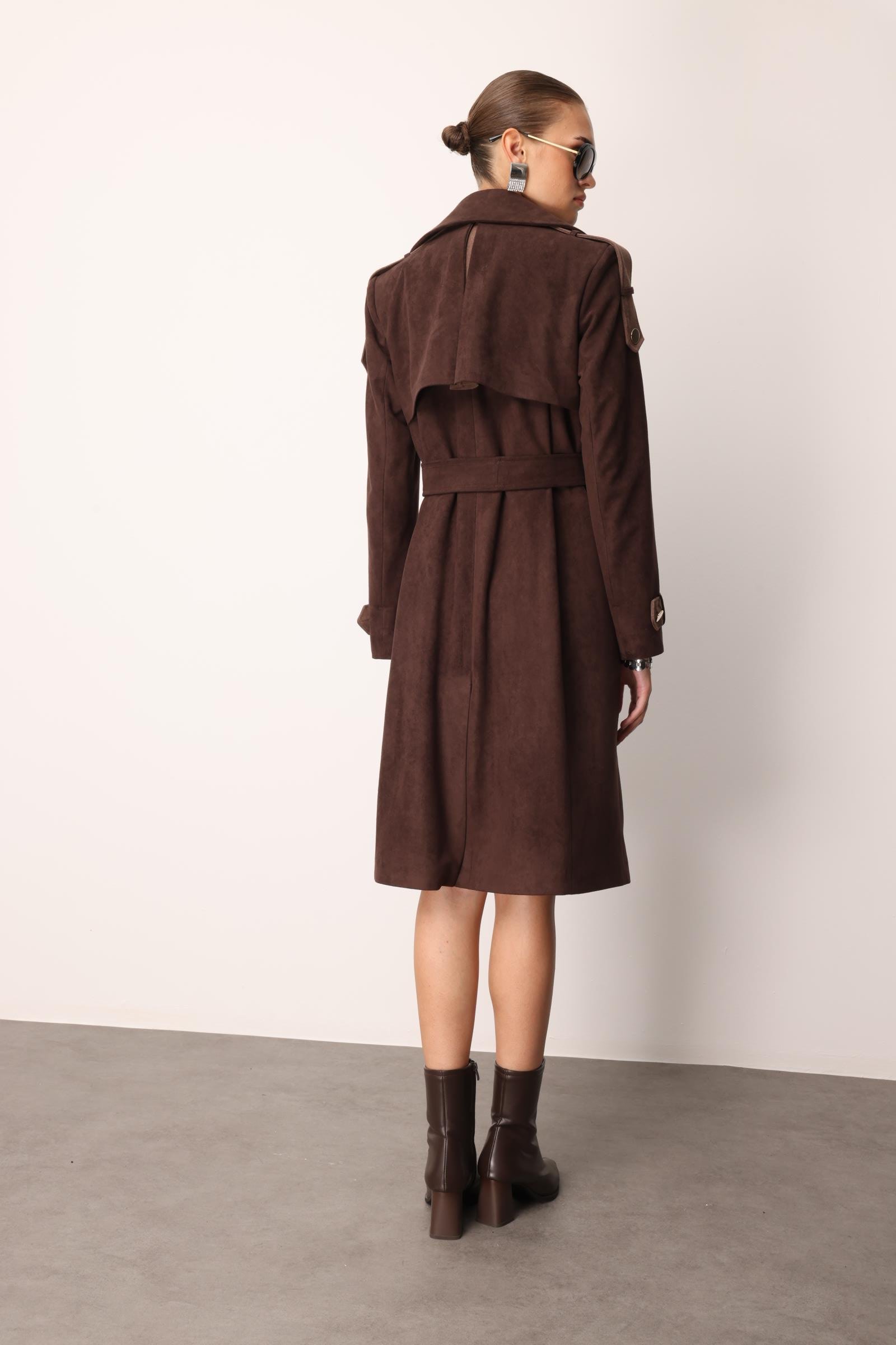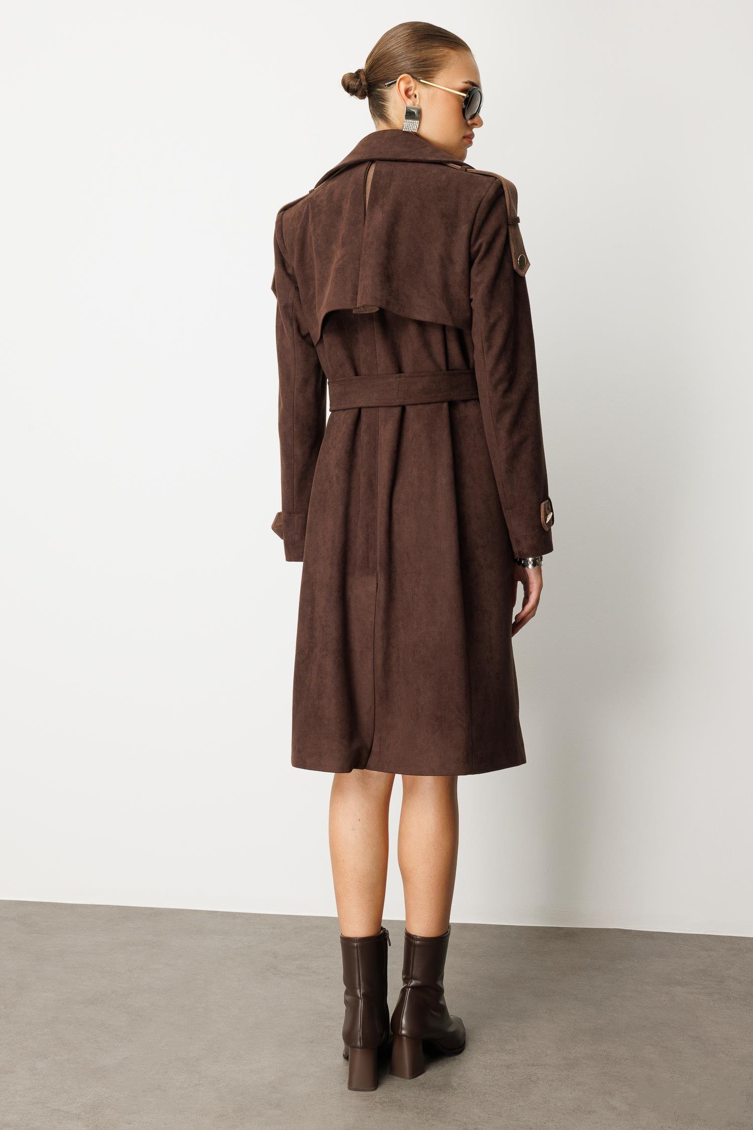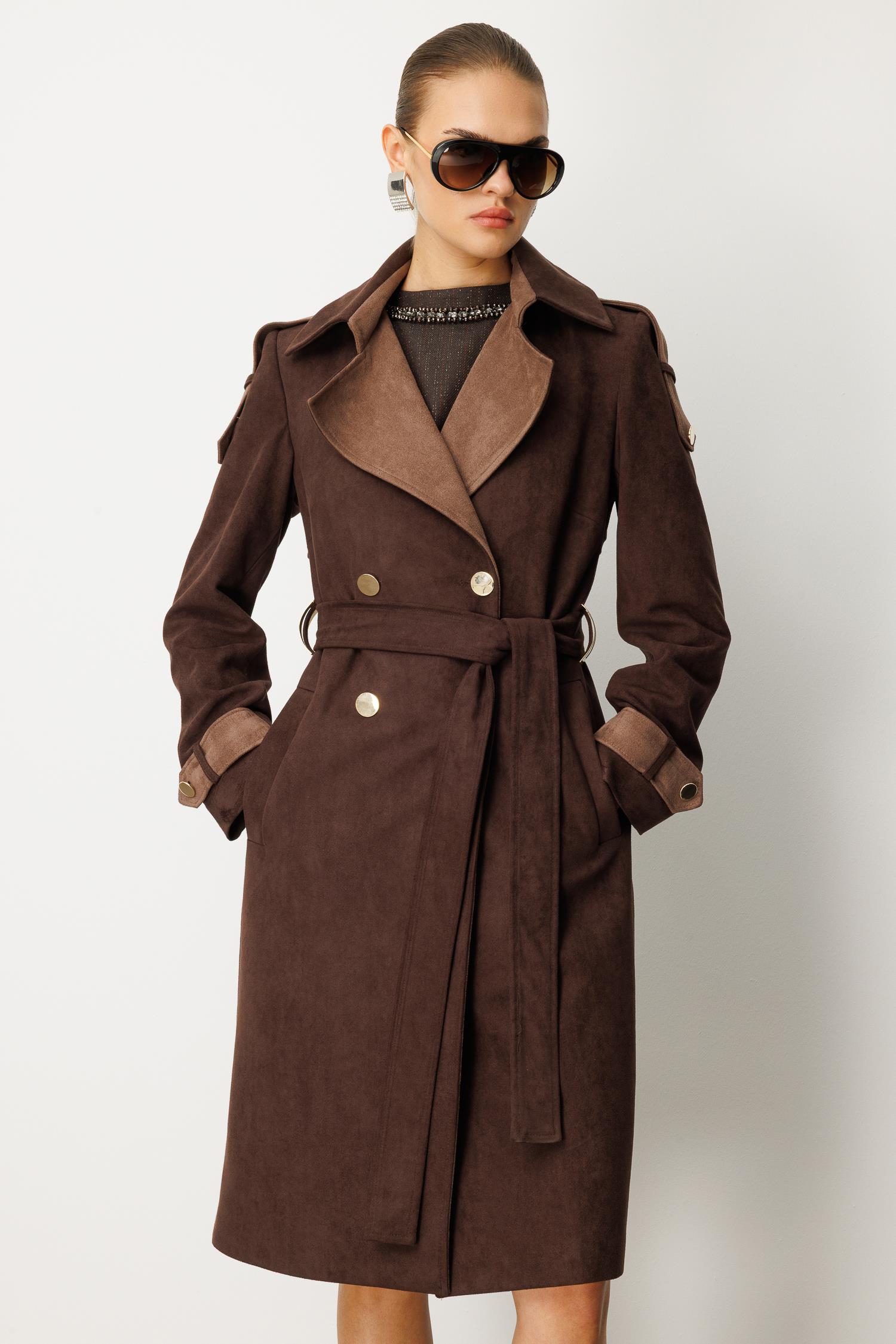 Sonbahar şıklığının en derin ve sofistike hali. Tok duruşlu süet görünümlü kumaşı ve sıcak kahverengi tonuyla bu kaban, lüks bir his yaratır. Büyük çift renkli (kontrast) yakası ve manşet detaylarındaki garniler, ürüne modern ve belirgin bir doku zenginliği katar.
