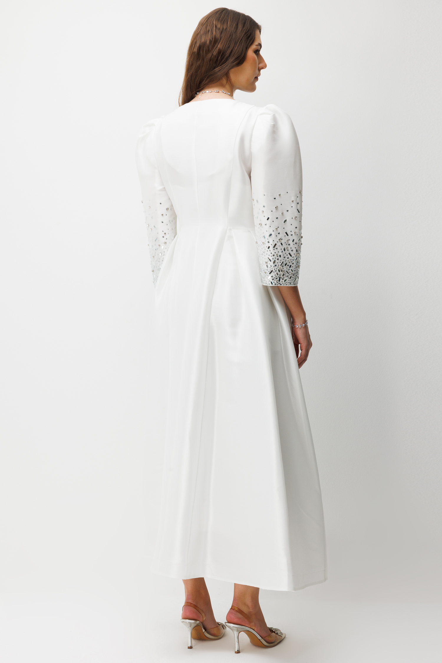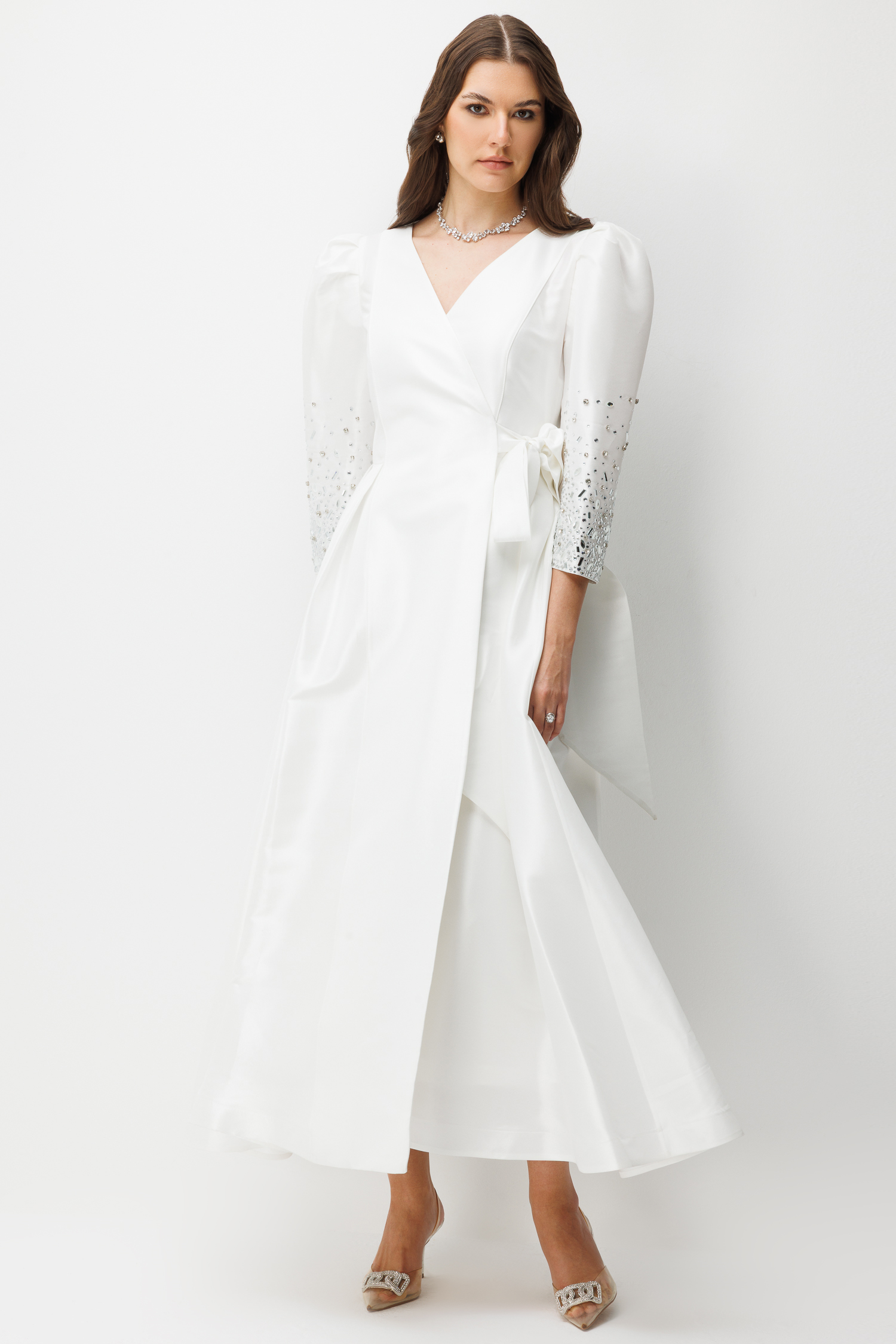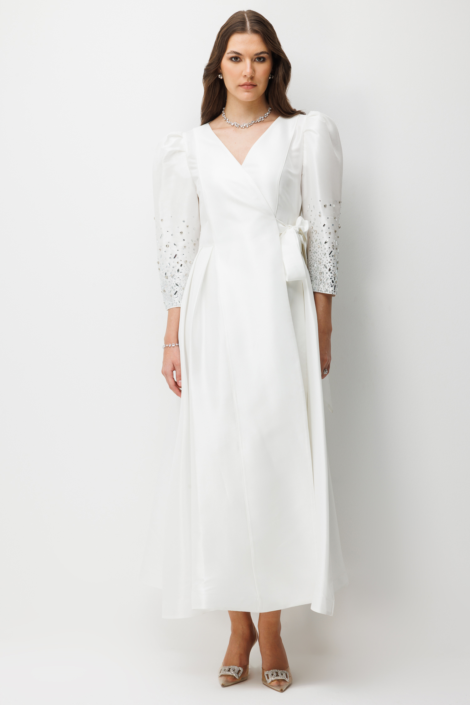 Nefeli'nin özel koleksiyonundan, davetlerin ve özel gecelerin vazgeçilmezi olacak bu kruvaze kapama tafta abiyeyle tanışın! V yaka ve kollardaki taş detayları ile ışıltınızı yansıtan bu elbise, tafta kumaşın asil duruşu ile birleşerek sizi gecenin yıldızı yapacak.
