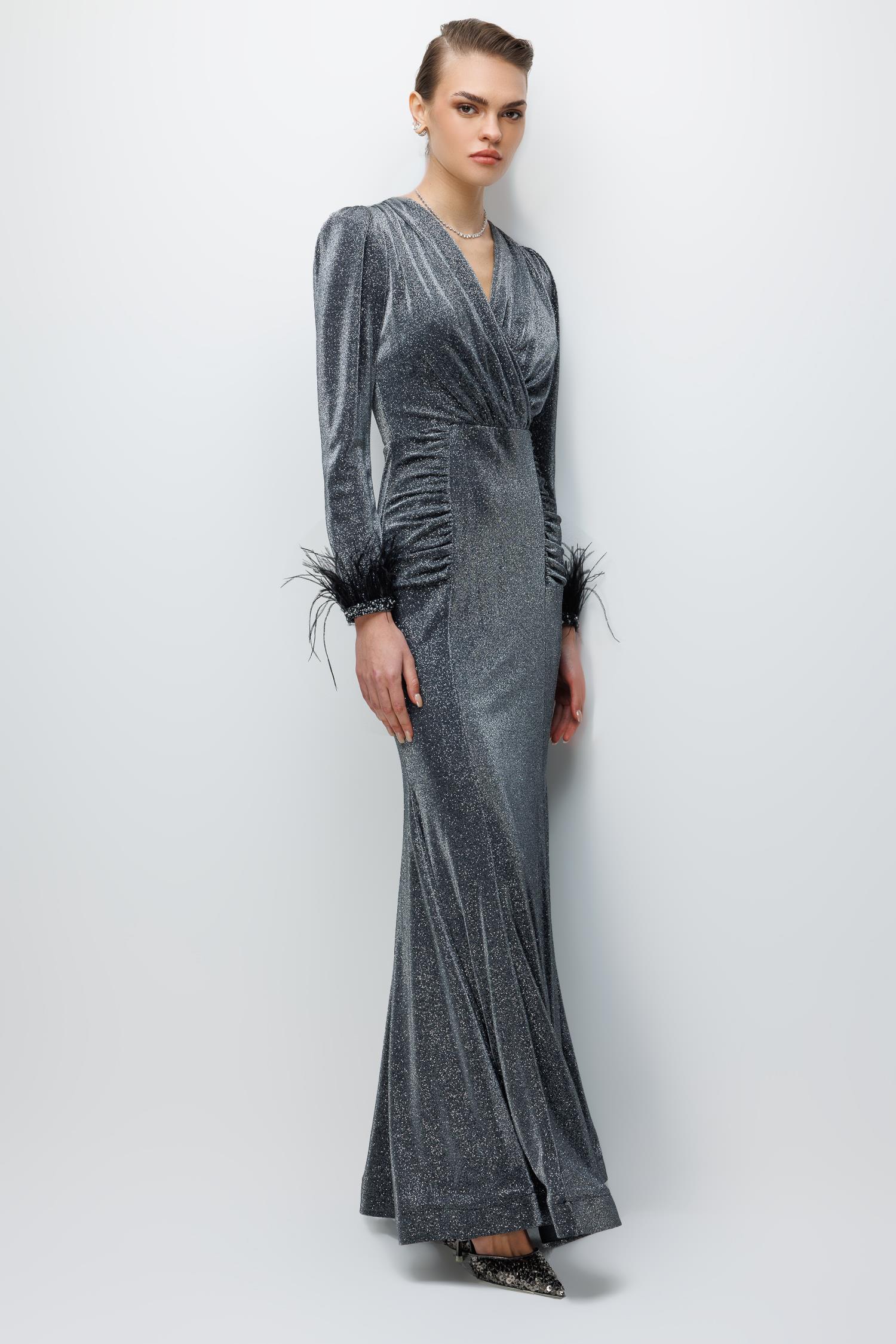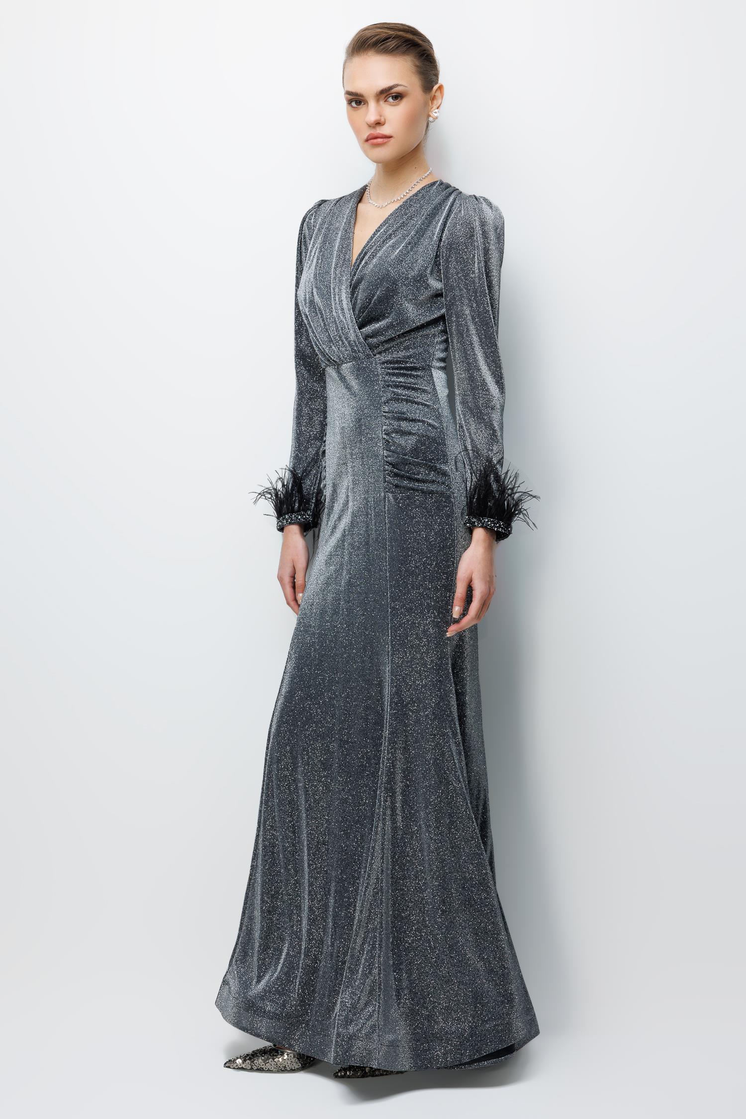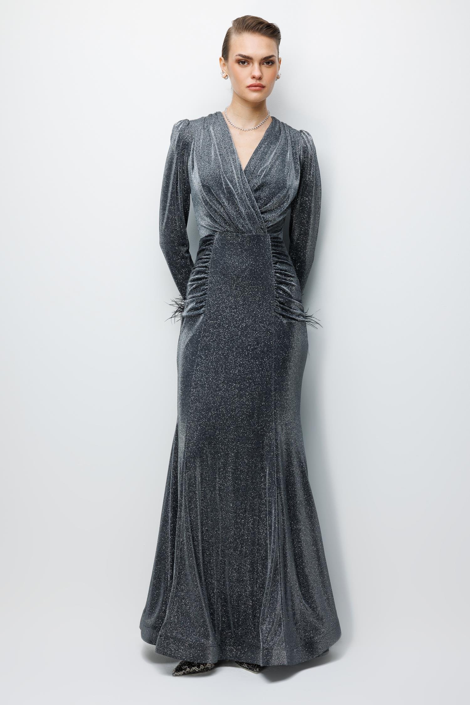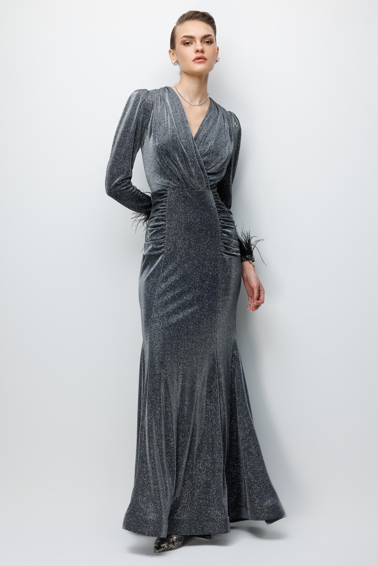 Kol Tüylü Uzun Kol Drape Elbise SAKS Kol Tüylü Uzun Kol Drape Elbise SİYAH Kol Tüylü Uzun Kol Drape Elbise ZÜMRÜT Kol Tüylü Uzun Kol Drape Elbise ANTRASİT