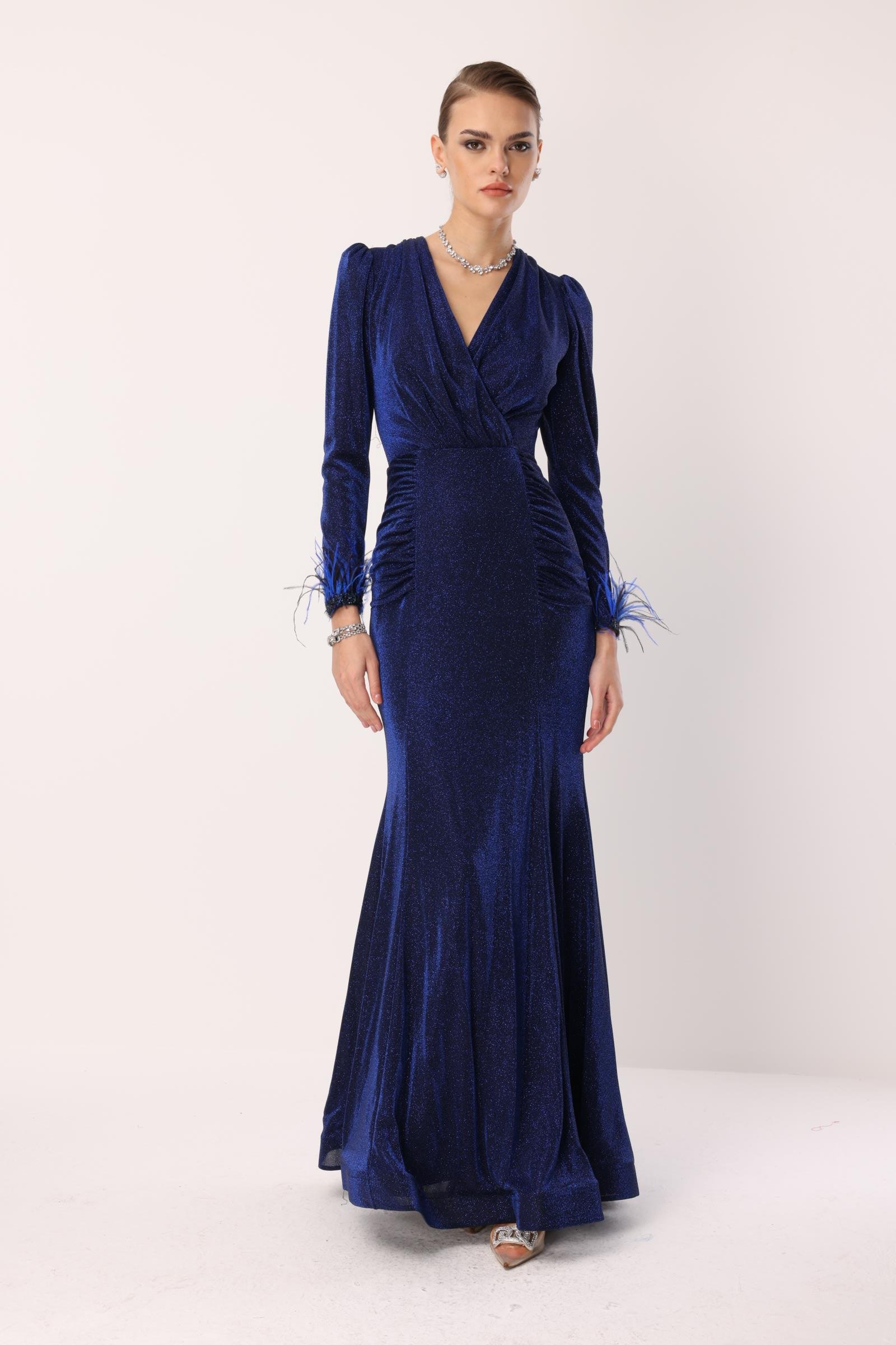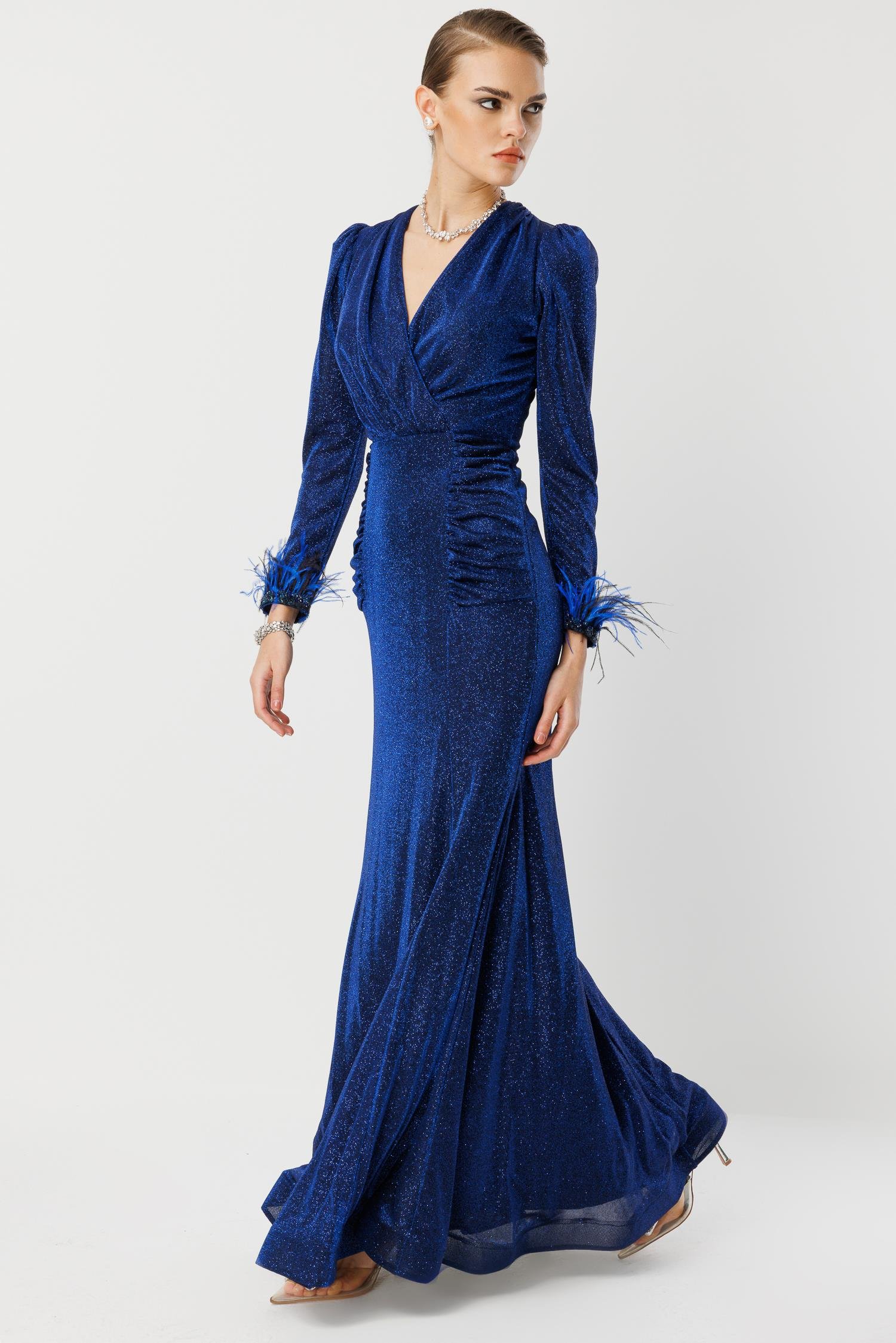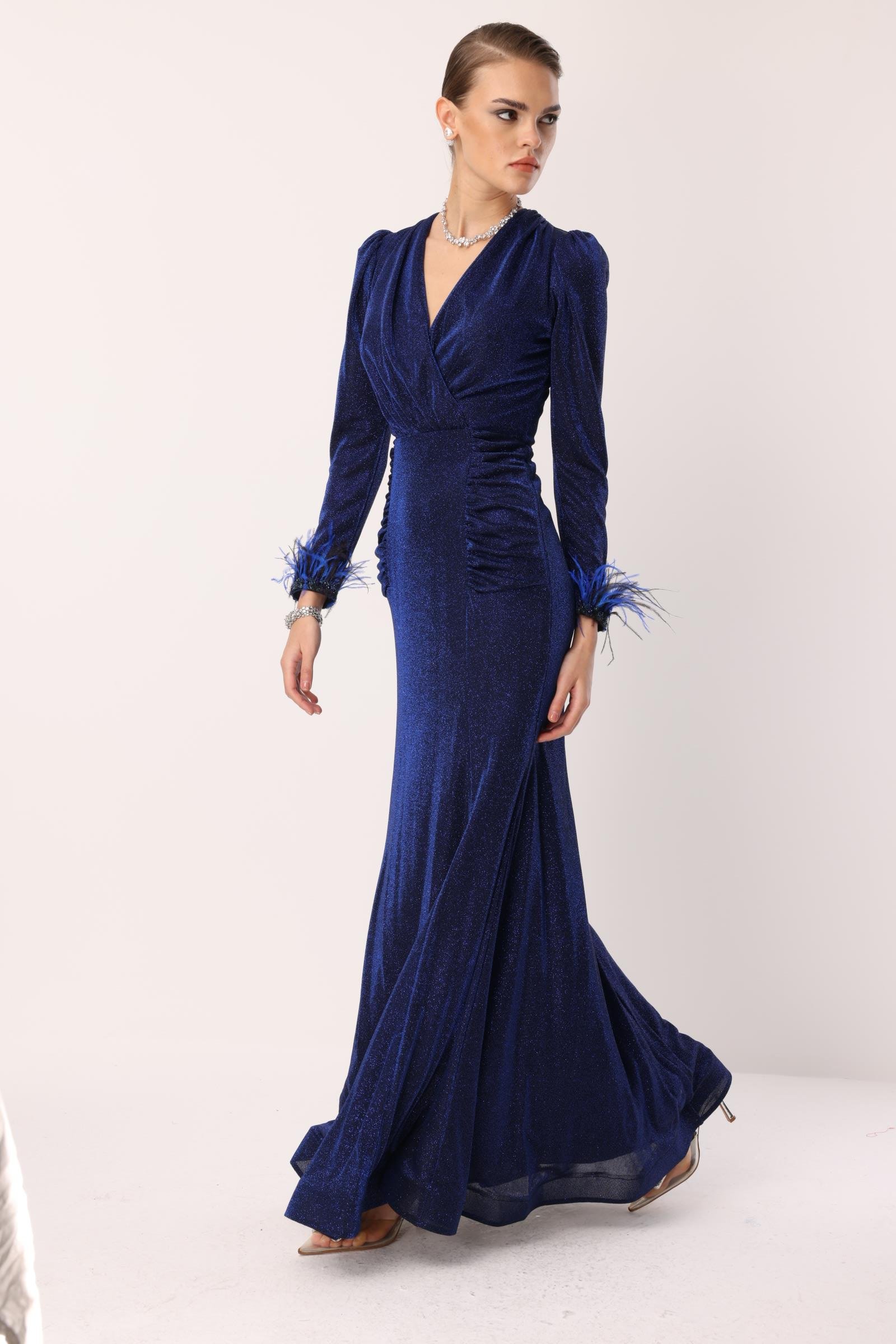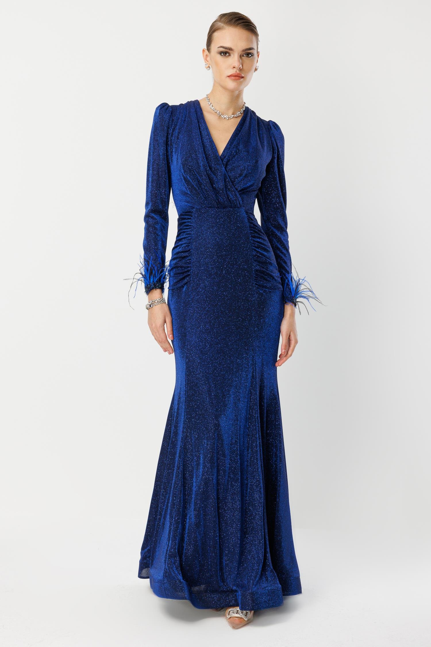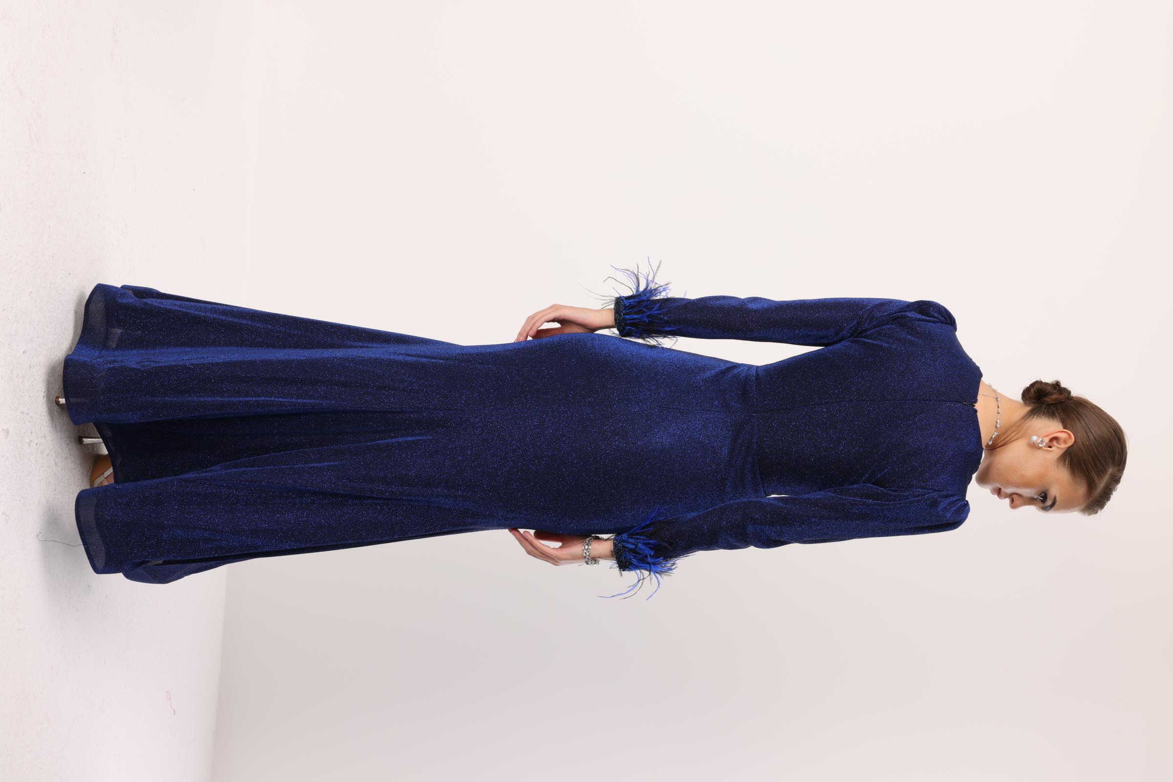 Davetlerin kraliçesi olmaya hazır mısınız? Canlı ve derin Saks Mavisi tonundaki bu abiye elbise, V yaka kesimi, beli saran drape (büzgü) detayları ve en önemlisi kol uçlarındaki dramatik tüyler ile tüm bakışları üzerinize çekecek. Hafif ışıltılı kumaşı, her hareketinizde zarifçe parlar ve özel anlarınıza lüks bir dokunuş katar.