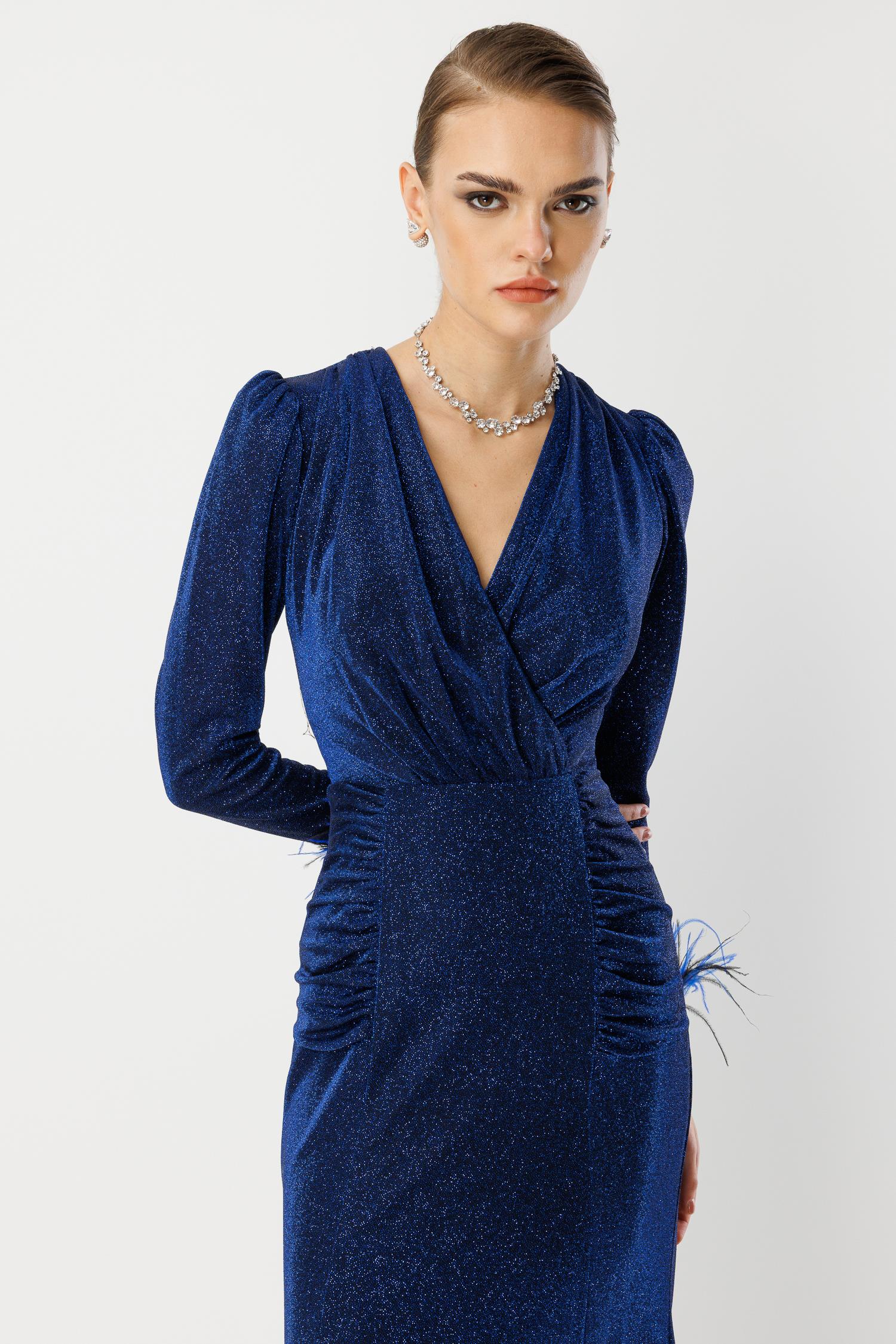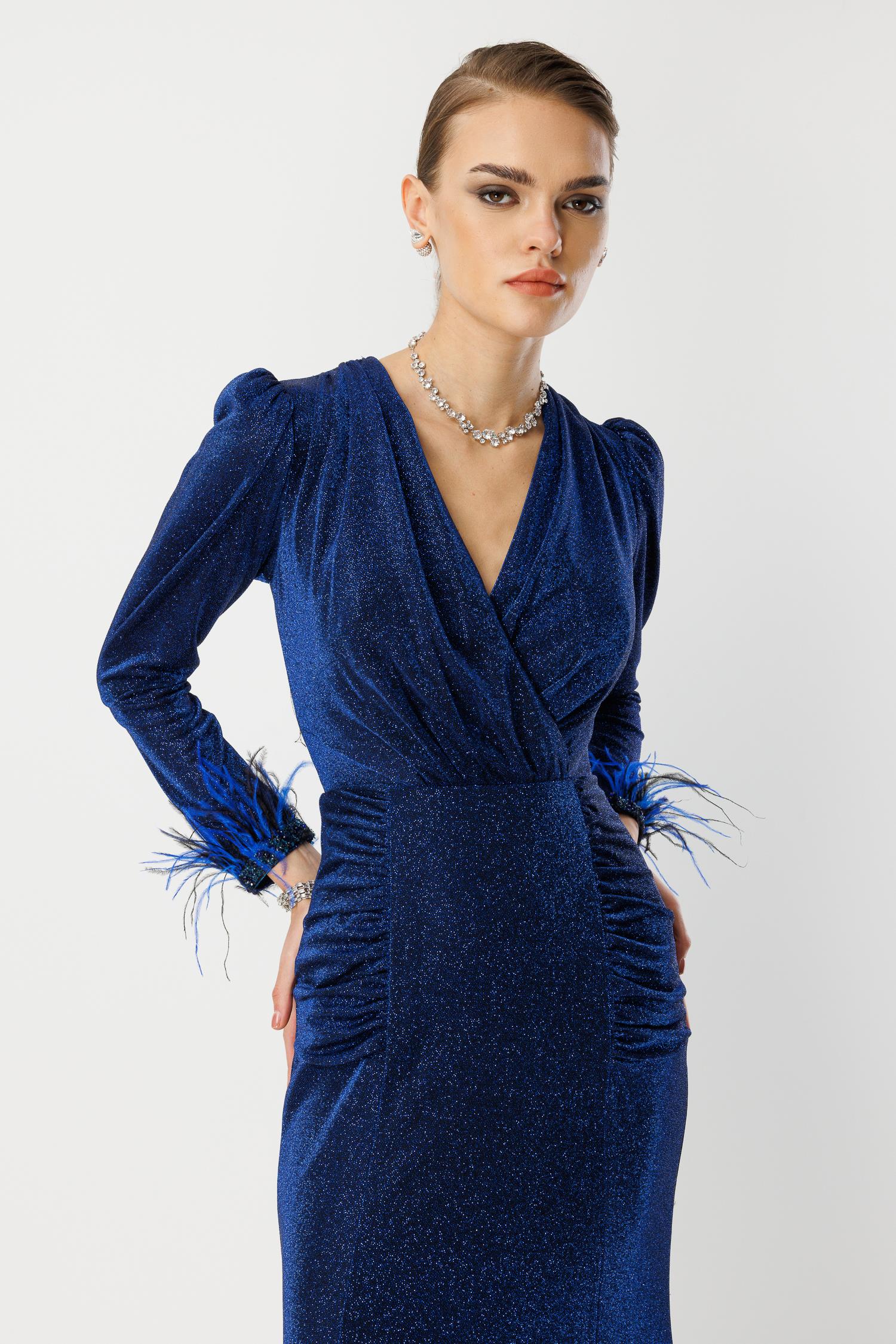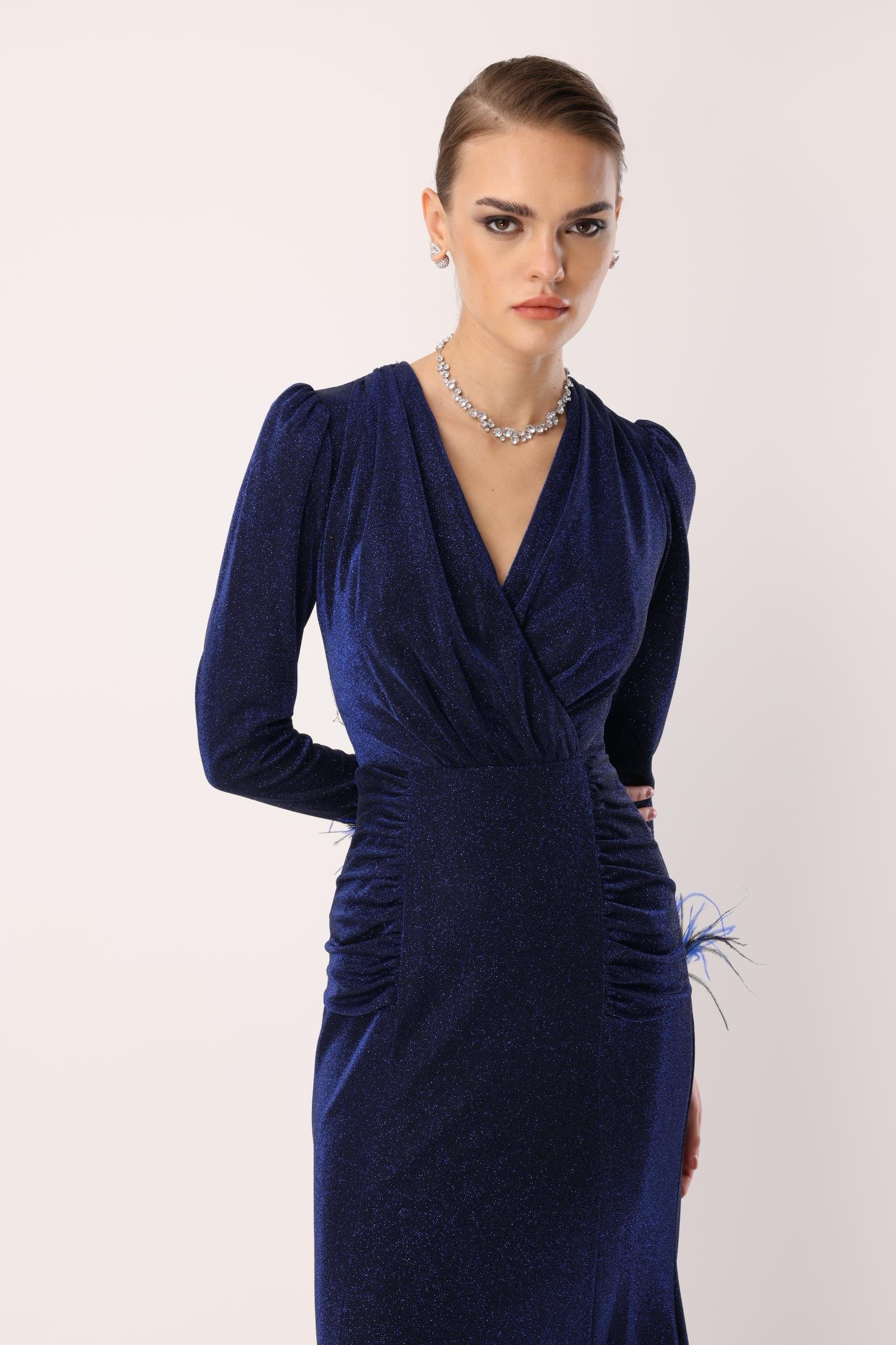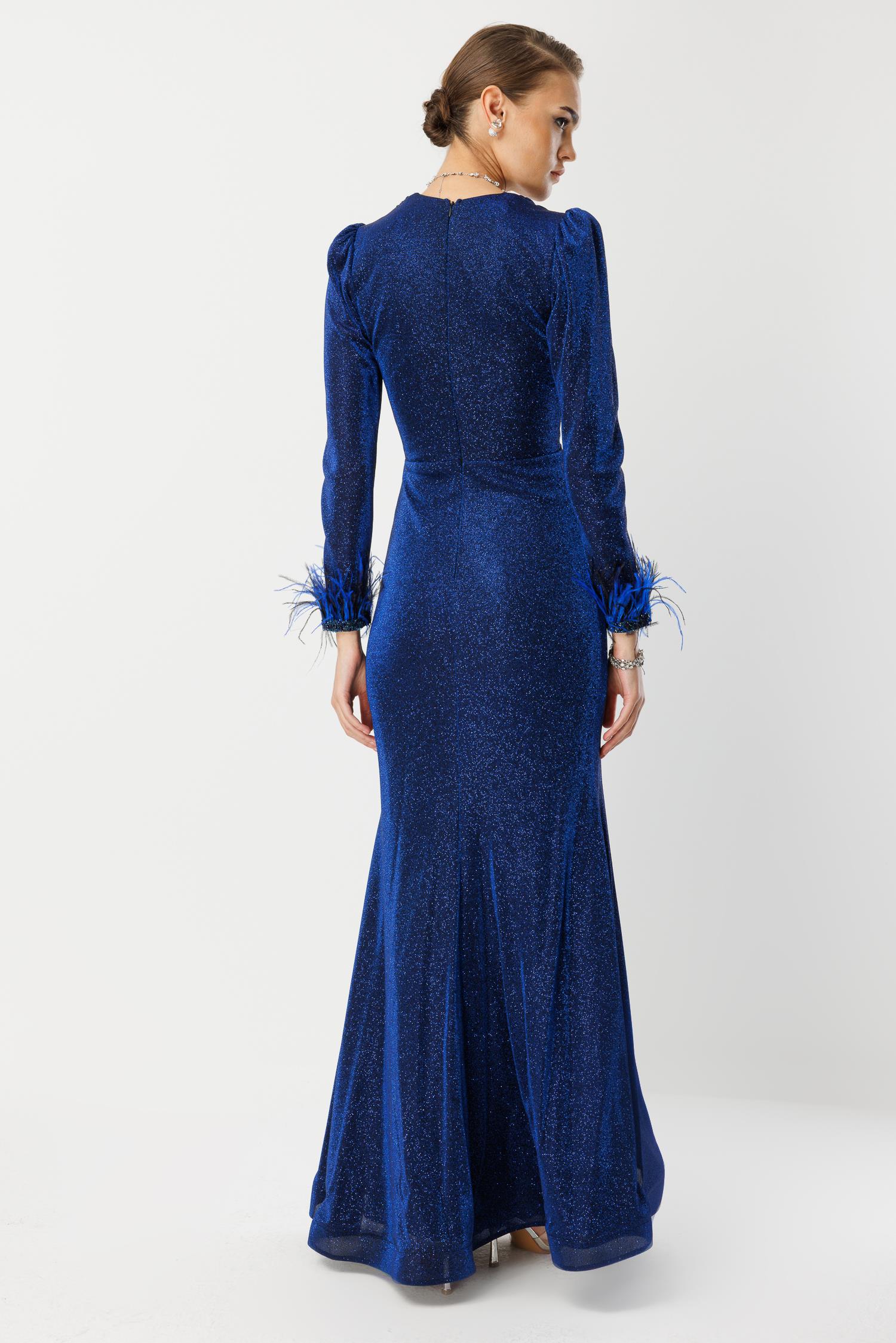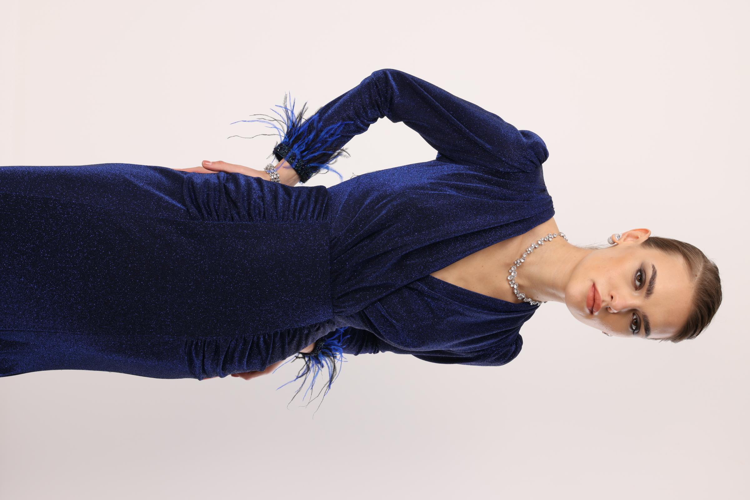 Davetlerin kraliçesi olmaya hazır mısınız? Canlı ve derin Saks Mavisi tonundaki bu abiye elbise, V yaka kesimi, beli saran drape (büzgü) detayları ve en önemlisi kol uçlarındaki dramatik tüyler ile tüm bakışları üzerinize çekecek. Hafif ışıltılı kumaşı, her hareketinizde zarifçe parlar ve özel anlarınıza lüks bir dokunuş katar.