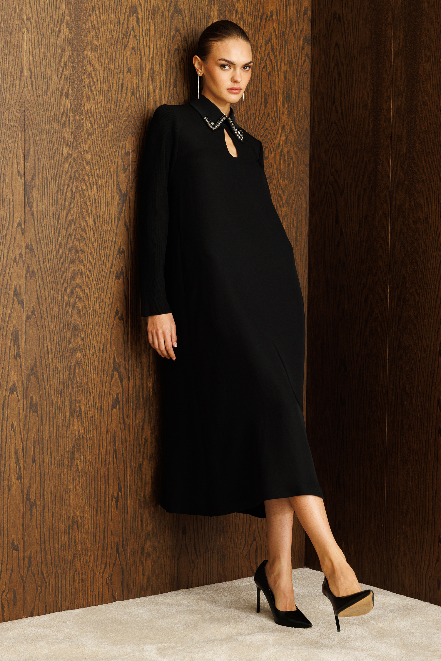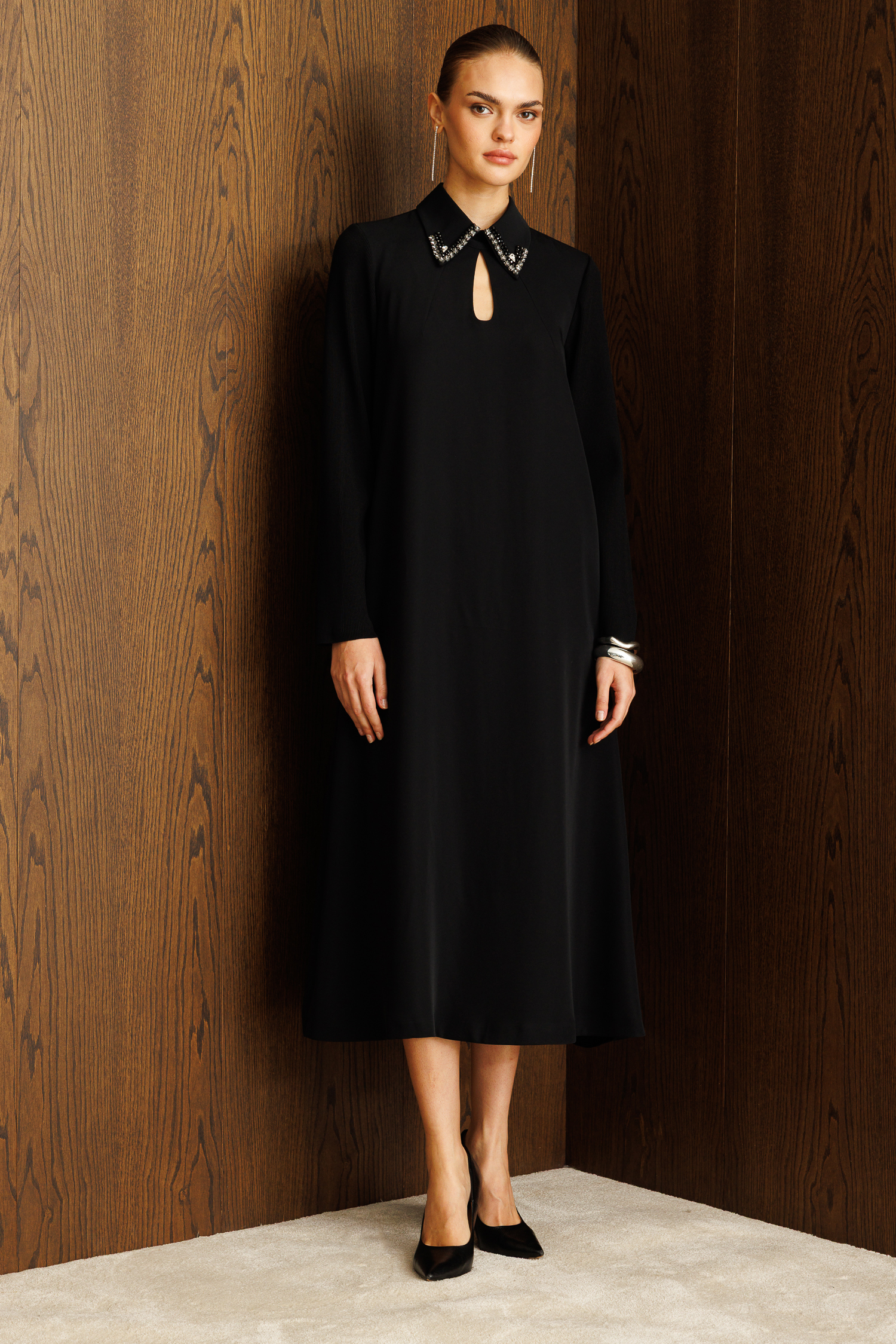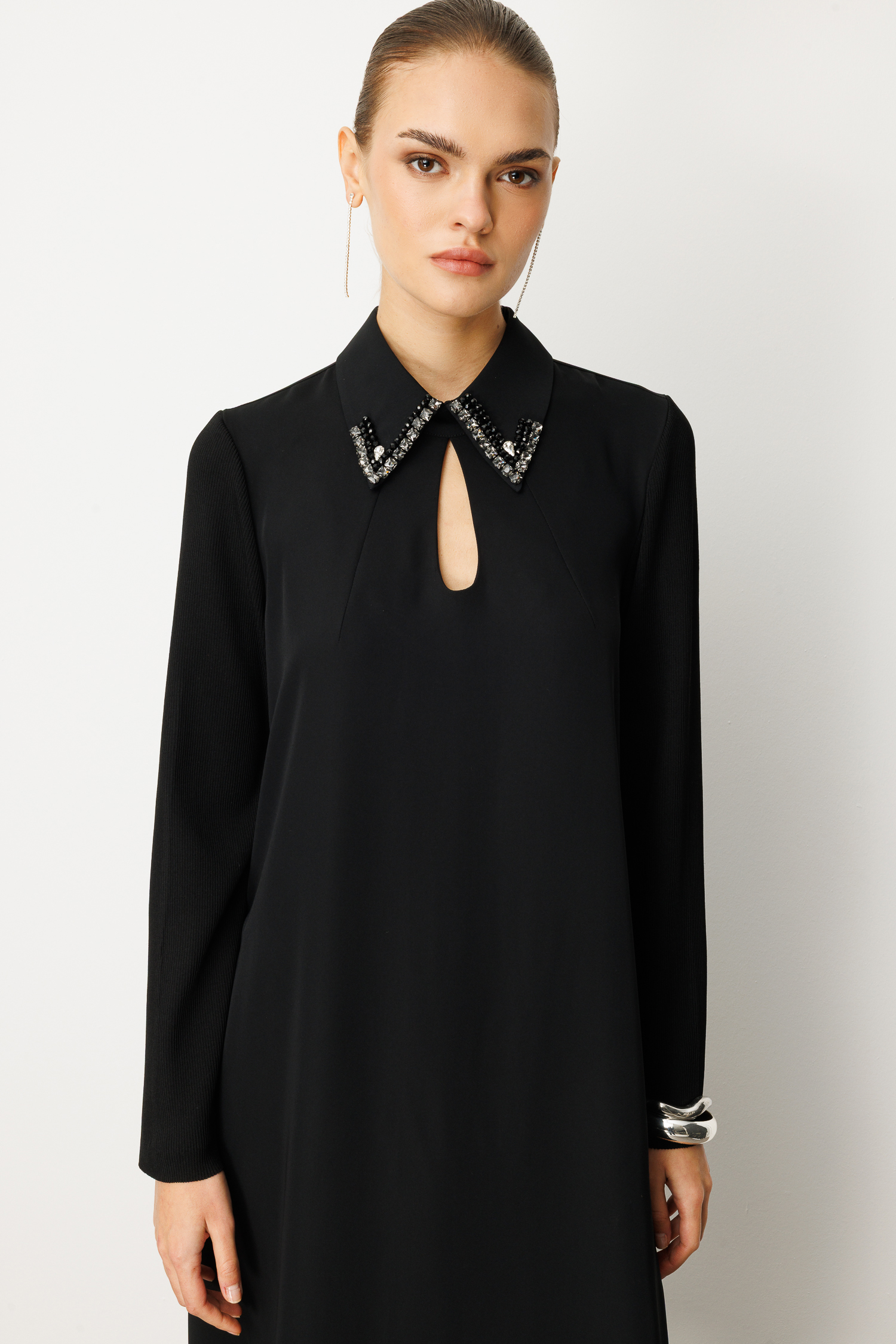 Detaylar: Gömlek yaka üzerine işlenmiş el işçiliği görünümlü ışıltılı taşlar ve ön kısımdaki ikonik pencere dekoltesiyle dikkat çeker.