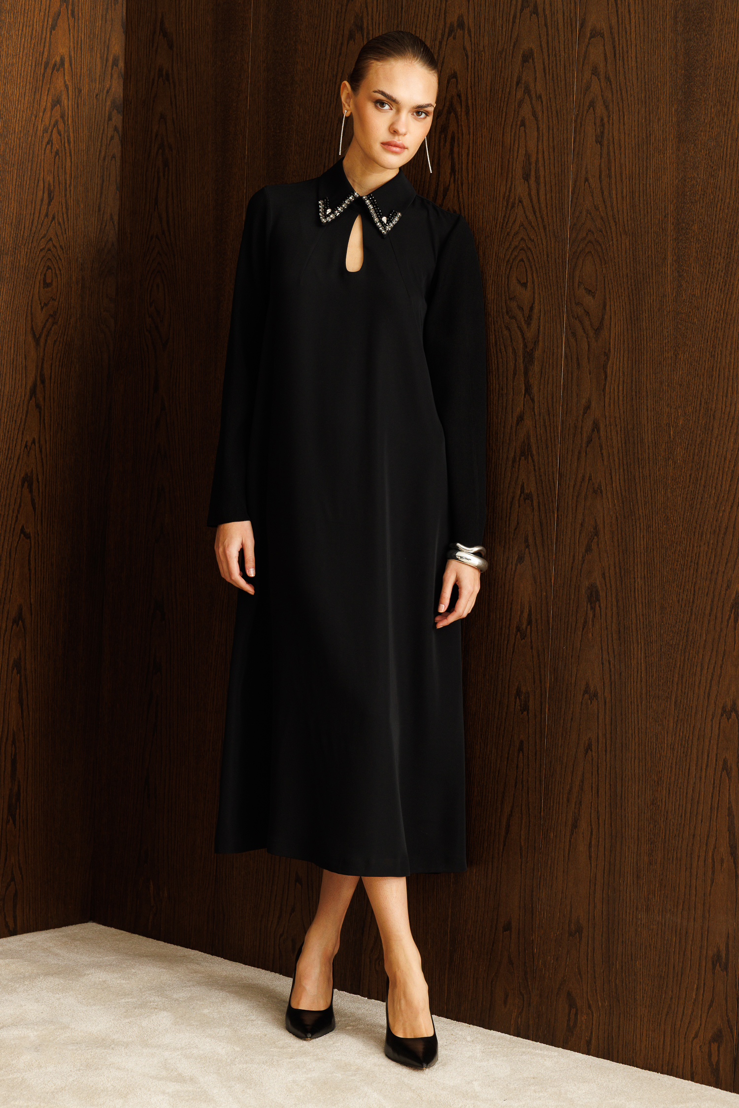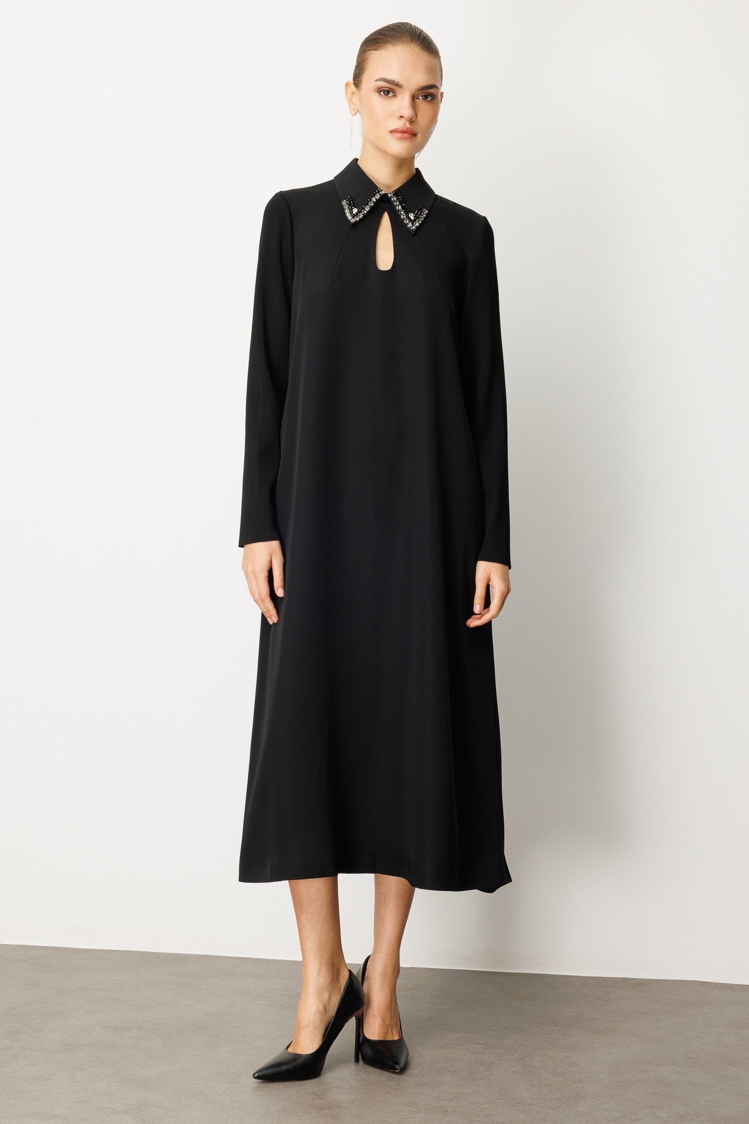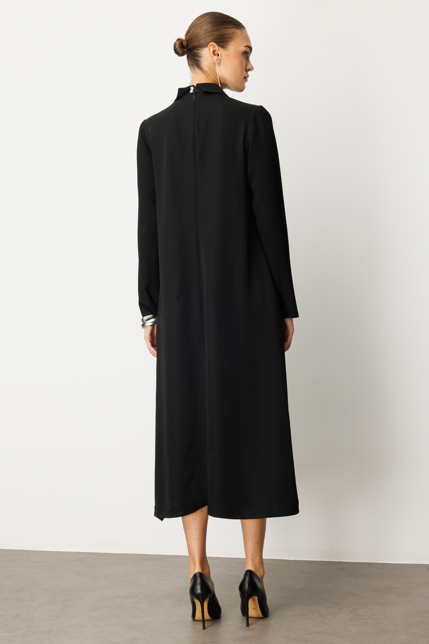 Sofistike detayların konforlu kesimle buluştuğu bu özel tasarım, gardırobunuzun en asil parçası olmaya hazır. Dokulu triko kollar ve pürüzsüz gövde kumaşının kusursuz uyumuyla tasarlanan elbise, her adımda zarafeti temsil eder.
