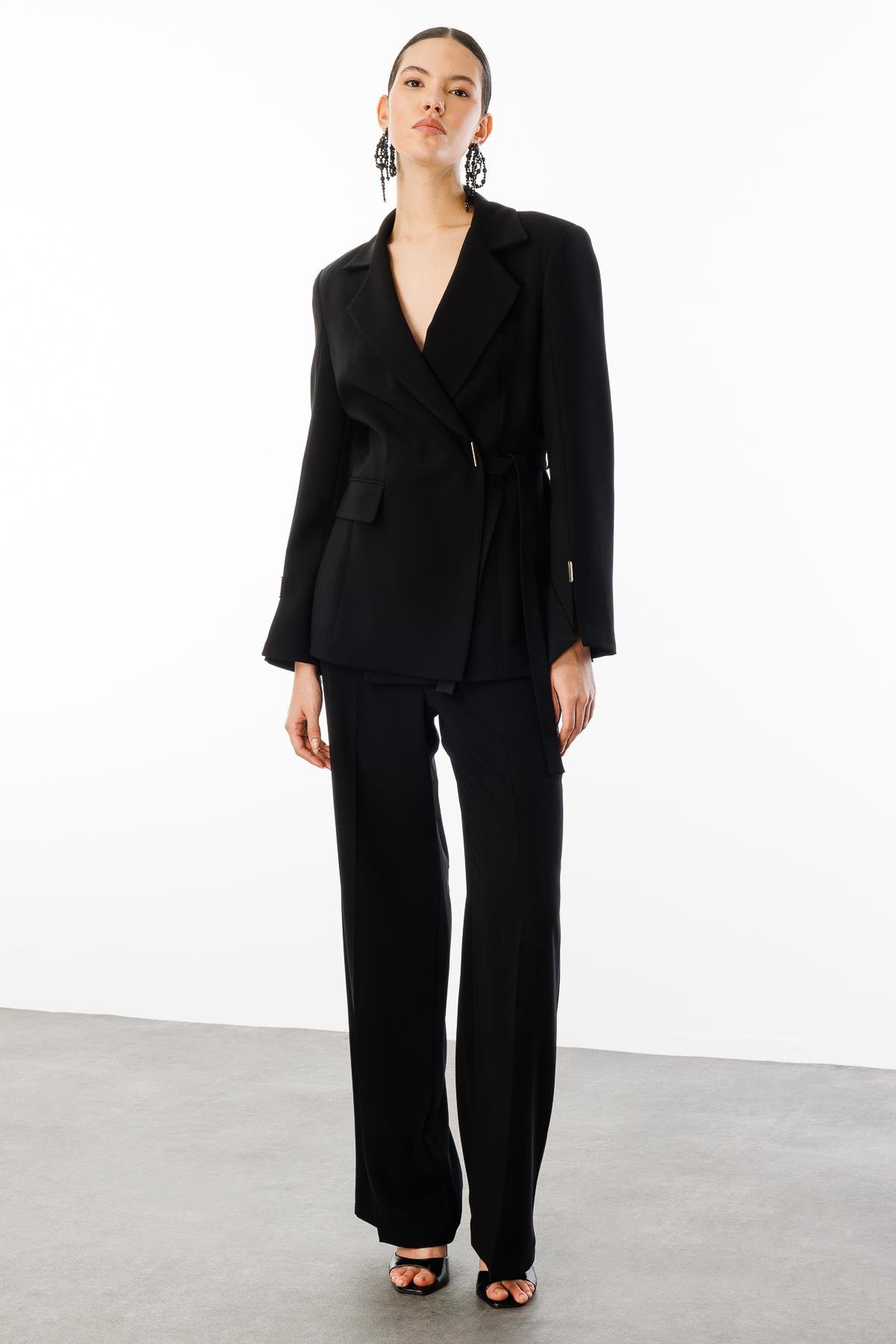 Hem sofistike hem de modern bir görünüm sunan bu siyah takımla tanışın! Kruvaze kesimi, bel kuşak detayı, kuşaklı bel tasarımı ve yan yırtmaçları ile dikkat çeken bu takım, özel anlarınızda ve günlük stilinizde fark yaratacak.