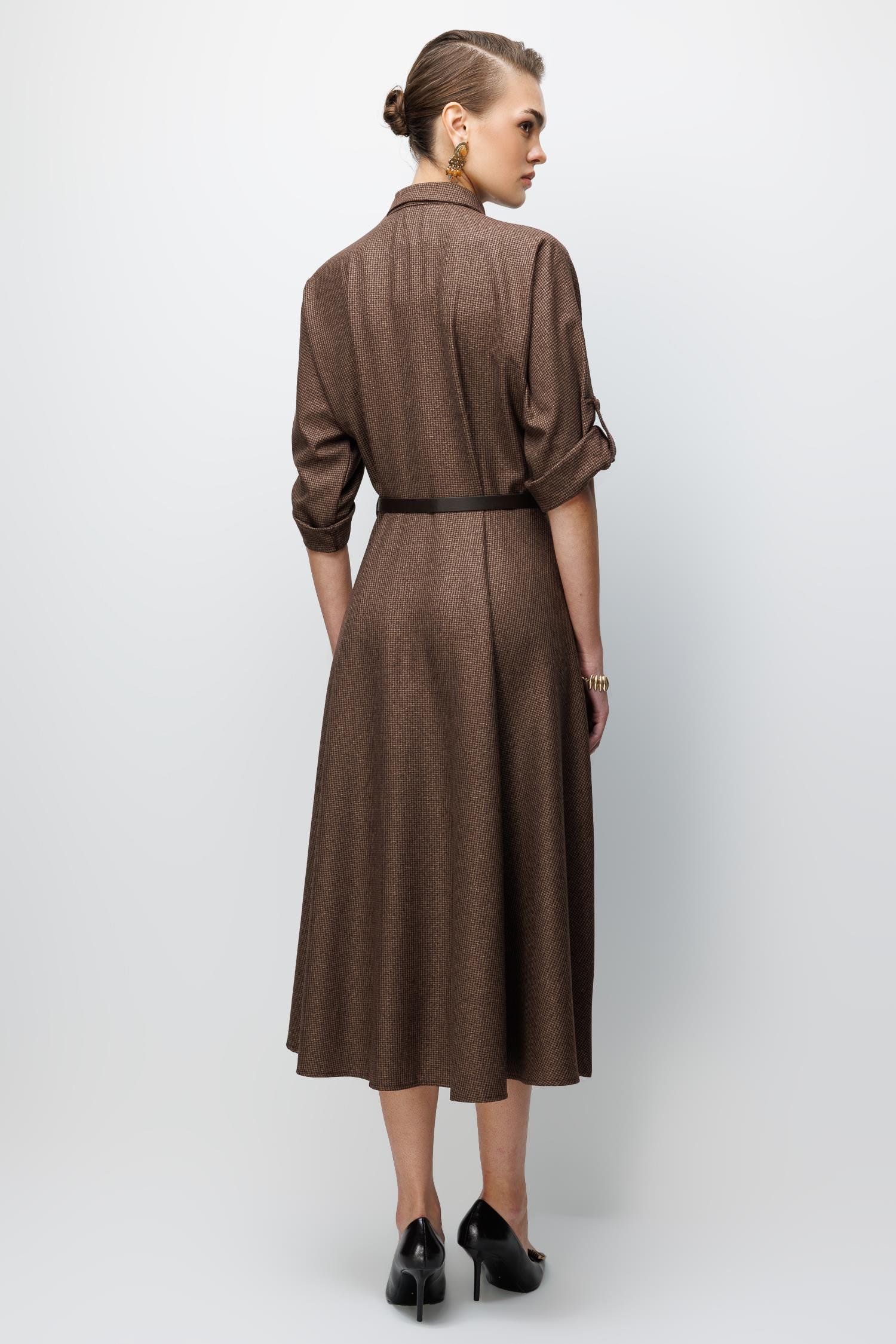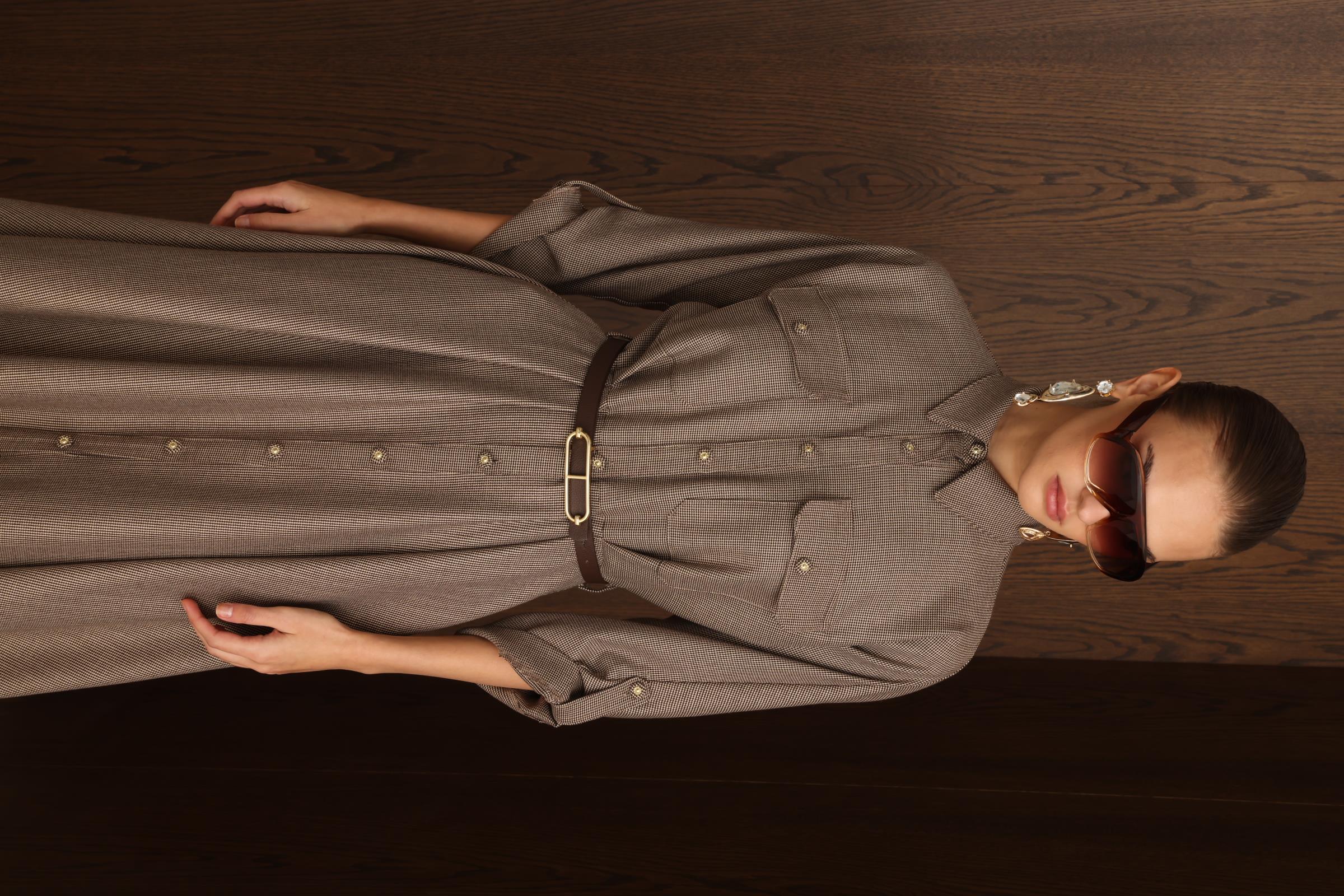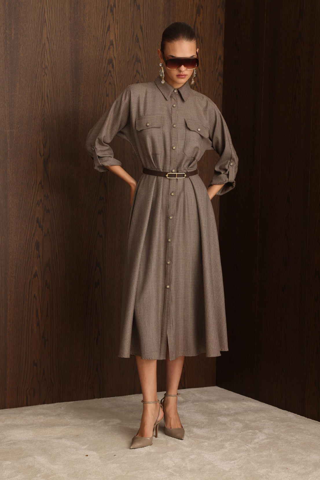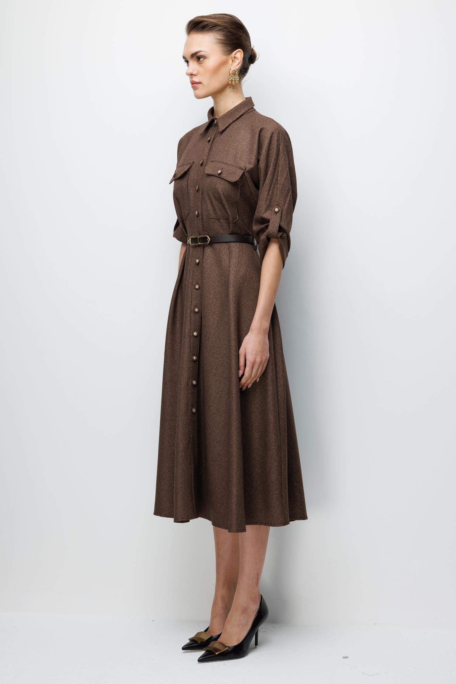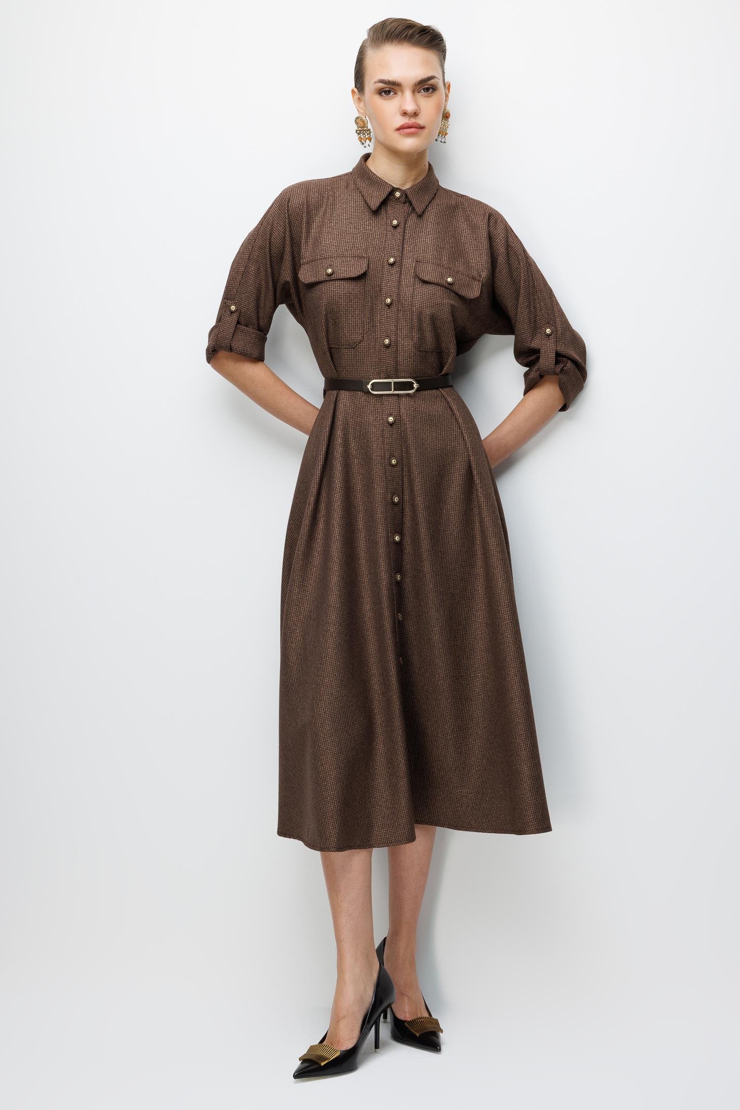 Kumaş: Yumuşak dokulu, zarif kahve/camel tonlarında mikro desenli kumaş.