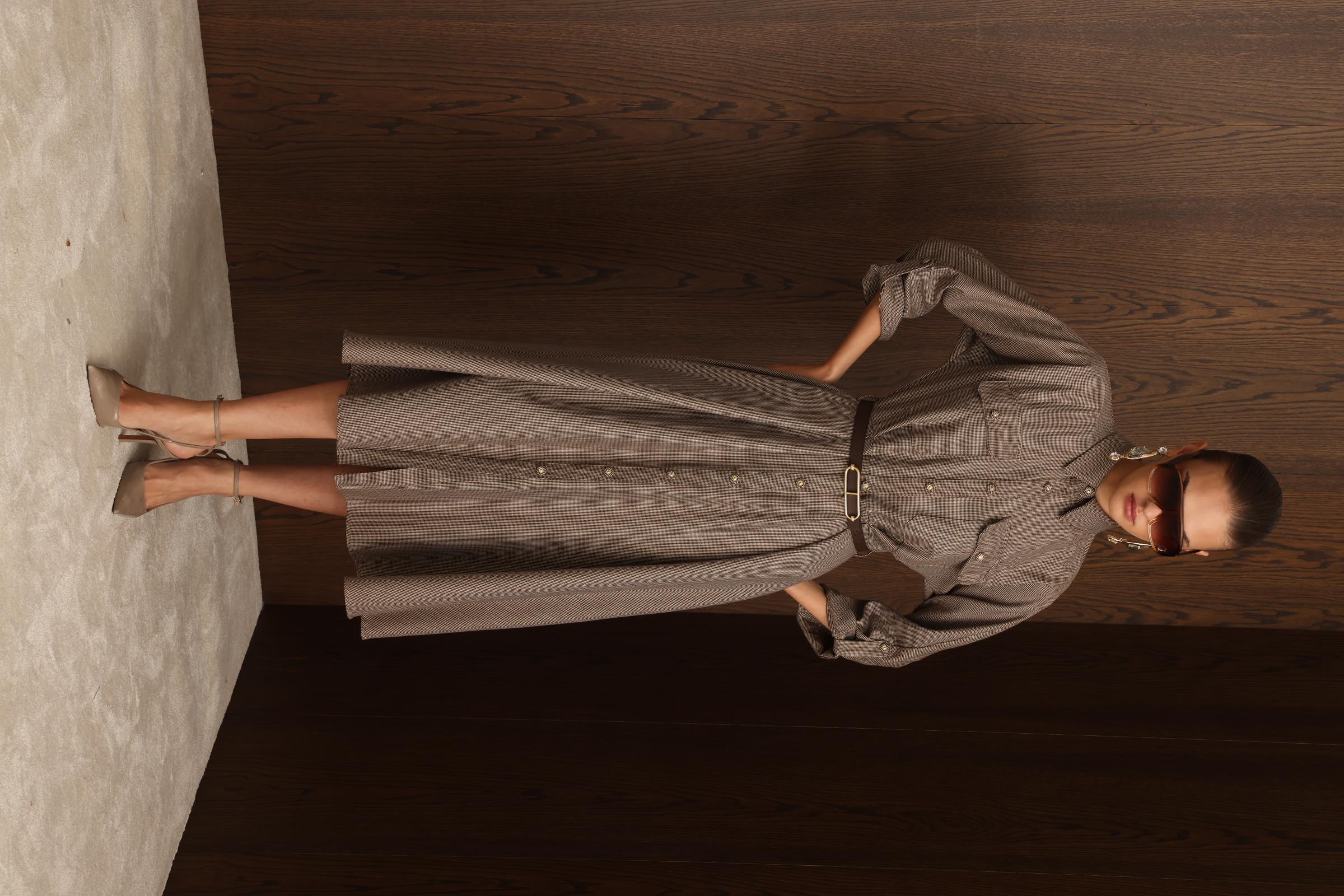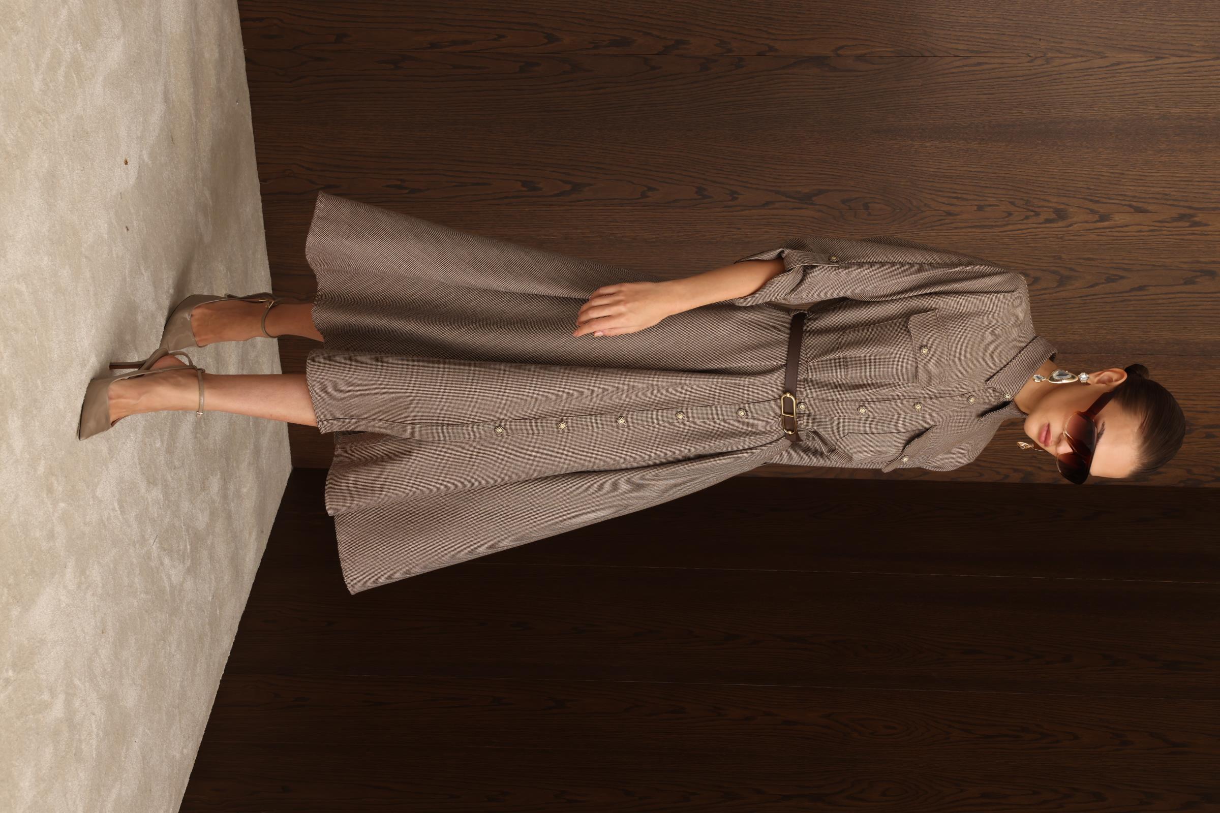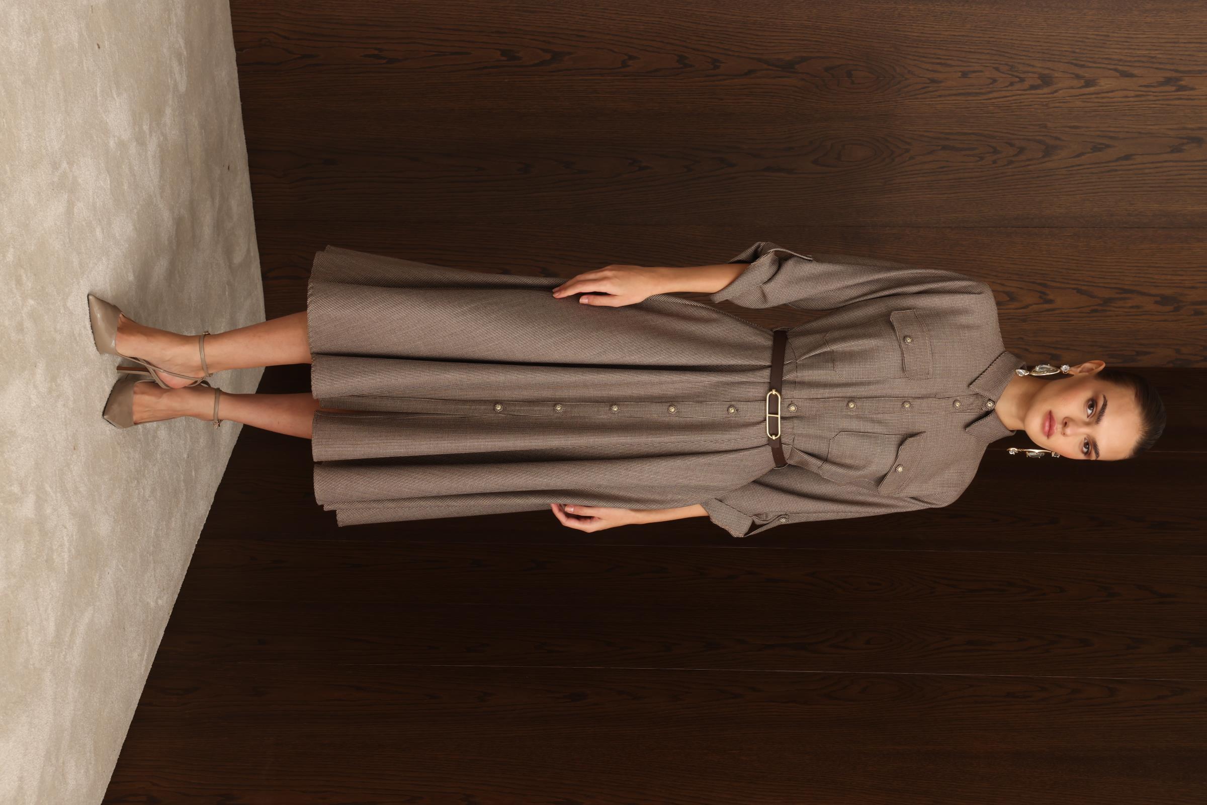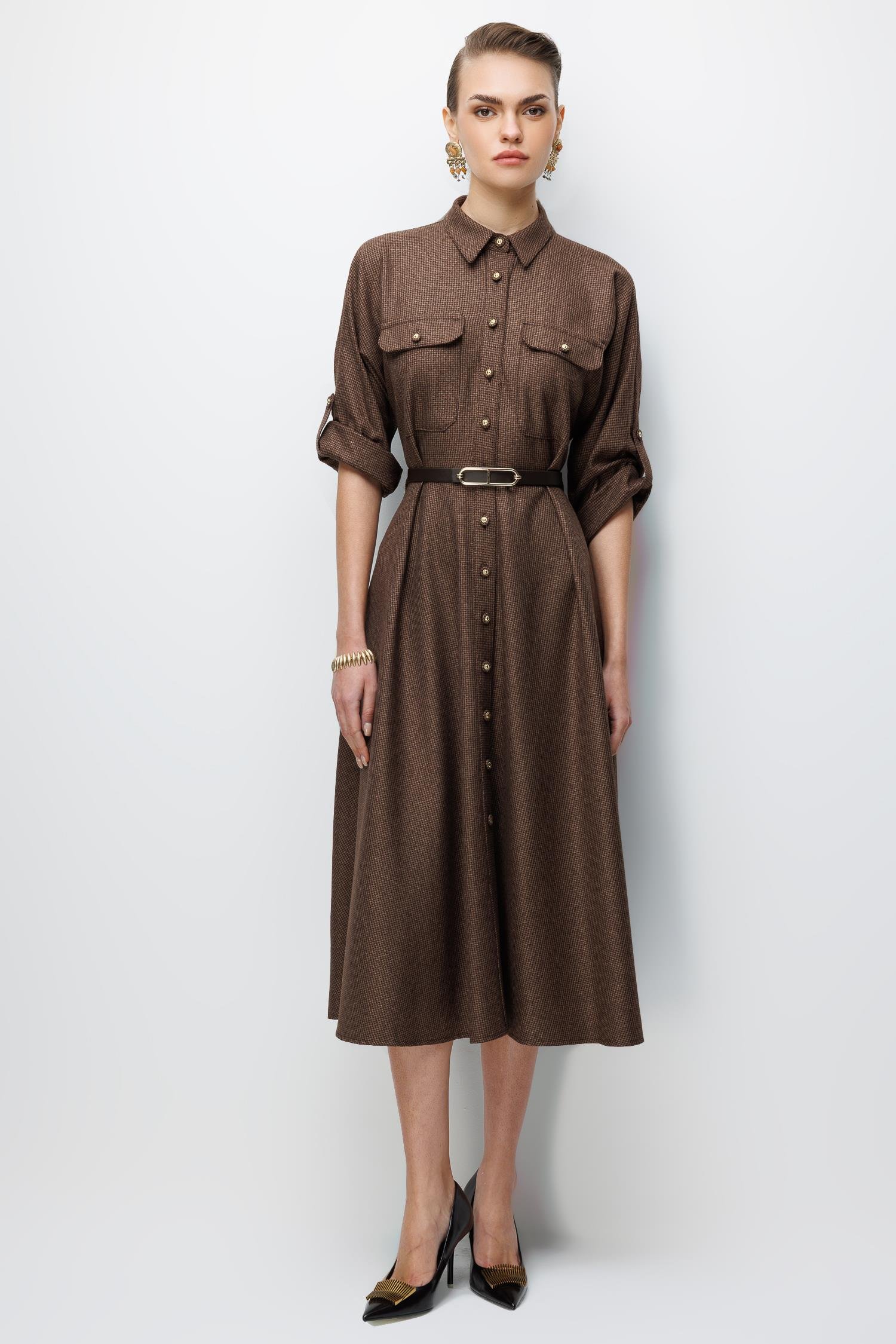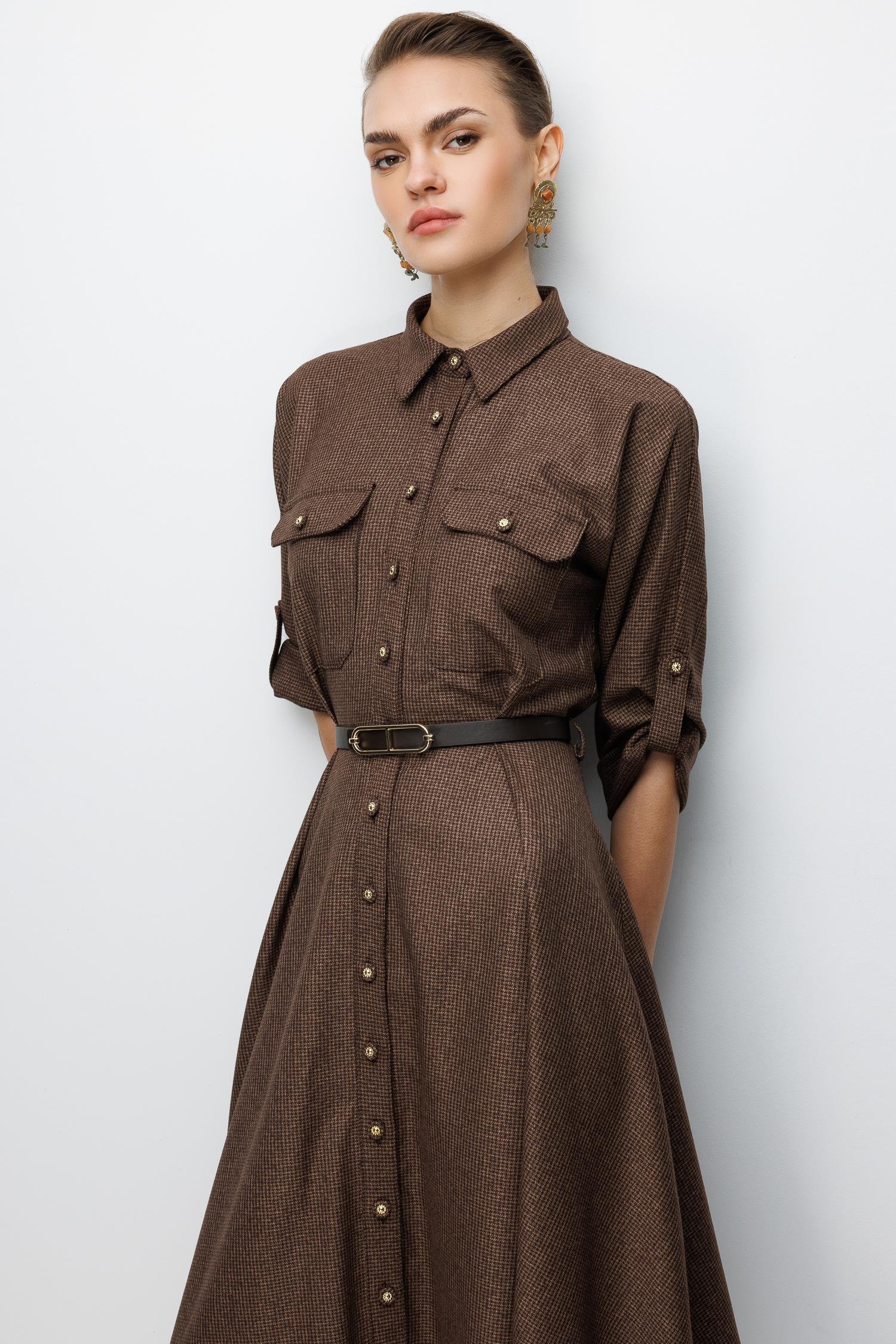 Kumaş: Yumuşak dokulu, zarif kahve/camel tonlarında mikro desenli kumaş.