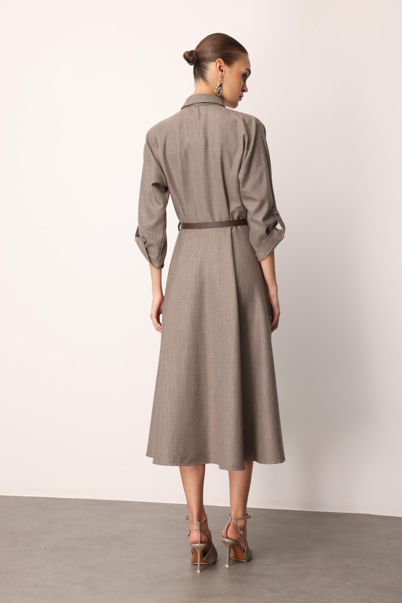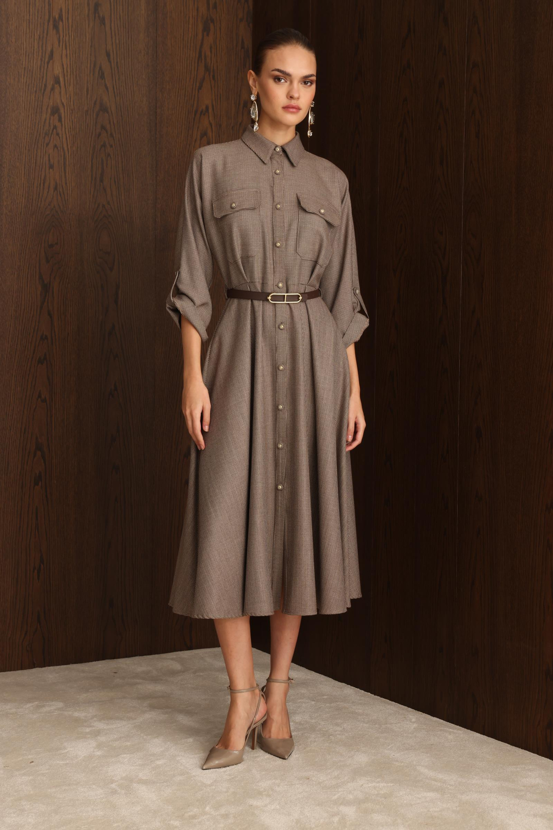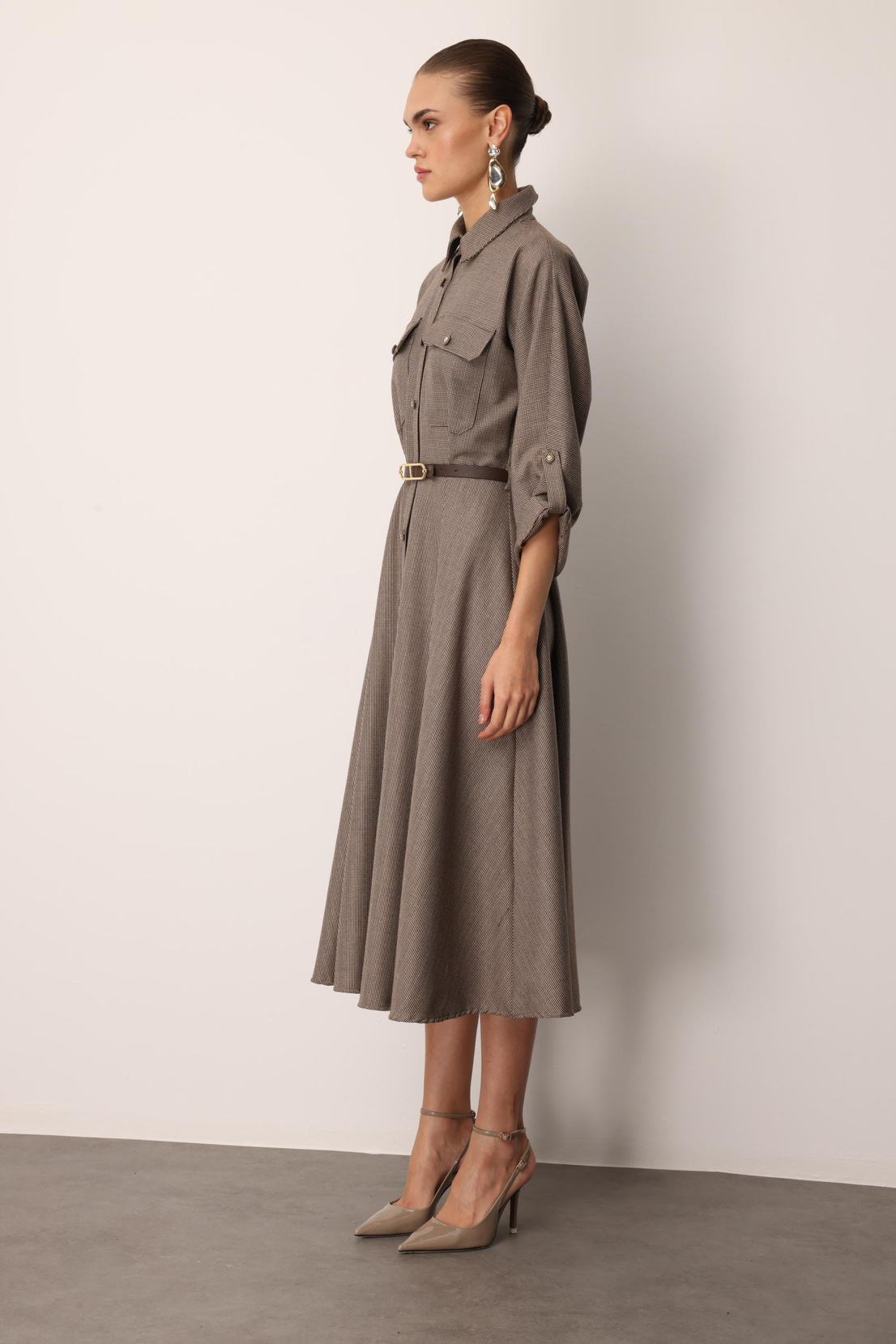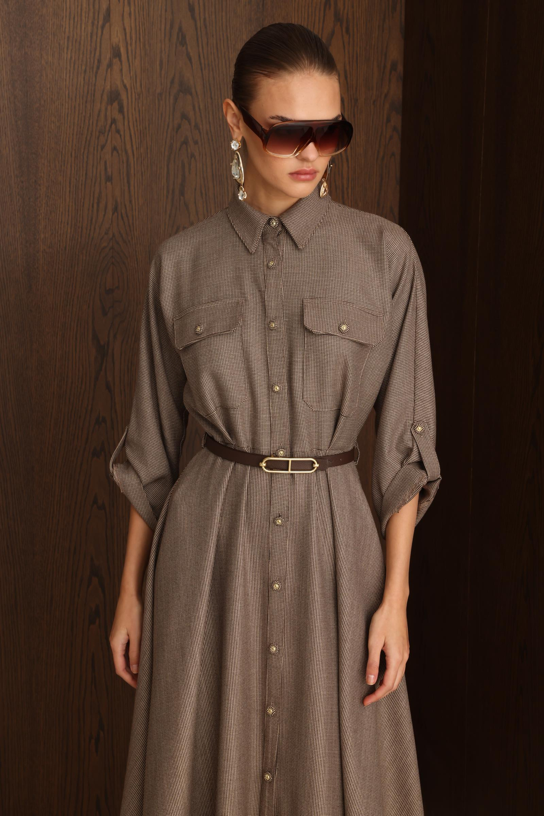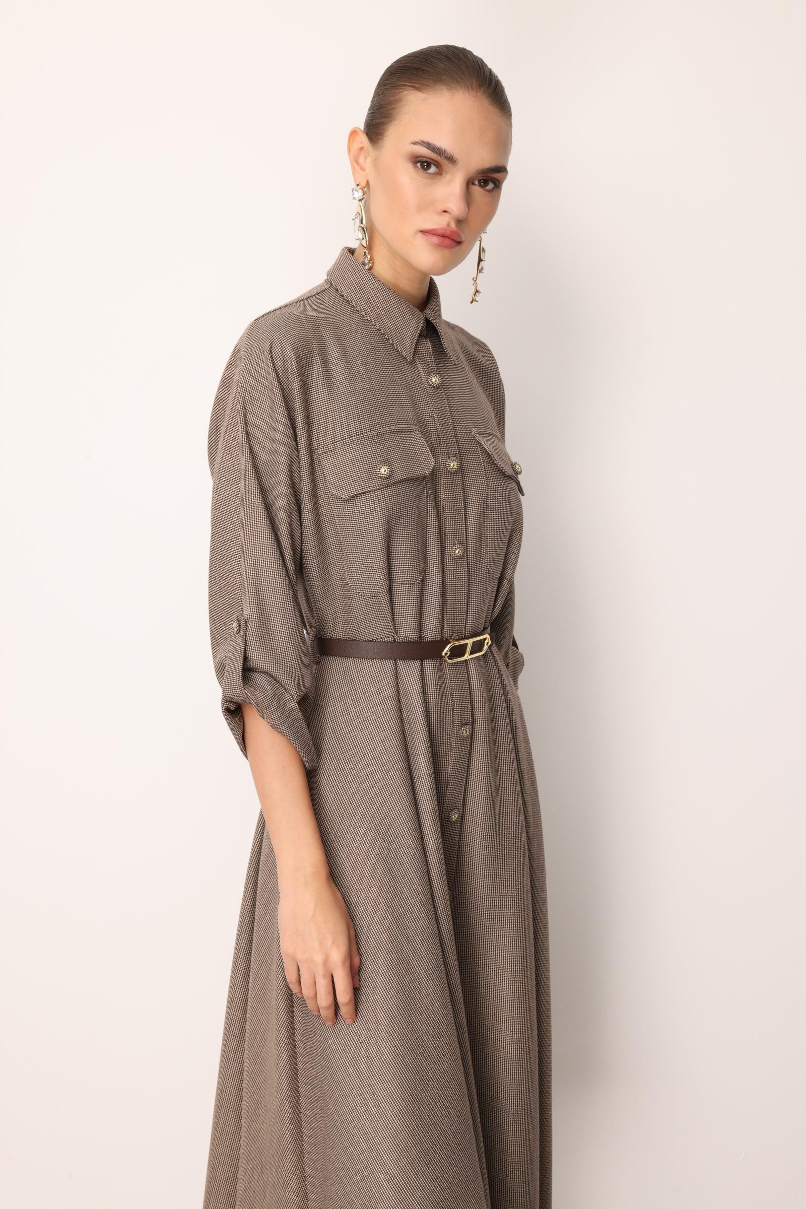 Zamansız kazayağı (pepita) veya ince ekose dokusuyla bu midi elbise, ofis ve günlük stilinize sofistike bir dokunuş katıyor. Klasik gömlek elbisenin konforunu, beli vurgulayan şık bir silüetle birleştiriyor.