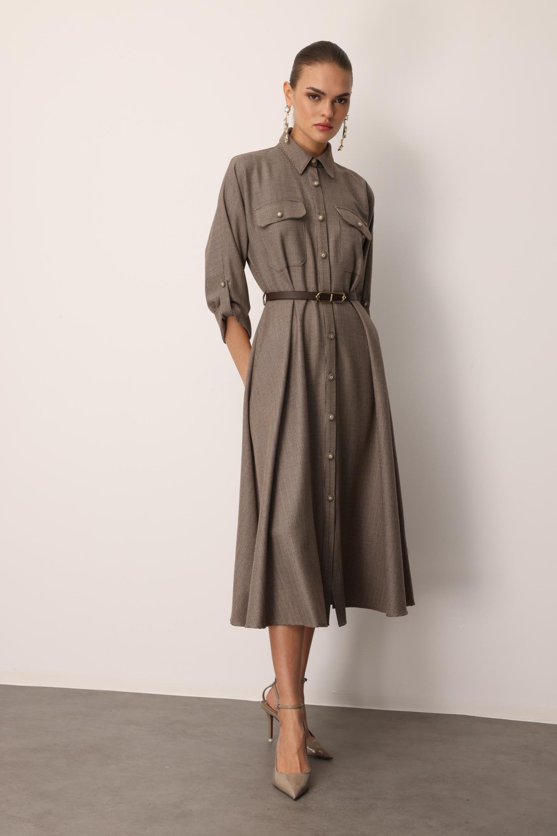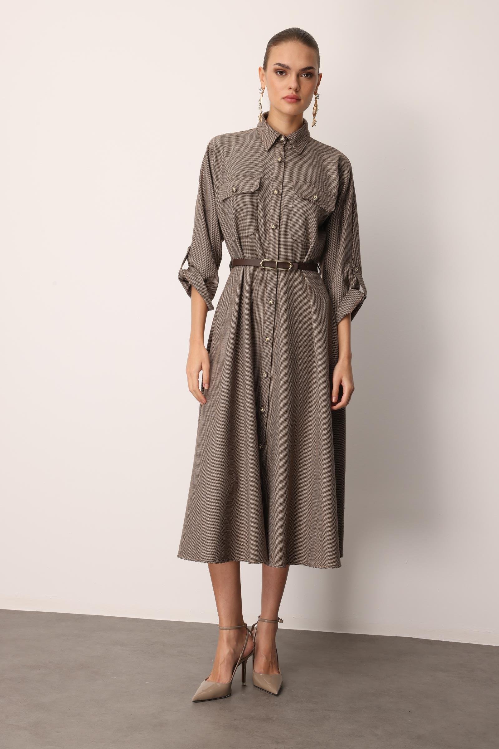 Cepler: Omuz hizasında kapaklı cep detayları (patlı cepler), elbiseye sportif ve sofistike bir hava katar.