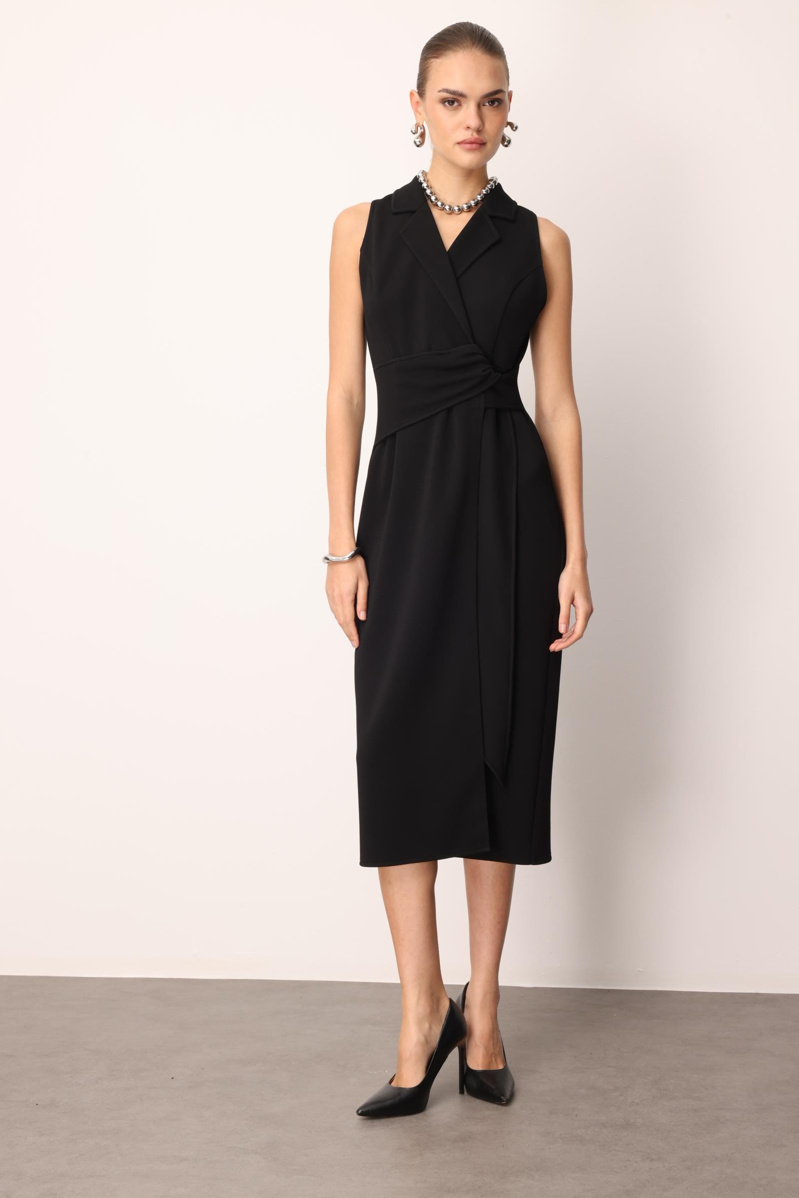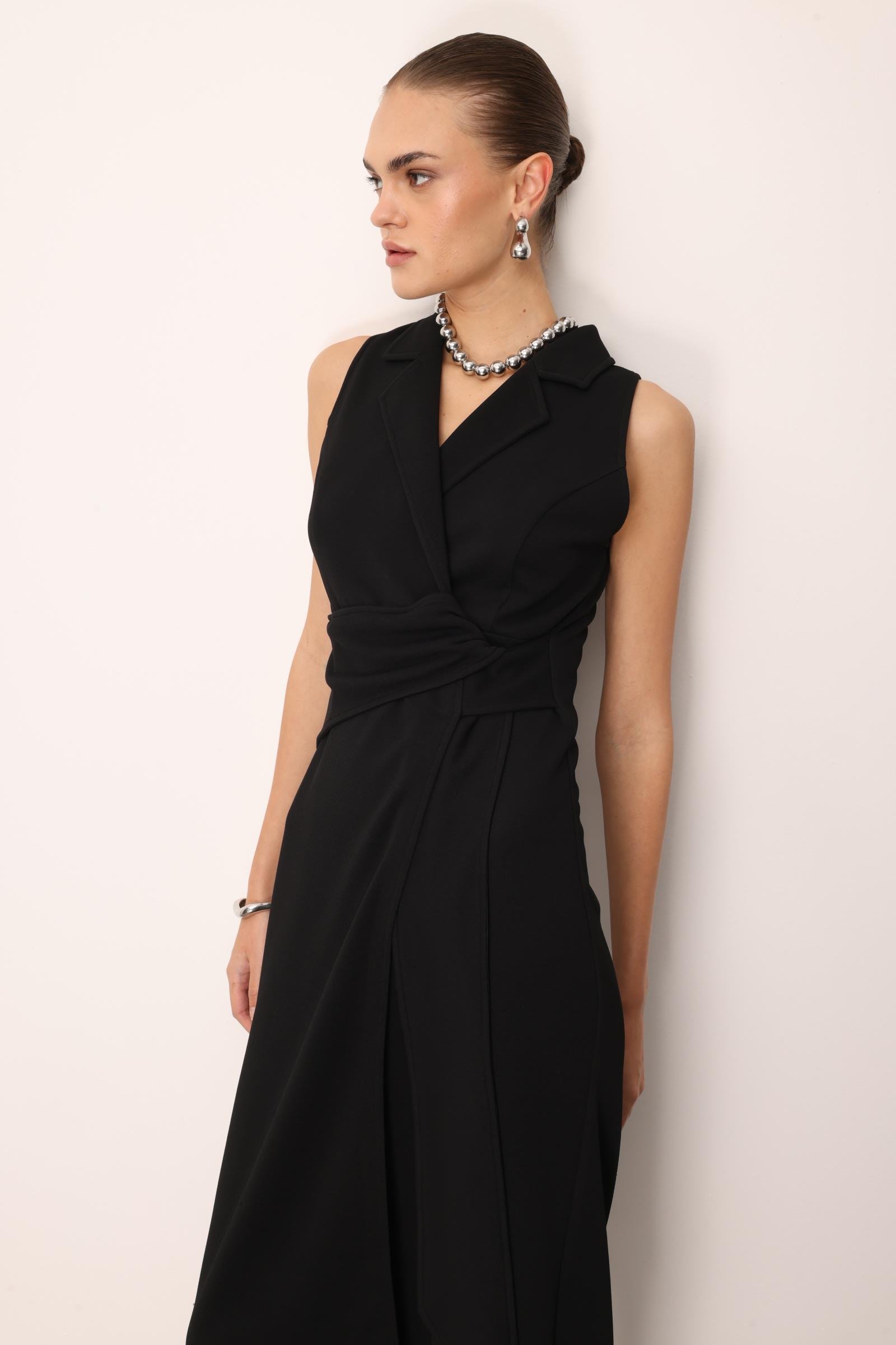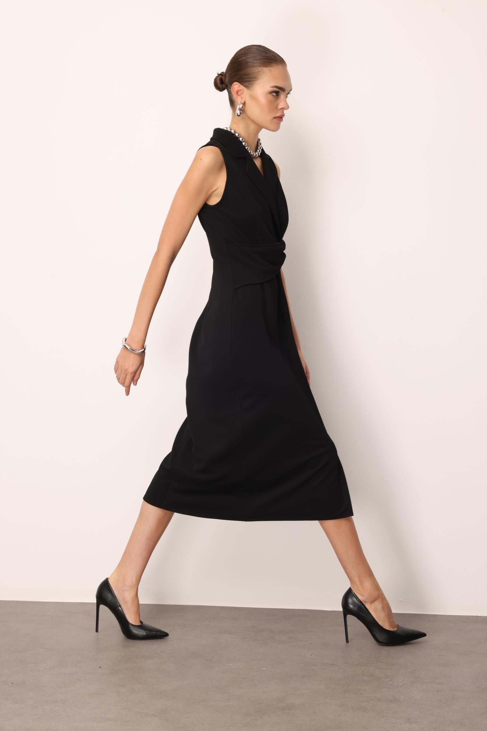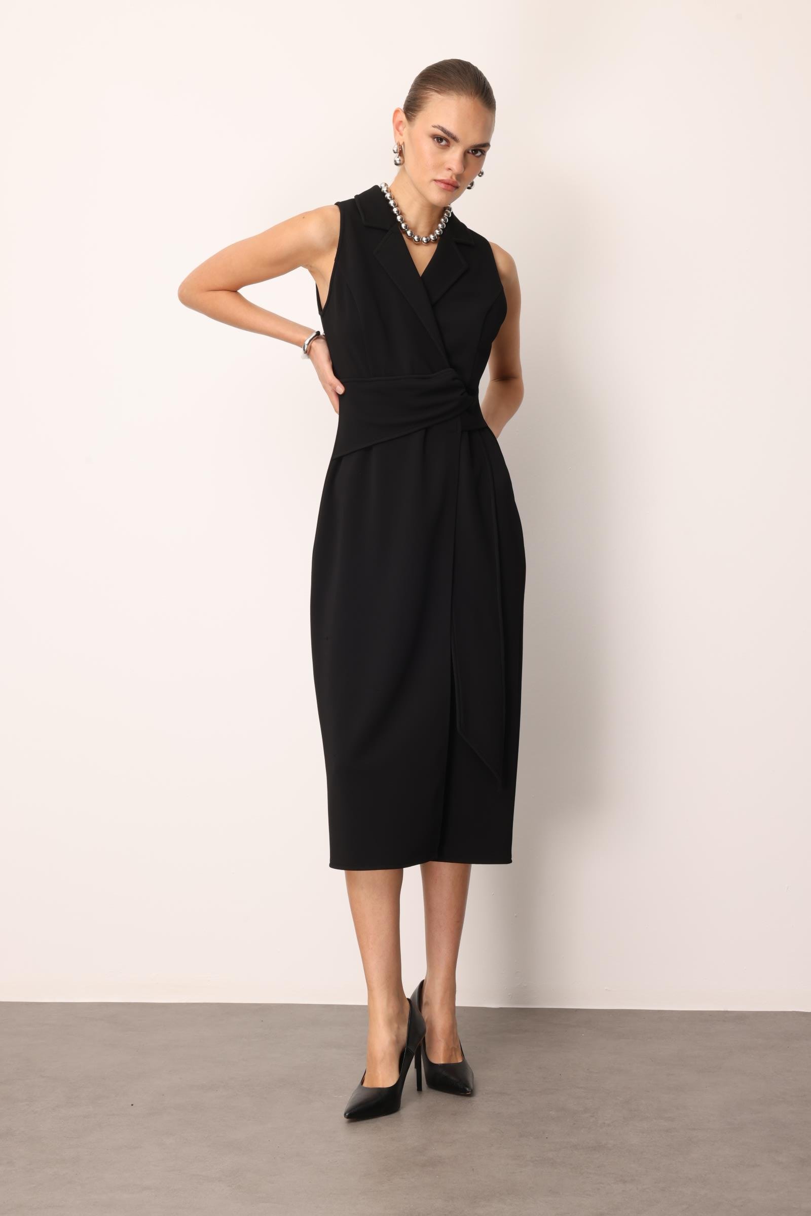 Zarafetin ve gücün buluşması. Bu siyah kruvaze elbise, minimalist ve modern çizgisiyle gardırobunuzun en şık ve zamansız parçası olmaya aday.