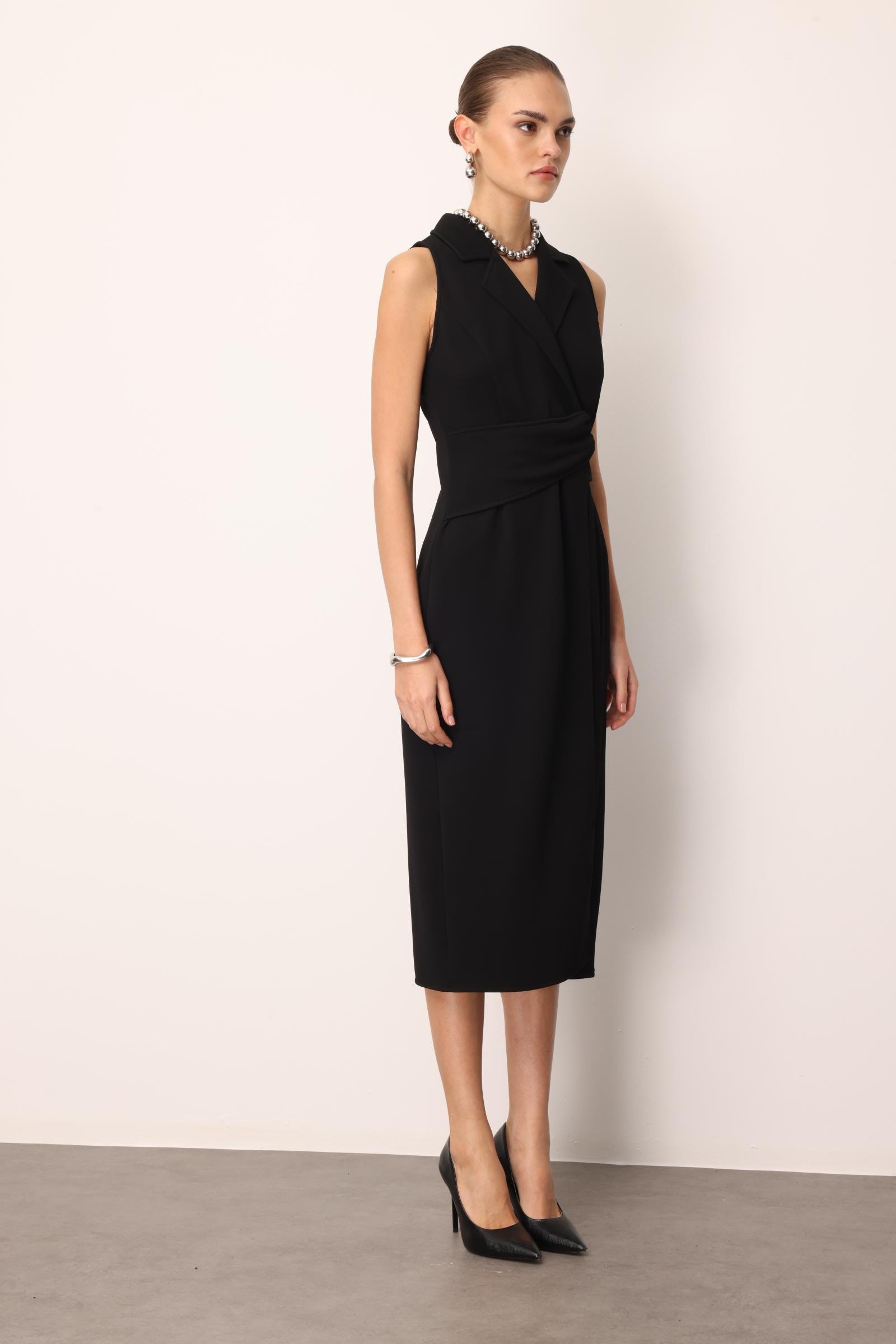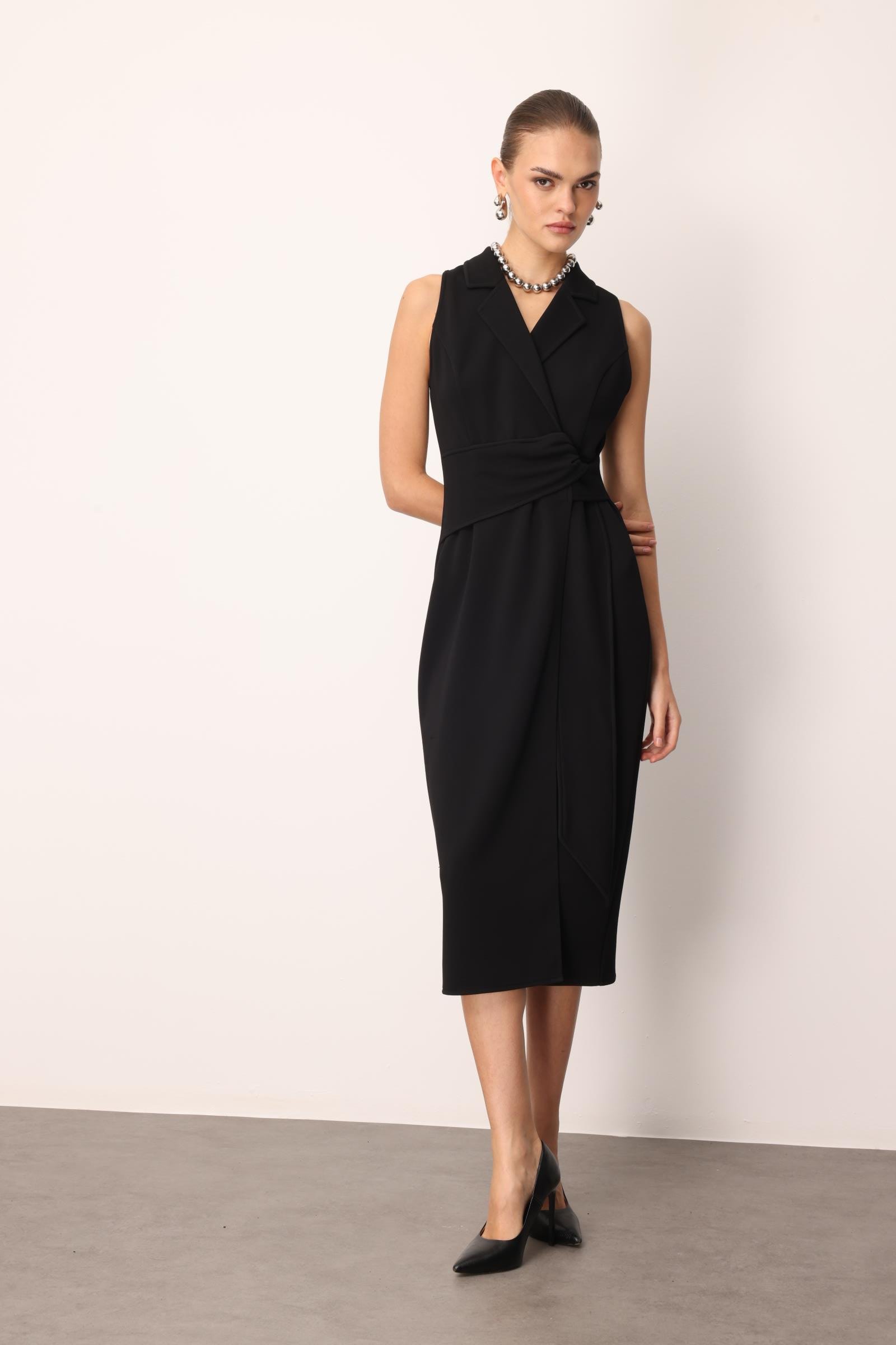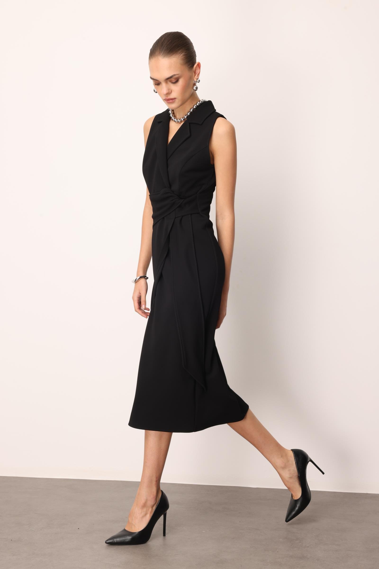 Zarafetin ve gücün buluşması. Bu siyah kruvaze elbise, minimalist ve modern çizgisiyle gardırobunuzun en şık ve zamansız parçası olmaya aday.
