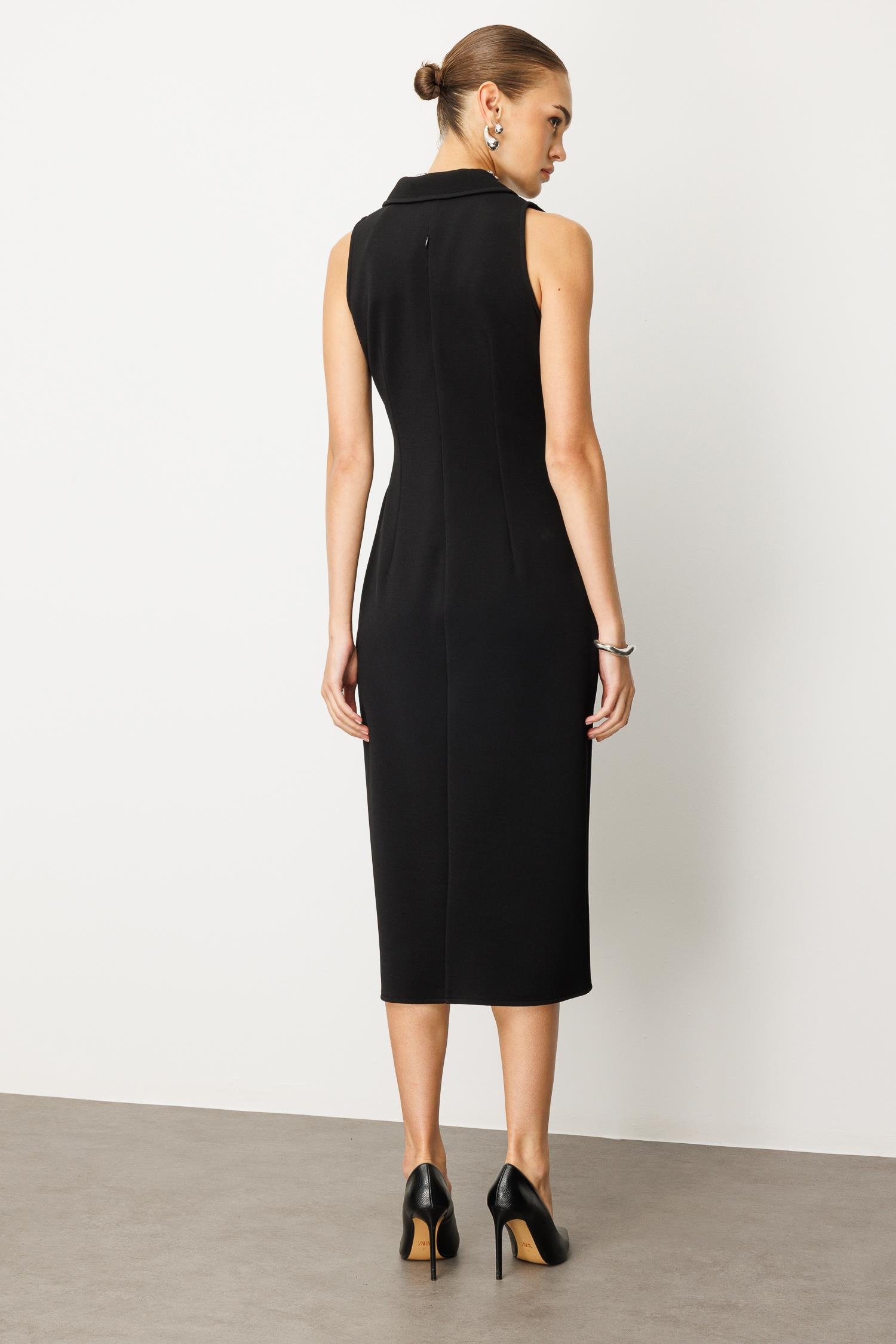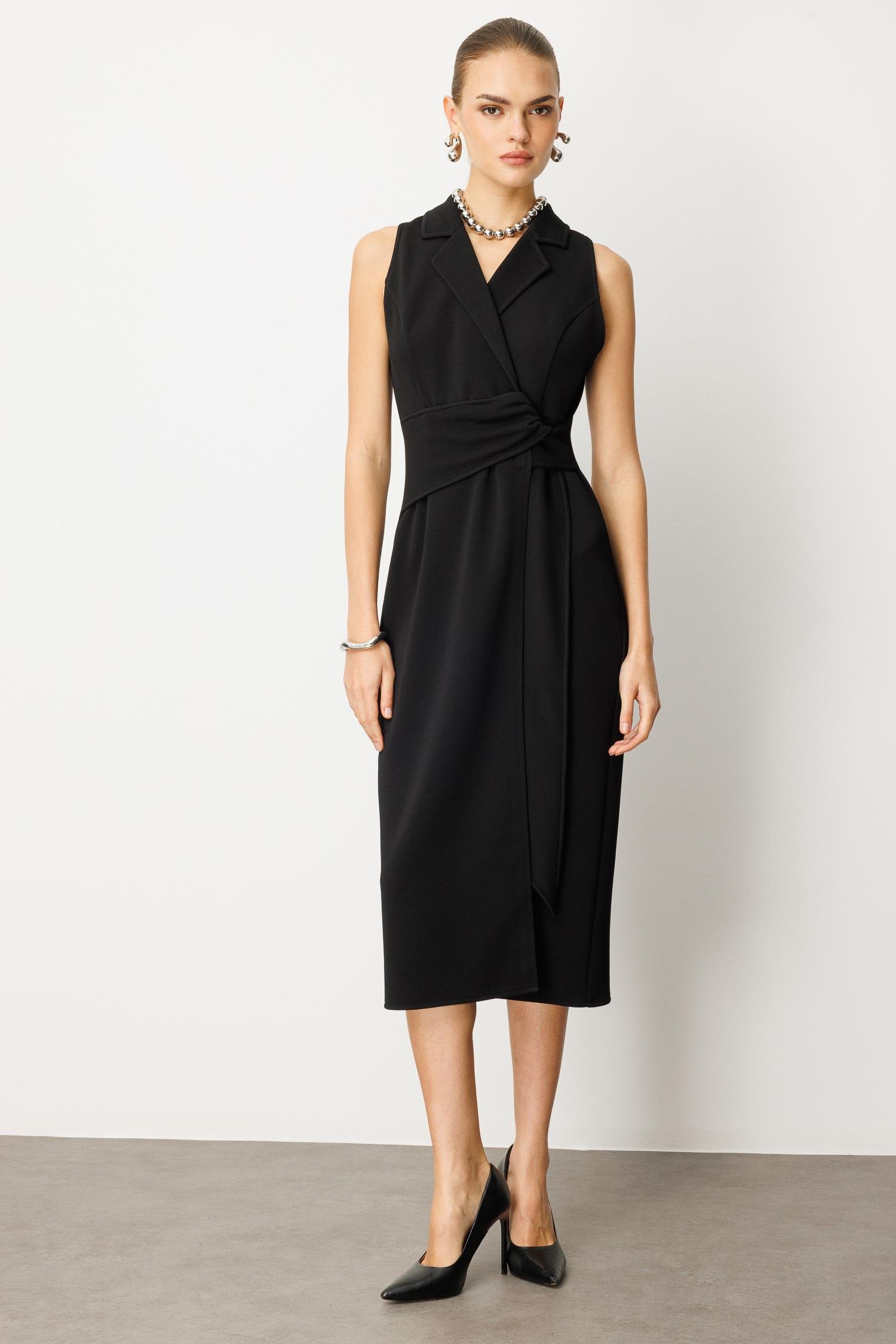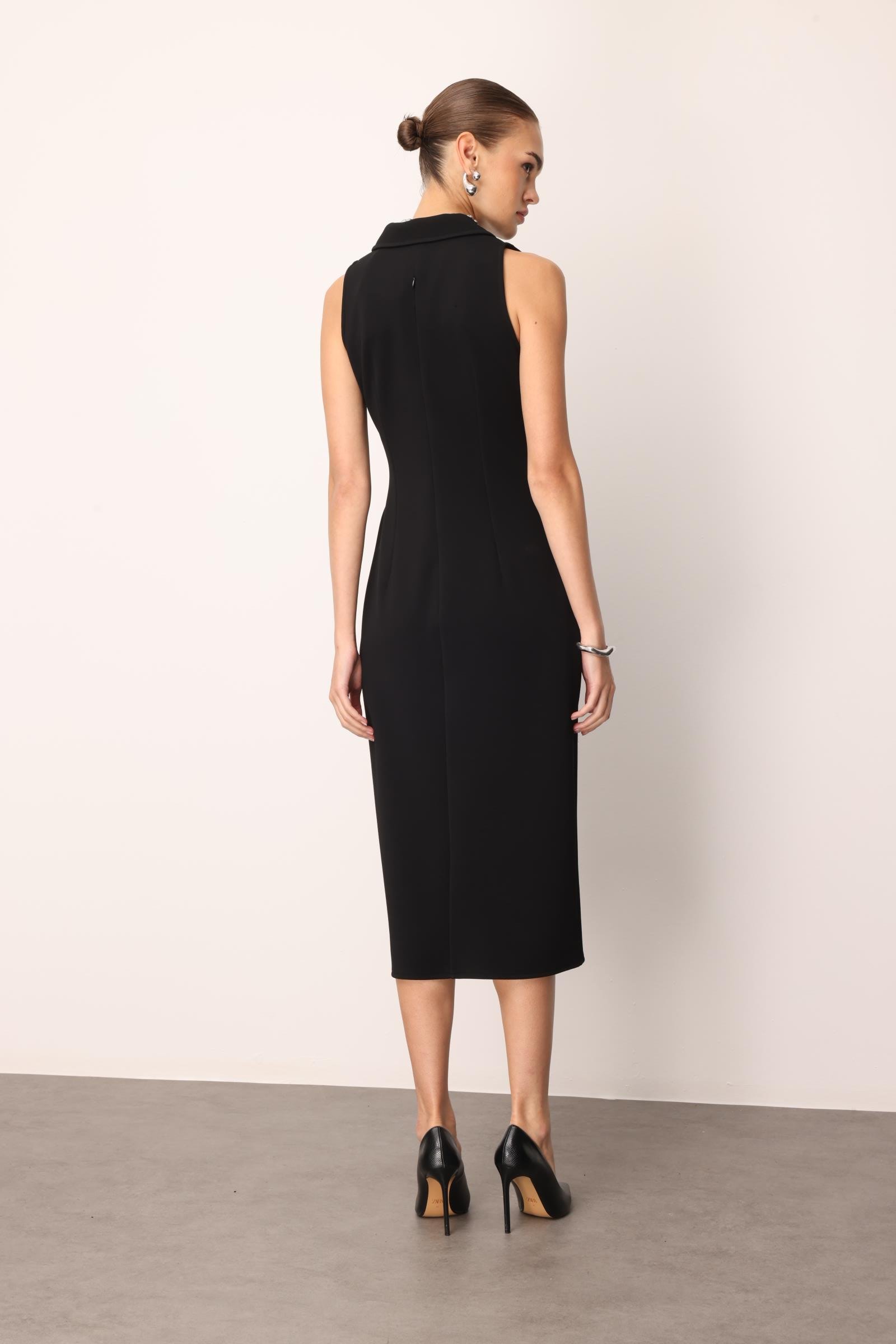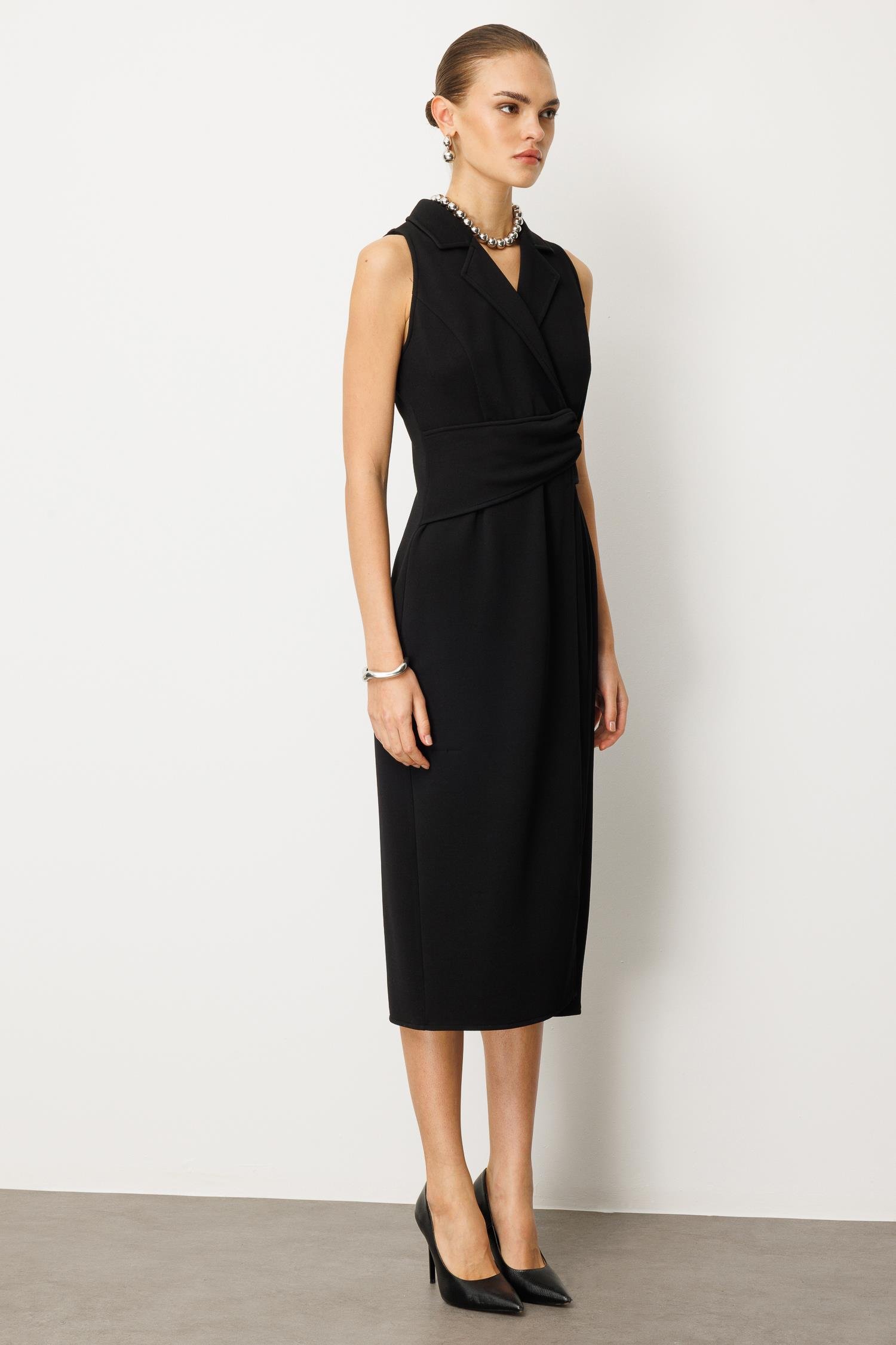 Zarafetin ve gücün buluşması. Bu siyah kruvaze elbise, minimalist ve modern çizgisiyle gardırobunuzun en şık ve zamansız parçası olmaya aday.