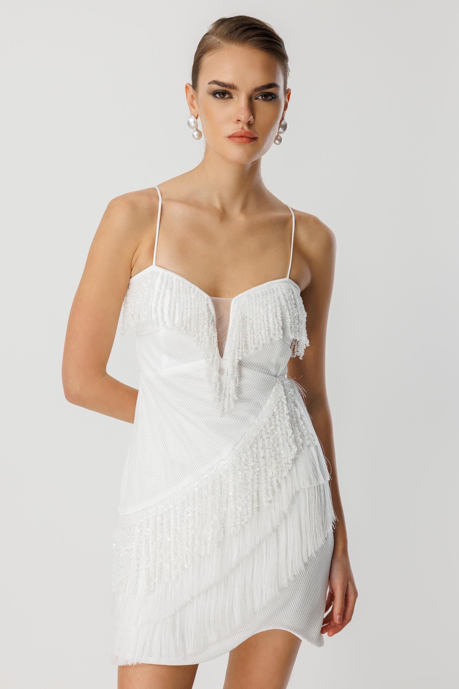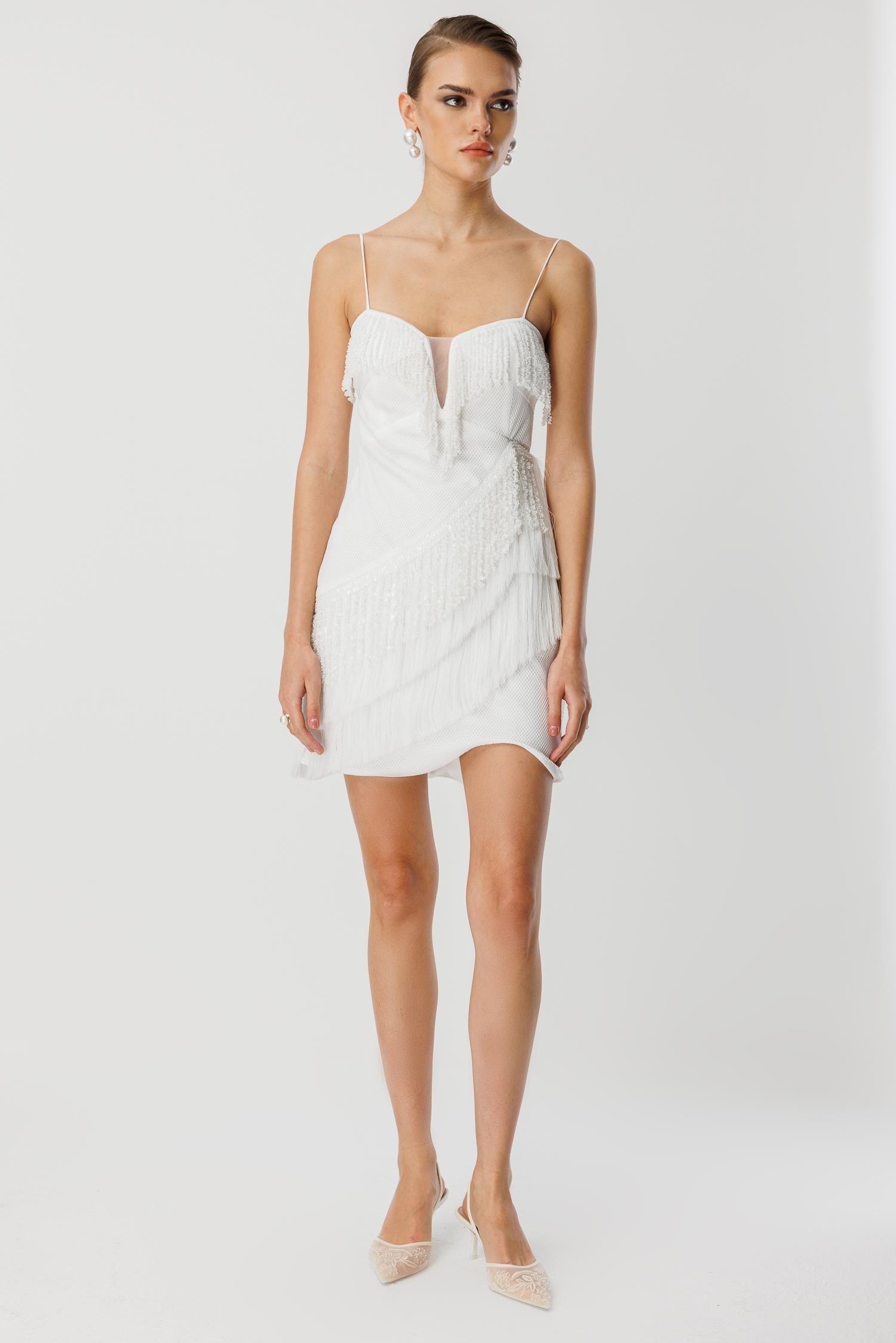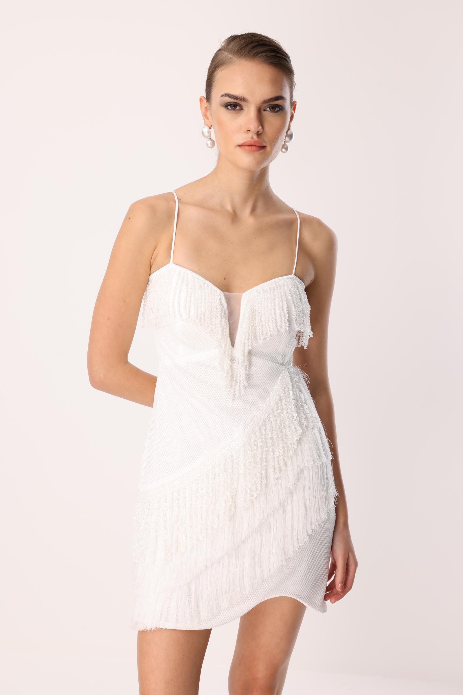 Partilerin ve özel davetlerin yıldızı olmaya hazır mısınız? Bu ekru rengi, mini boy saçaklı ve işlemeli elbise, hareketli tasarımıyla tüm dikkatleri üzerinize çekecek. Her adımda sizinle birlikte dans eden saçakları ve zarif işlemeleriyle göz kamaştırın!