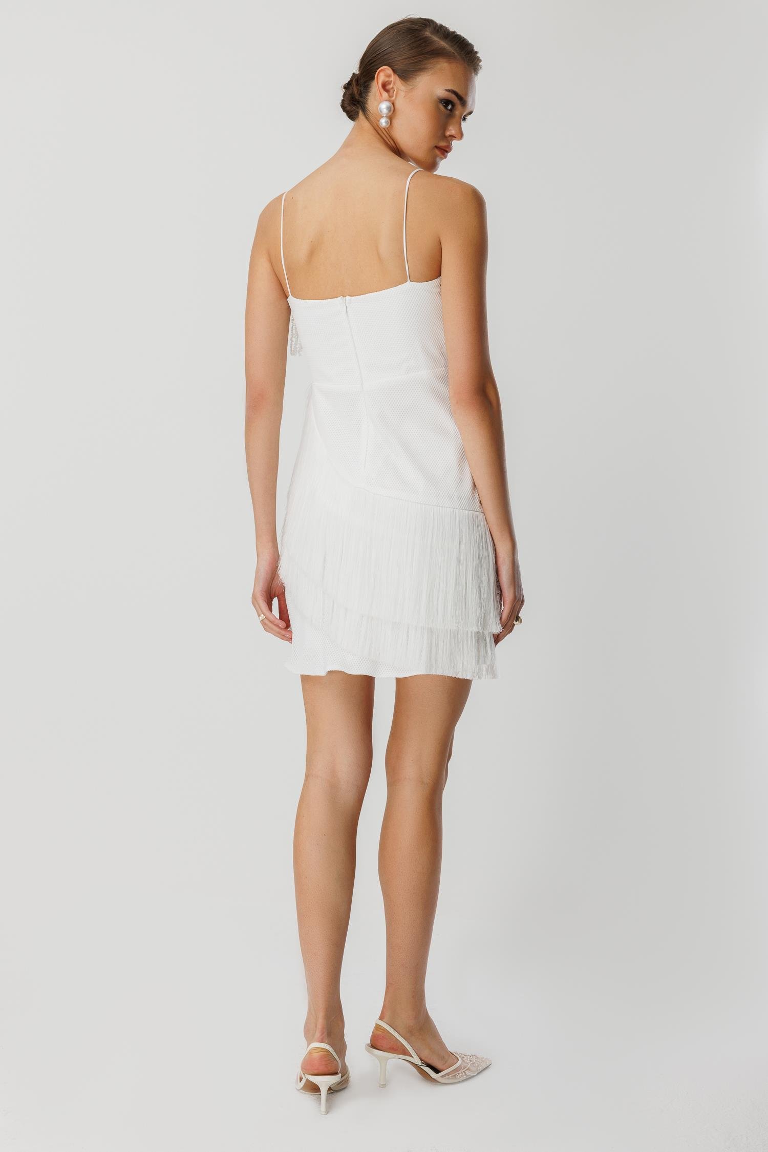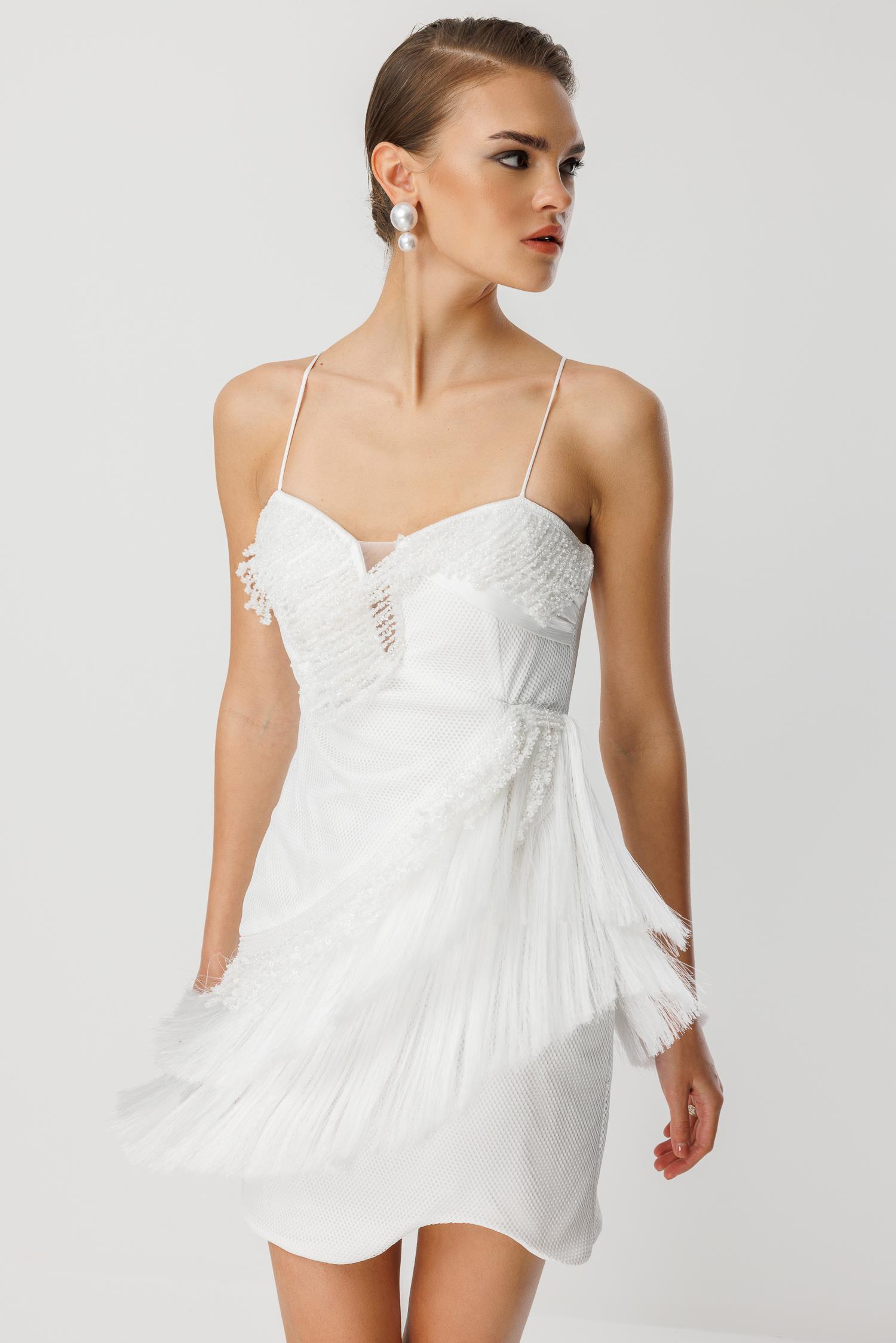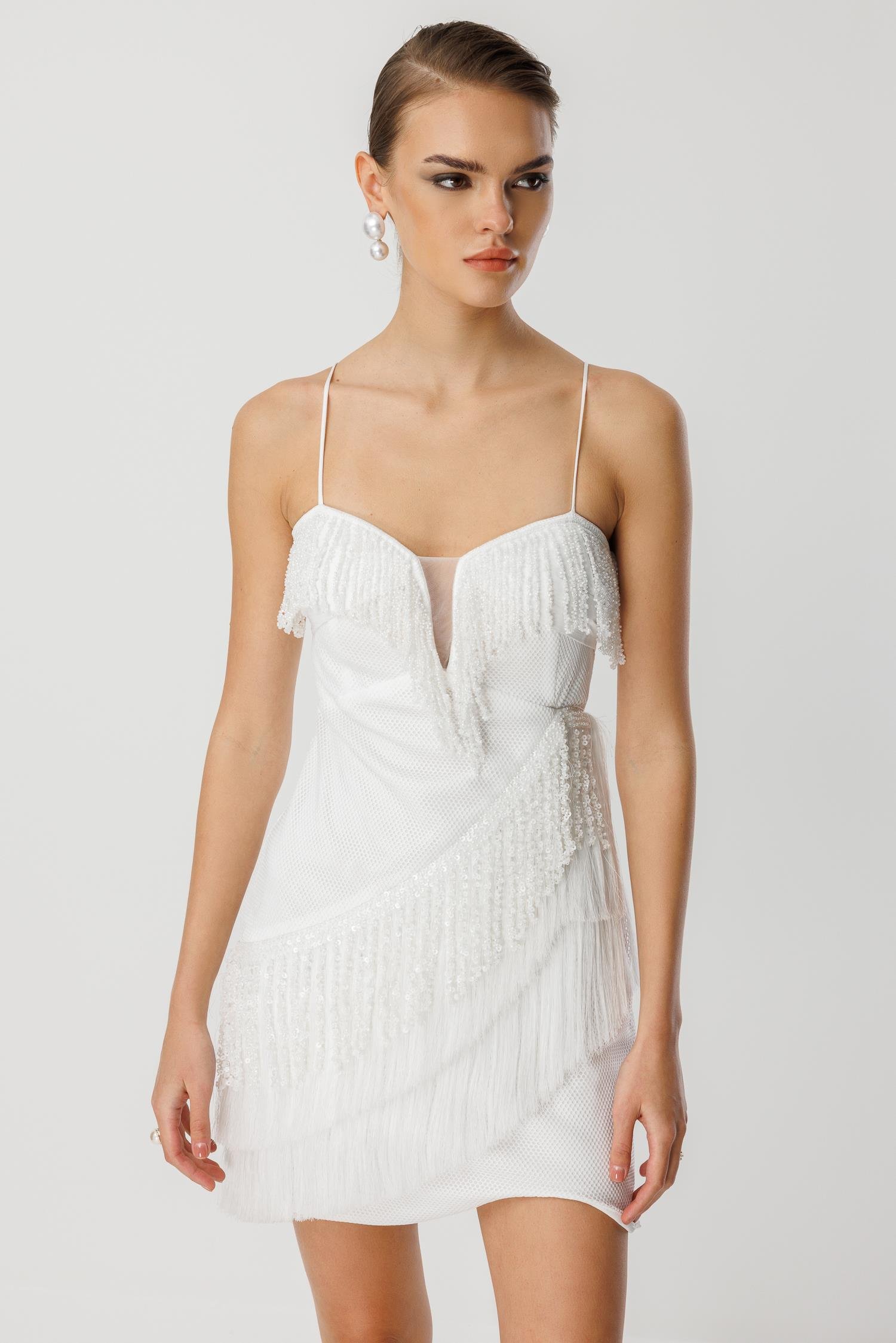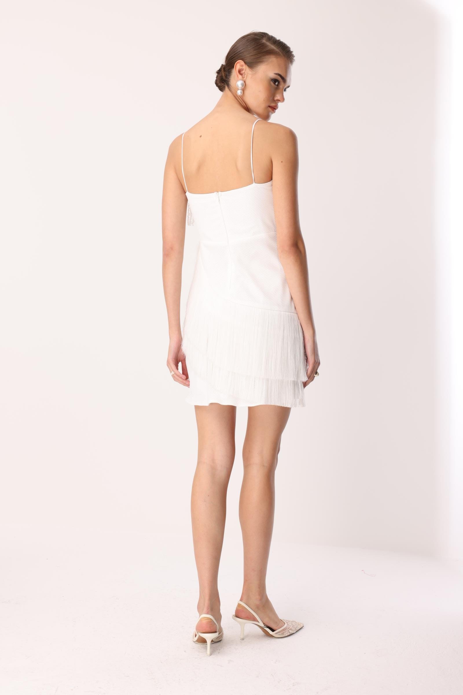 Partilerin ve özel davetlerin yıldızı olmaya hazır mısınız? Bu ekru rengi, mini boy saçaklı ve işlemeli elbise, hareketli tasarımıyla tüm dikkatleri üzerinize çekecek. Her adımda sizinle birlikte dans eden saçakları ve zarif işlemeleriyle göz kamaştırın!