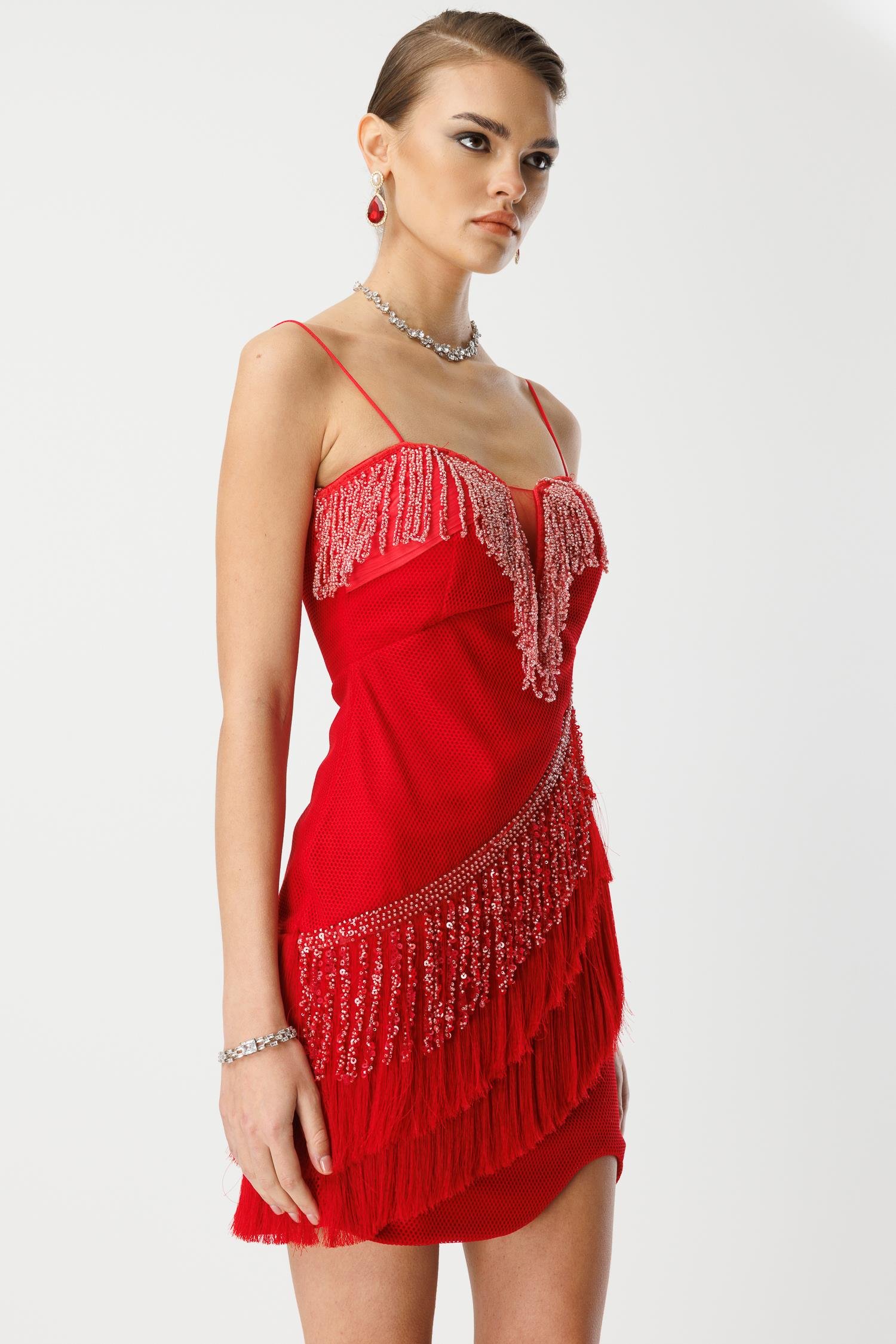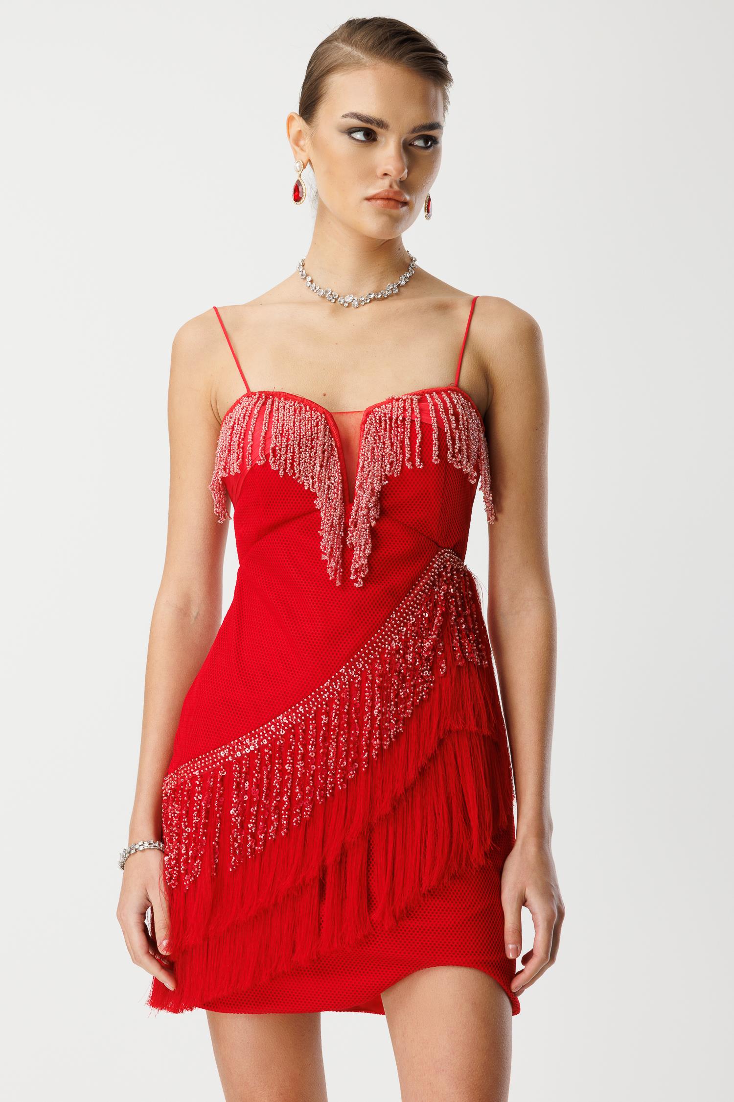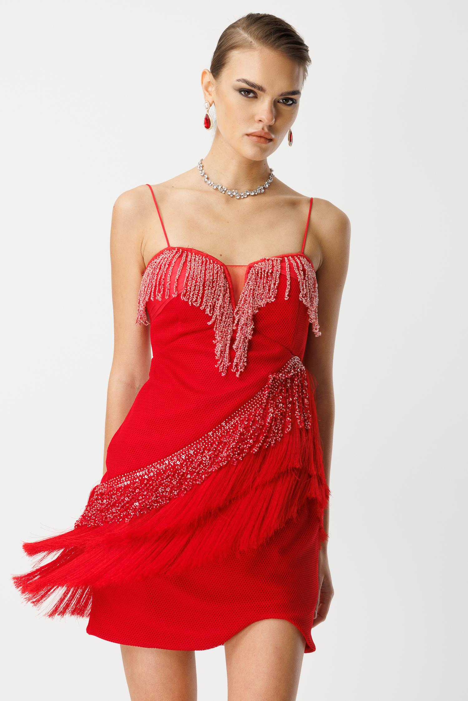 Girdiğiniz her ortamda tüm gözleri üzerinize çekecek, iddialı ve unutulmaz bir parça. Canlı kırmızı rengindeki bu mini boy saçaklı ve işlemeli elbise, hareketli tasarımıyla enerjinizi yansıtacak. Her adımda sizinle birlikte dans eden saçakları ve ışıltılı işlemeleriyle gecenin yıldızı siz olun!