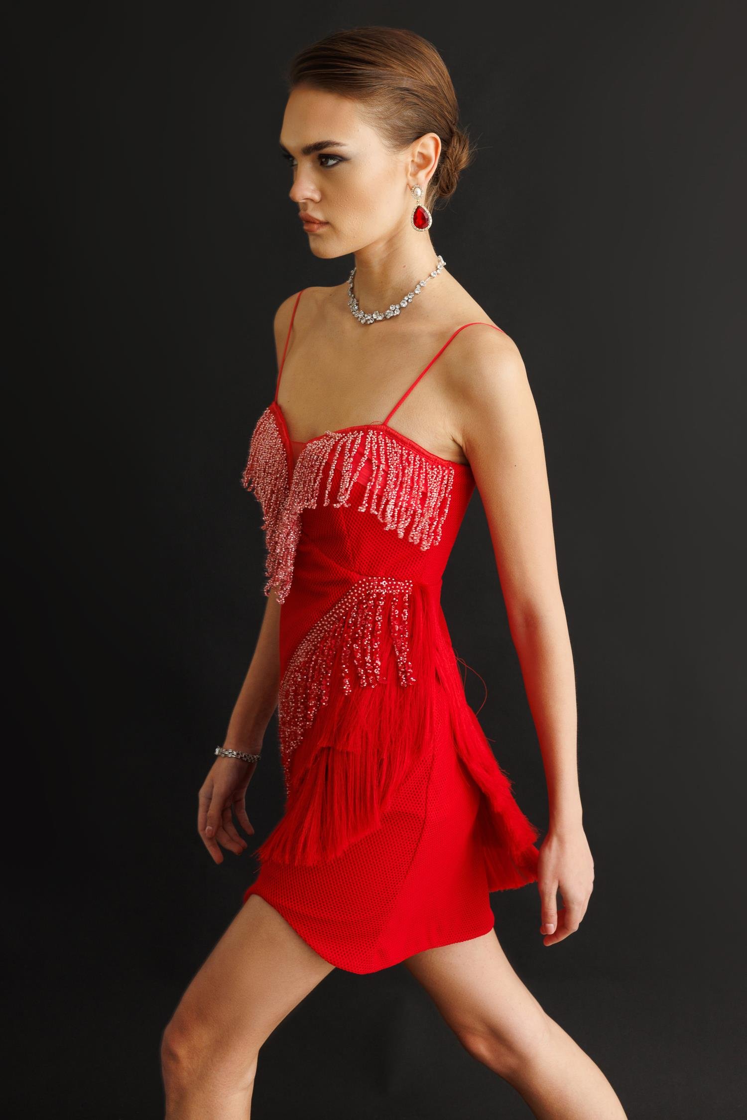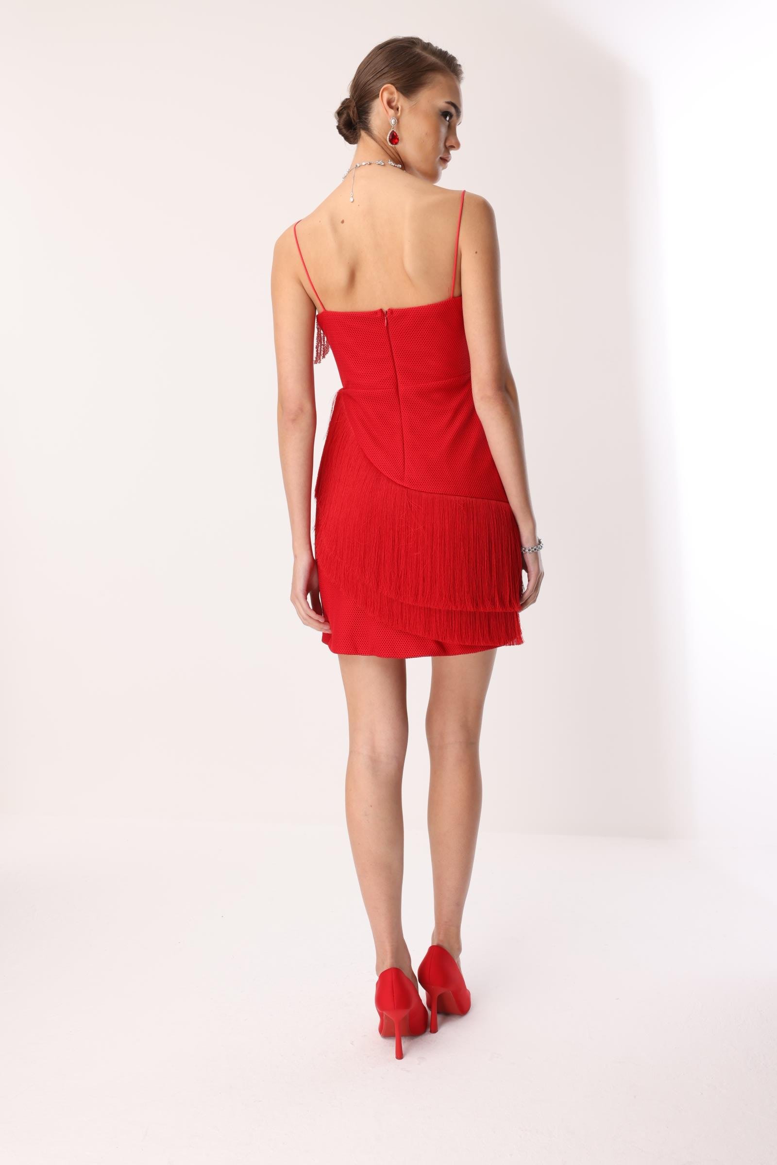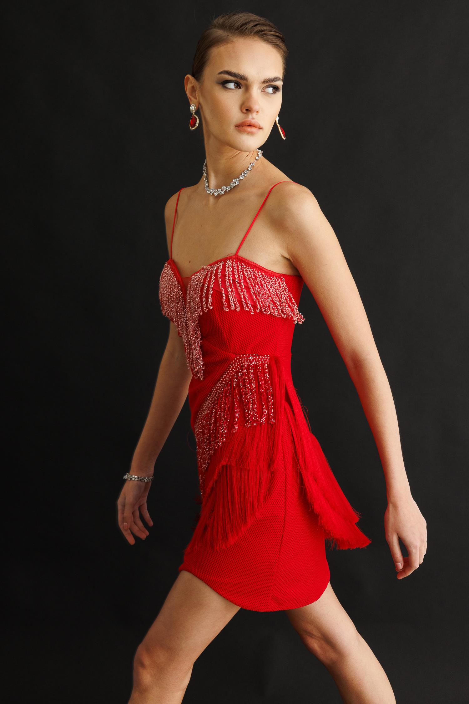 Girdiğiniz her ortamda tüm gözleri üzerinize çekecek, iddialı ve unutulmaz bir parça. Canlı kırmızı rengindeki bu mini boy saçaklı ve işlemeli elbise, hareketli tasarımıyla enerjinizi yansıtacak. Her adımda sizinle birlikte dans eden saçakları ve ışıltılı işlemeleriyle gecenin yıldızı siz olun!