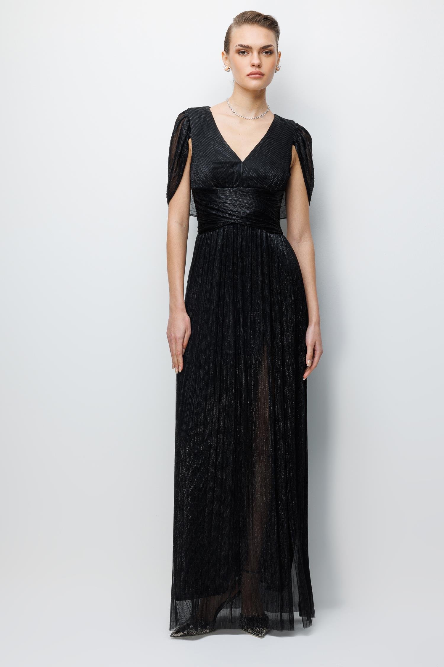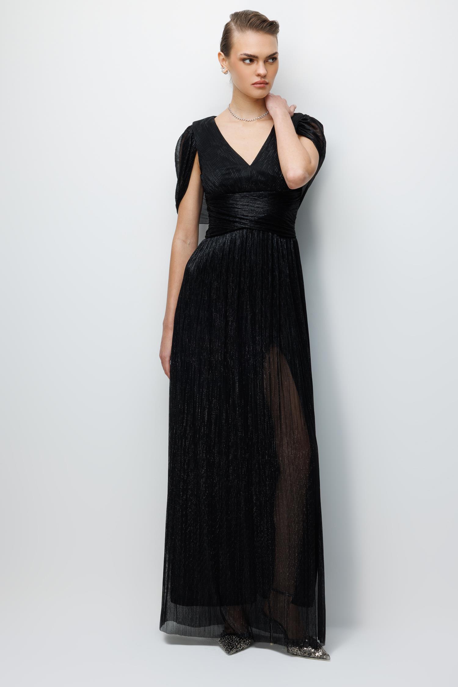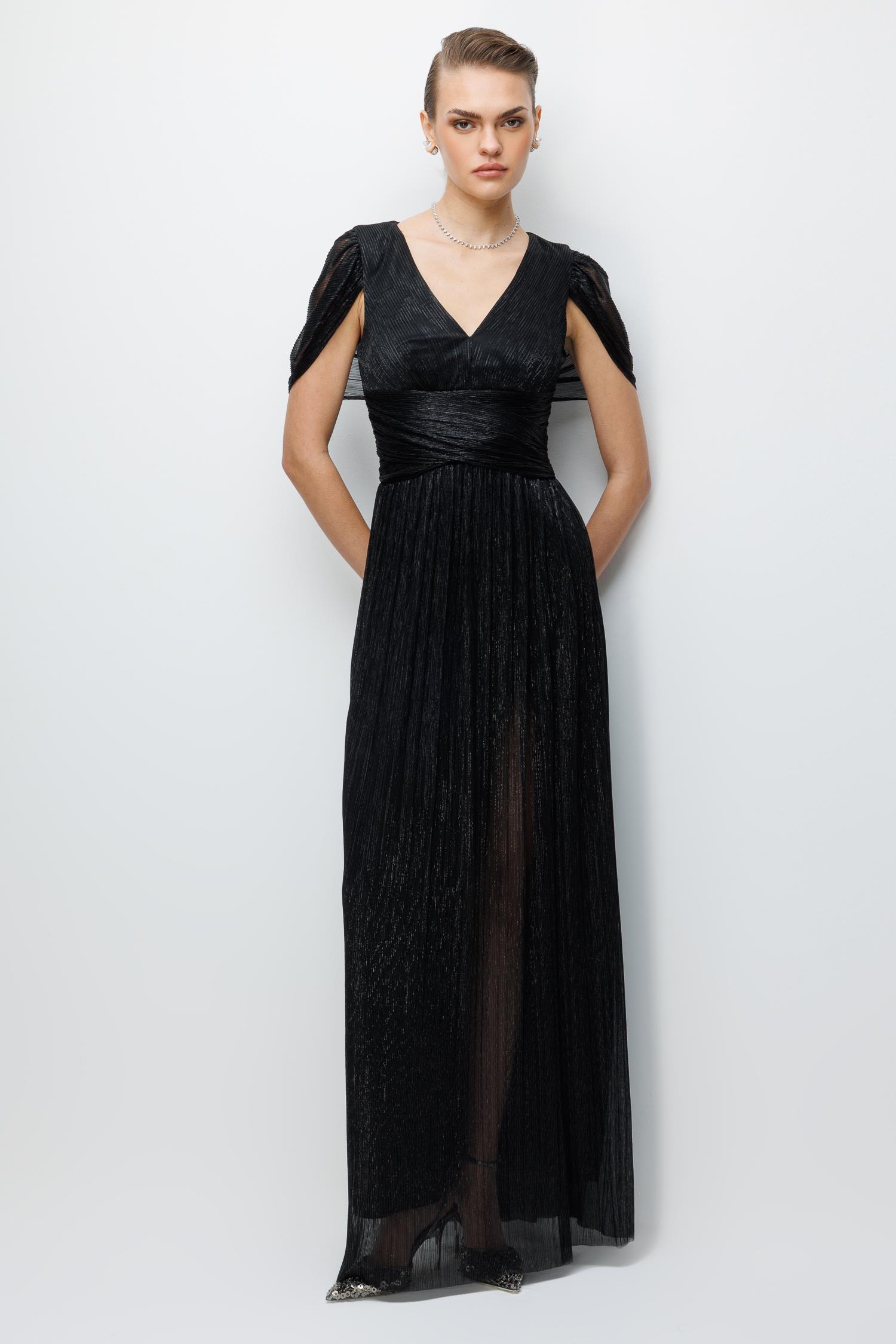 Ana Özellikler: Omuz Pelerin Detaylı, Maxi Boy, Abiye Silüet, Yoğun Siyah Ton.