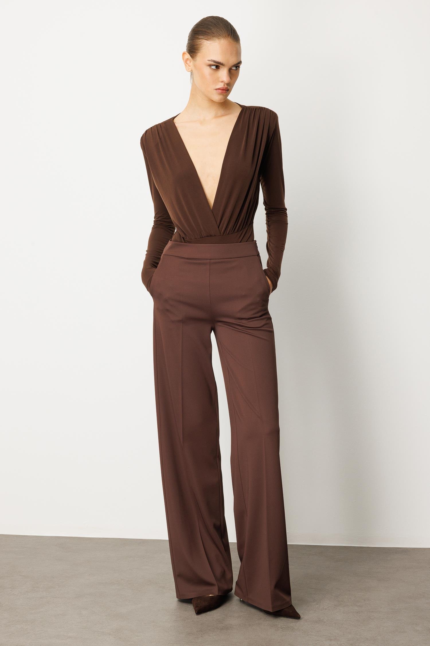 Bu özel tasarım pantolon, kahverenginin en derin ve zengin tonuyla modern zarafeti gardırobunuza taşıyor. Yüksek belli kesimi ve dökümlü İspanyol paça stili, bacaklarınızı uzun gösterirken gün boyu süren konforlu bir şıklık sunar. Hafif çizgili (pinstripe) kumaş dokusu, pantolona incelik ve profesyonel bir hava katıyor.