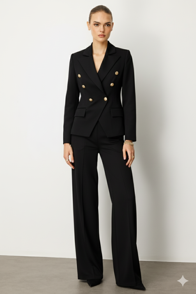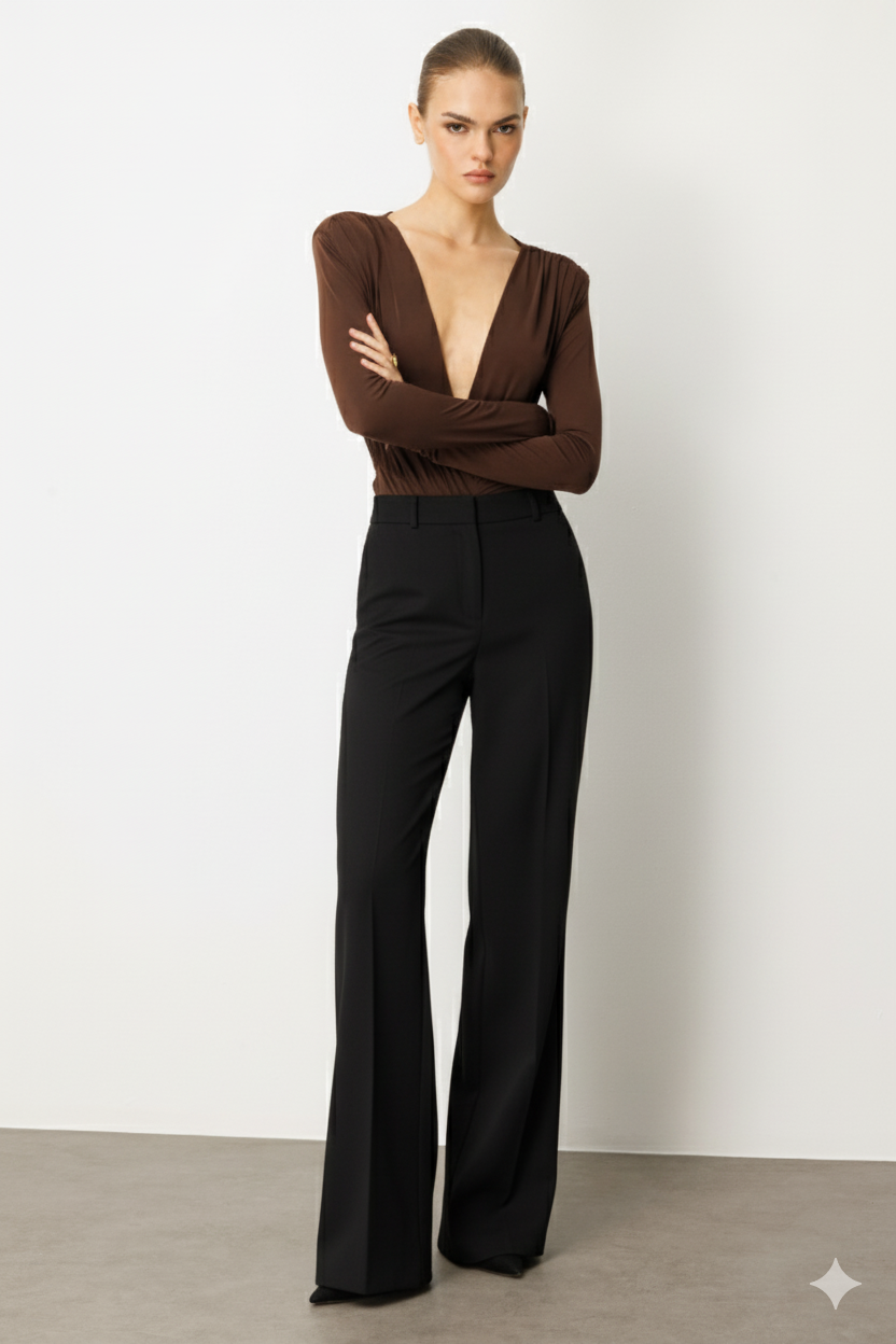 Gardıropların vazgeçilmezi olan bu klasik siyah, yüksek bel, dökümlü pantolon ile zahmetsiz şıklığı yakalayın. Duruşuyla zarafeti yansıtan bu parça, modern kadının dinamik hayatına mükemmel uyum sağlar. Arka cep detayları ve kusursuz paça kesimi (wide-leg), silüetinize akıcı ve uzun bir görünüm katarken, sadeliğiyle tüm üst giyim parçalarınıza kolayca eşlik eder.