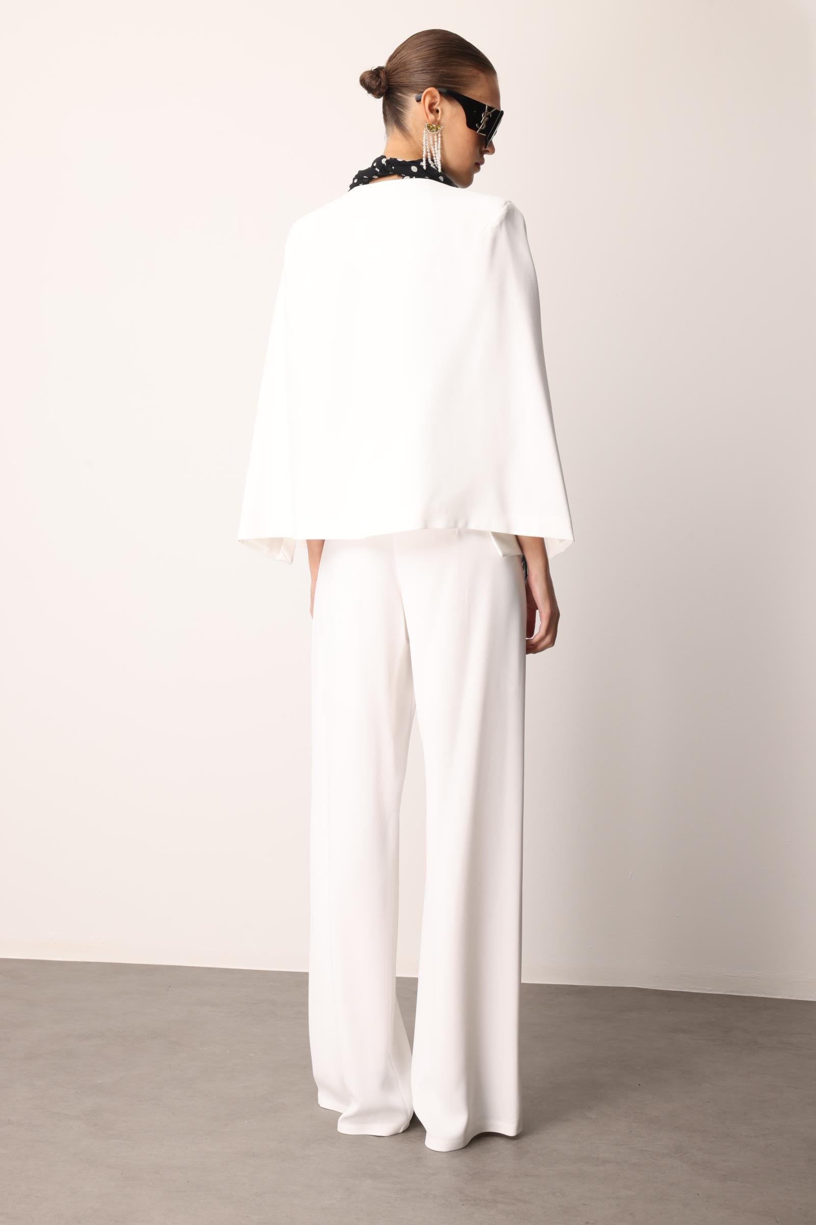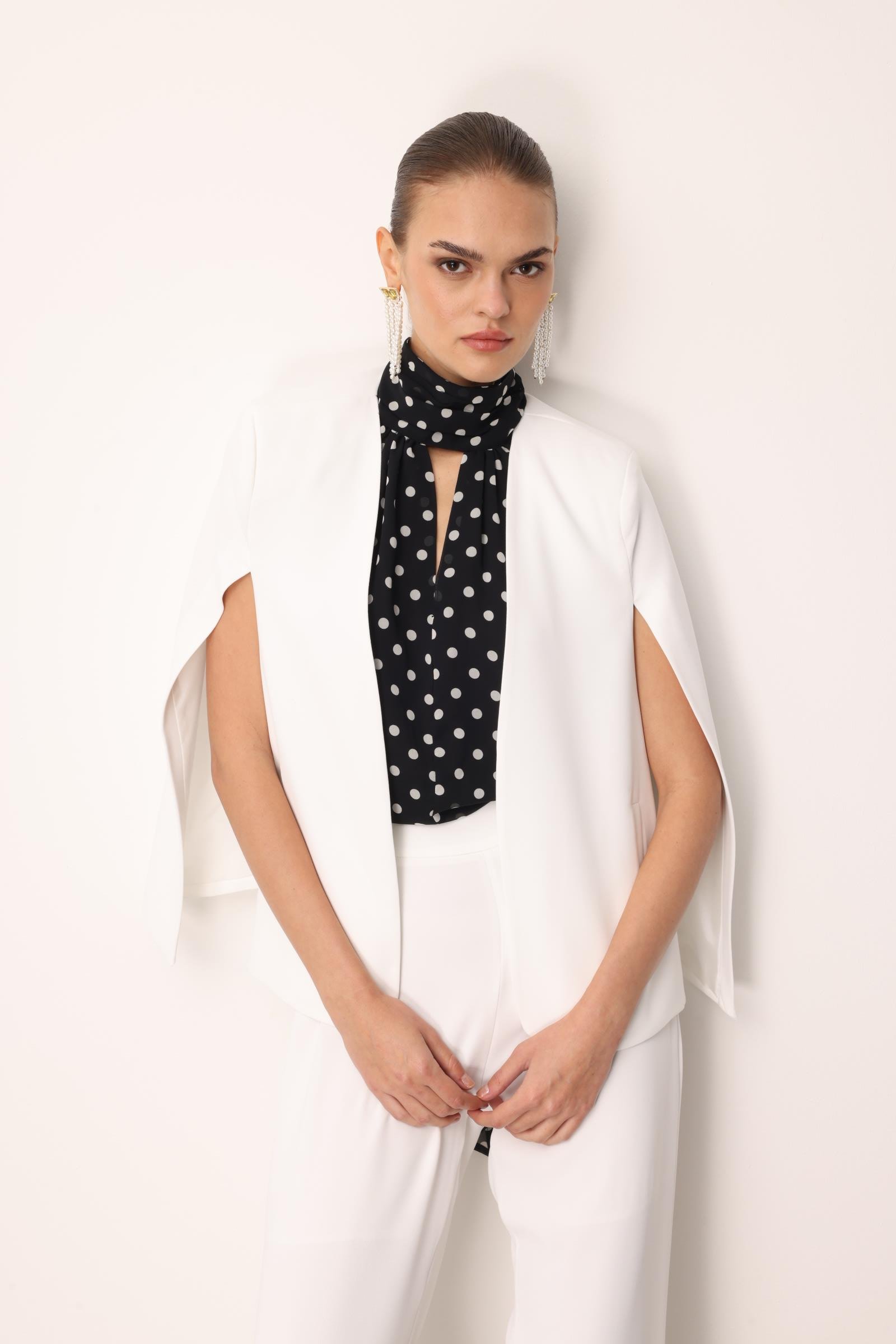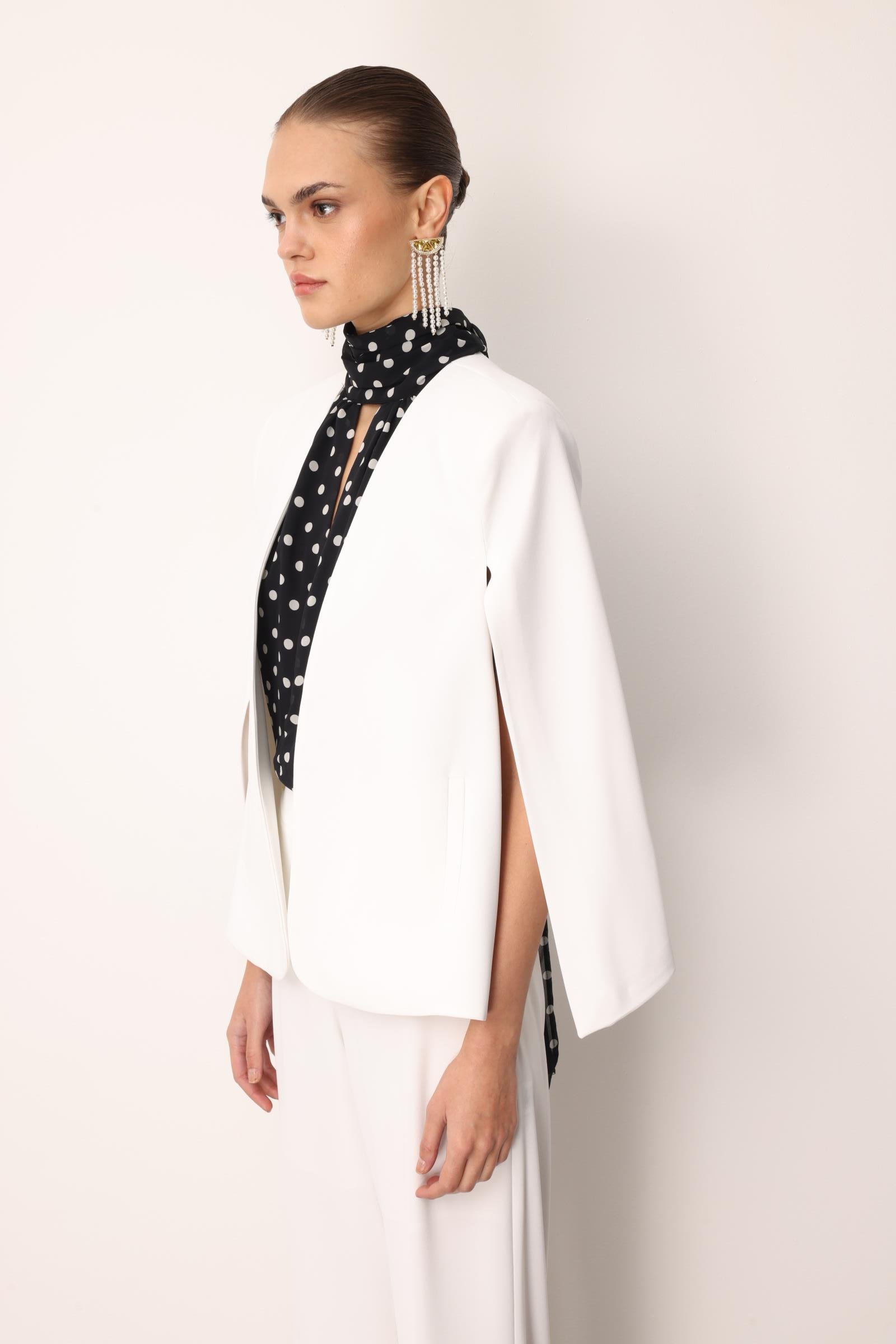 Klasik ve yenilikçi çizgileri birleştiren bu beyaz pelerin kol ceket, stilinize anında sofistike ve iddialı bir hava katıyor. Omuzlardan dökülen pelerin kol yapısı, ceketi sadece bir dış giyim parçası değil, başlı başına bir stil ifadesi haline getiriyor.