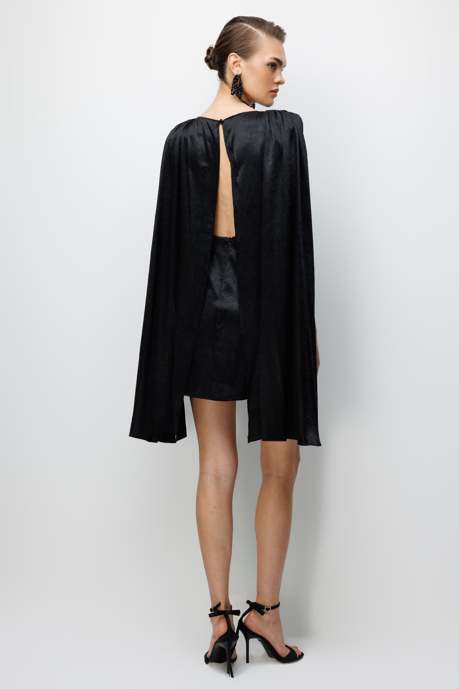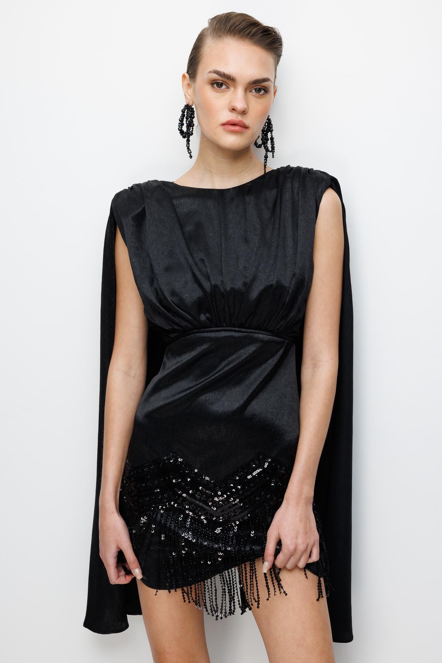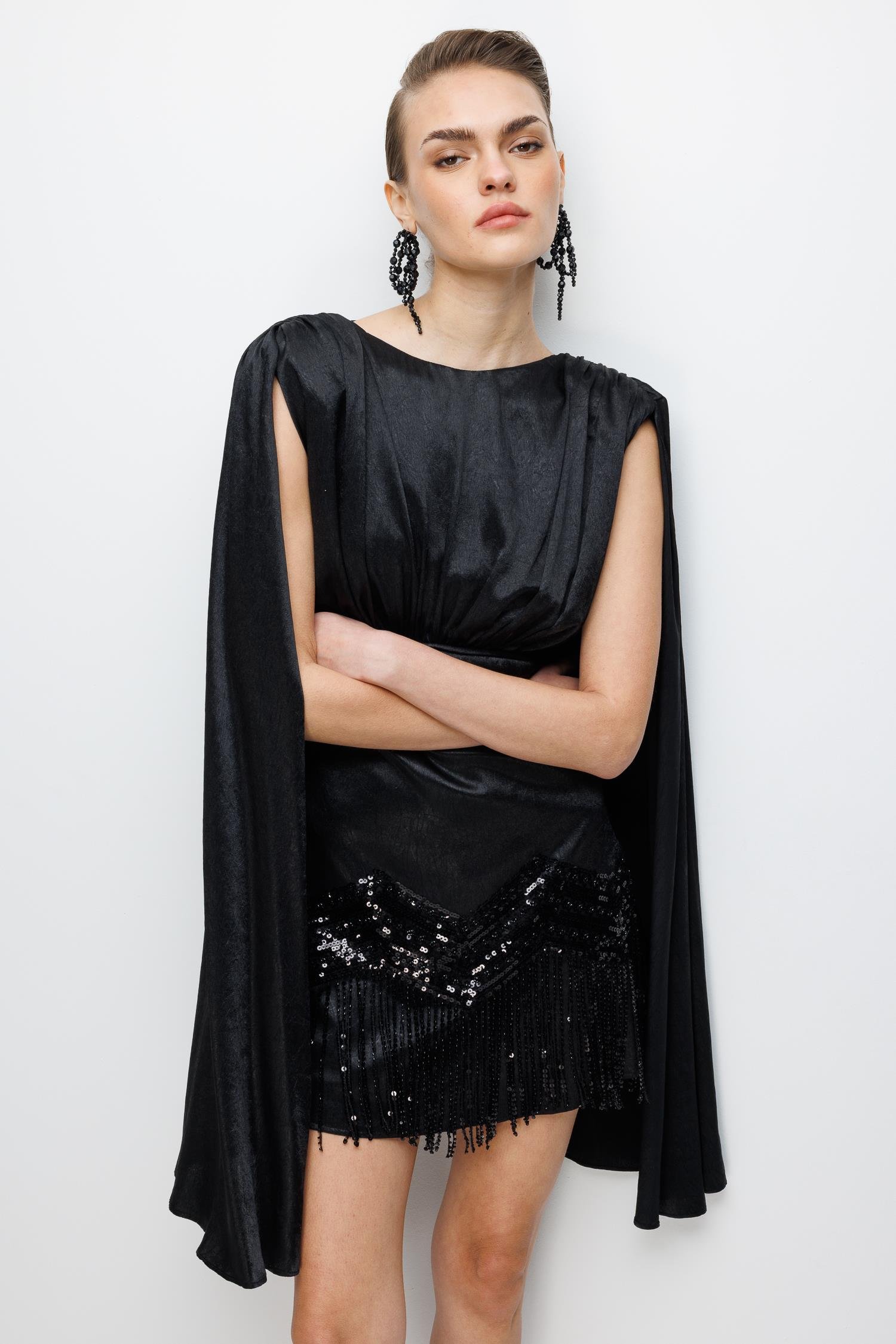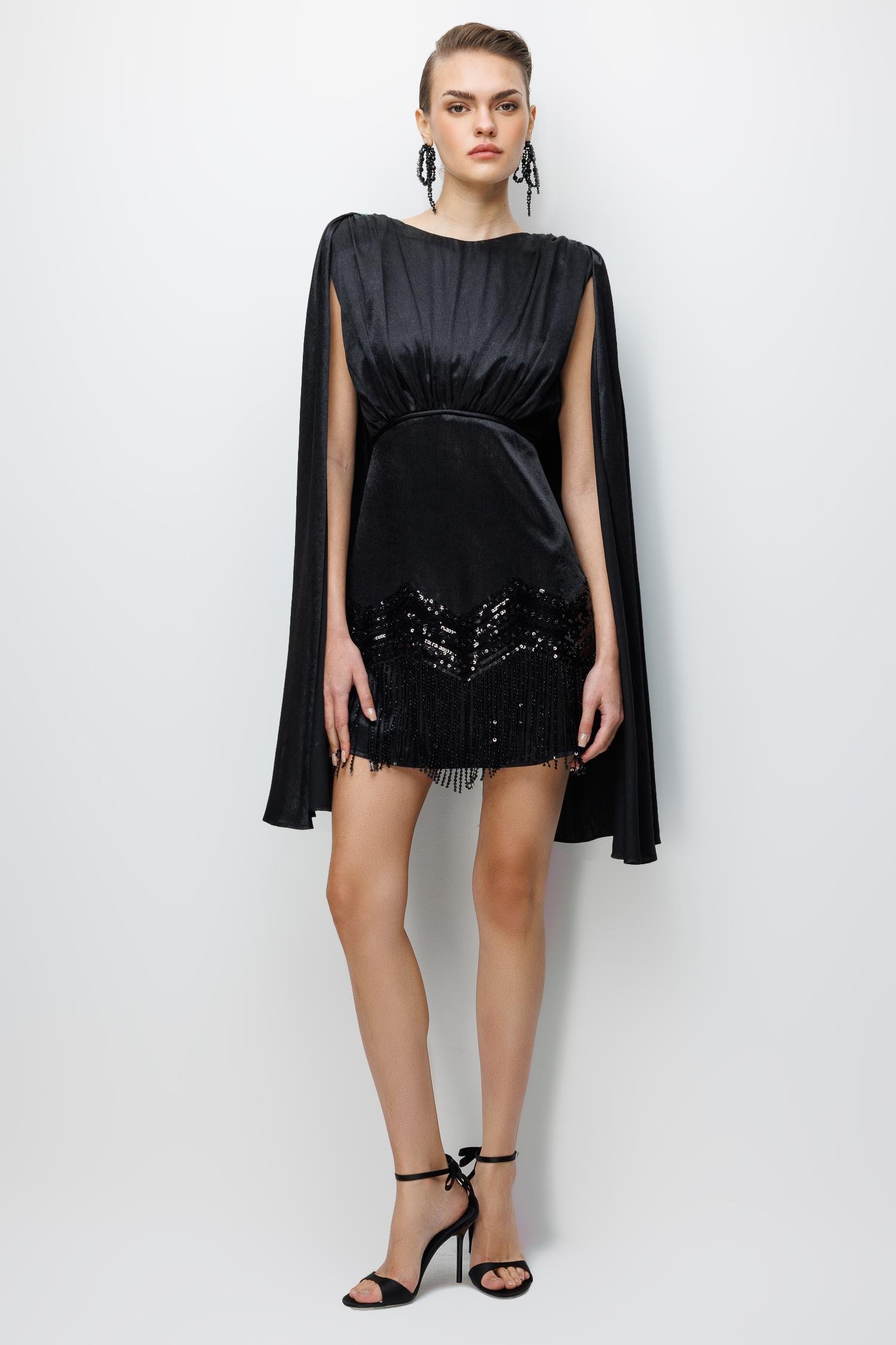 Pelerin Kol Etek Ucu İşlemeli Mini Elbise SİYAH (26KALN2332-002)